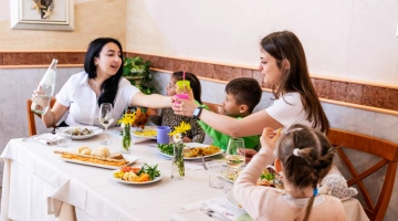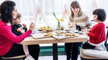 Zu den Mahlzeiten: Hochstühle am Tisch, Flaschenwärmer, Babynahrung und Babymenüs.