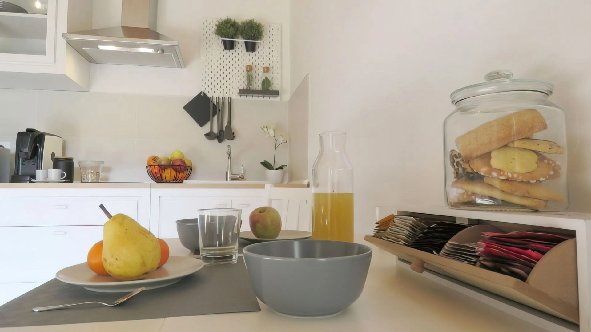 Das Frühstück umfasst eine kleine Auswahl an abgepackten Produkten, die direkt im Apartment serviert werden.