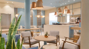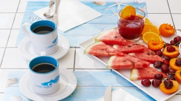 FRÜHSTÜCK: Internationales Frühstücksbuffet mit süßen und herzhaften Produkten, darunter Donuts, Kuchen, Torten, hausgemachte Waffeln und Pfannkuchen, Croissants mit Nutella. Die Auswahl an herzhaften Speisen umfasst Brot, Eier, Aufschnitt und Käse, ein Toaster steht zur Verfügung. Schließlich gibt es noch die natürliche und biologische Ecke mit frischem Joghurt, Cerealien und Müsli.
