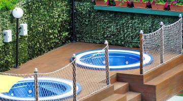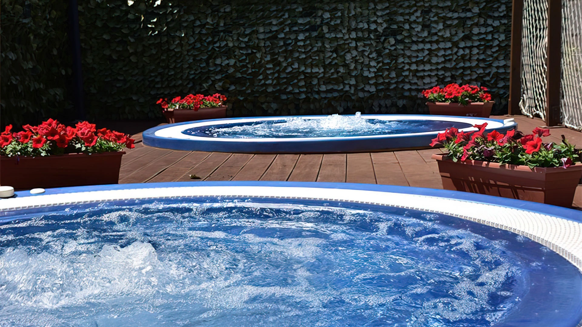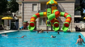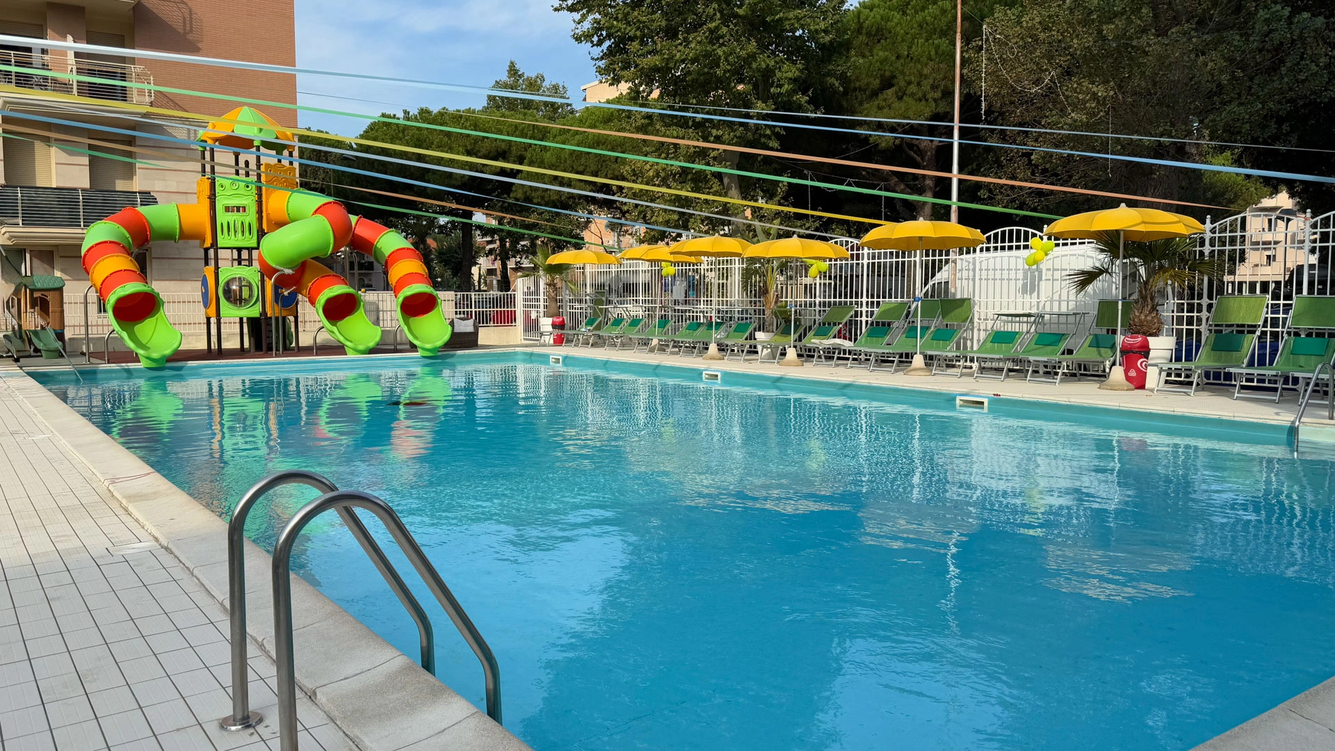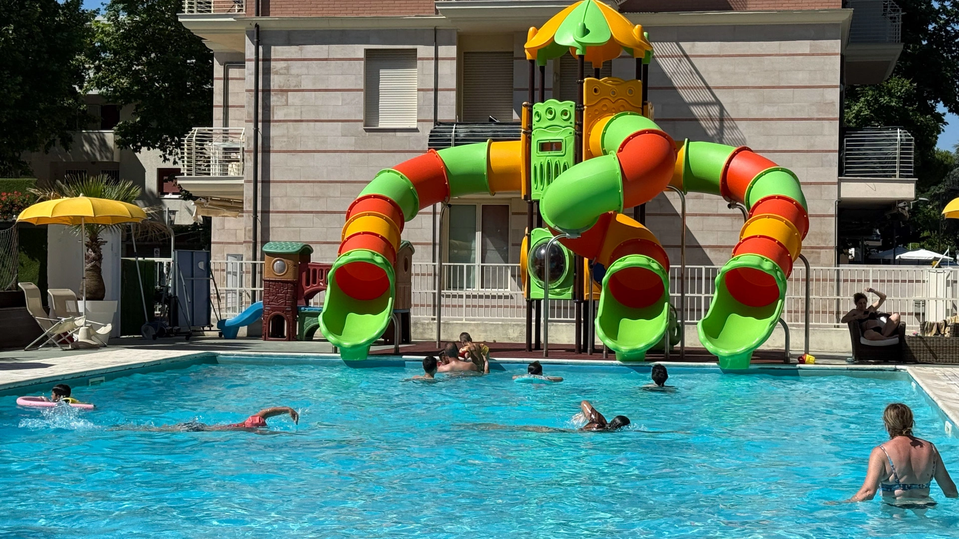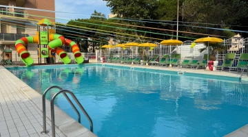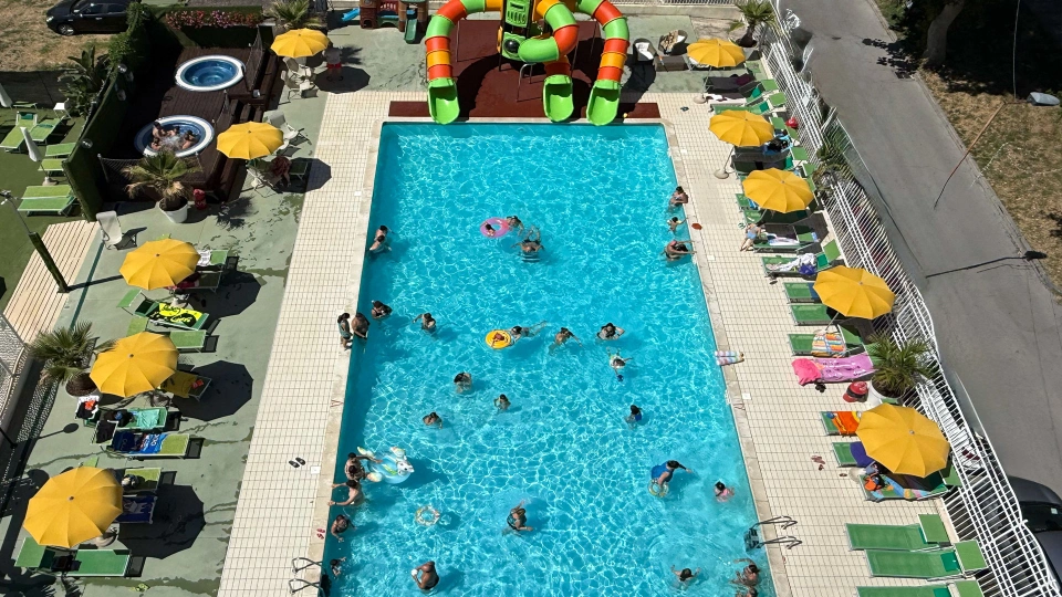 Im Garten der Struktur haben die Gäste Zugang zu einem großen Swimmingpool - 230 Quadratmeter breit - ausgestattet mit einem Hydromassagestrahl, zwei Tiefen und einer aufblasbaren Wasserrutsche. Der Solariumbereich neben dem Pool ist mit einer Bar, einem Sonnenschirm, Liegestühlen und einem Spielplatz mit Trampolin ausgestattet. Möglichkeit auch abends zu schwimmen. Es gibt auch zwei Hydromassagewannen mit Meerwasser.