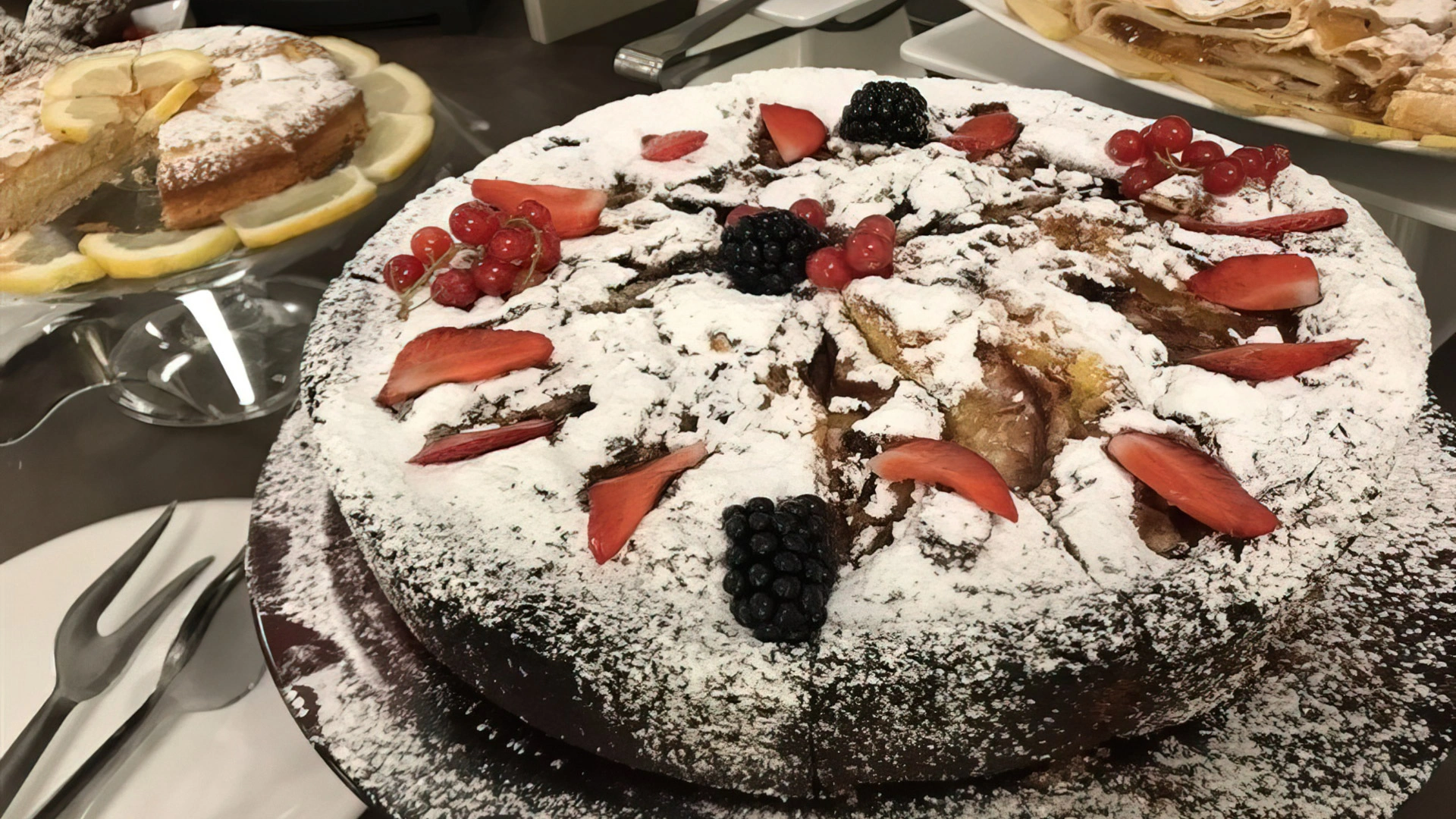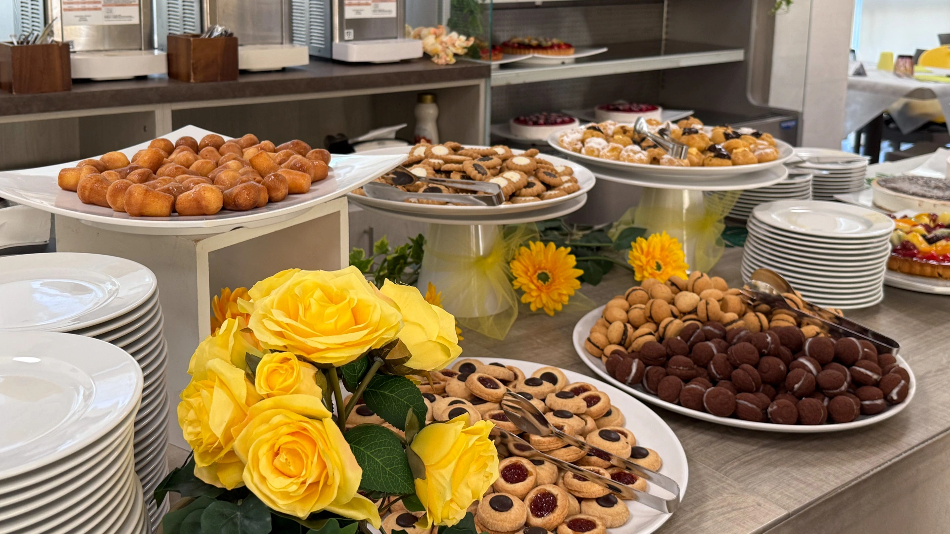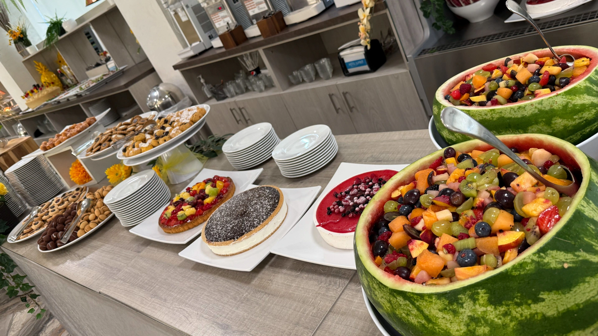 FRÜHSTÜCK: süßes und herzhaftes Buffet mit Süßigkeiten, Croissants, Joghurt, Kuchen, Müsli, Obst, Käse und Aufschnitt