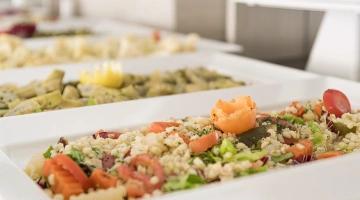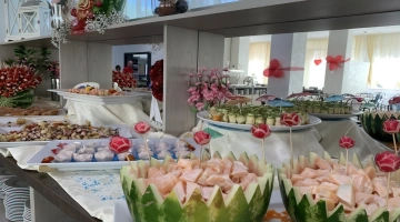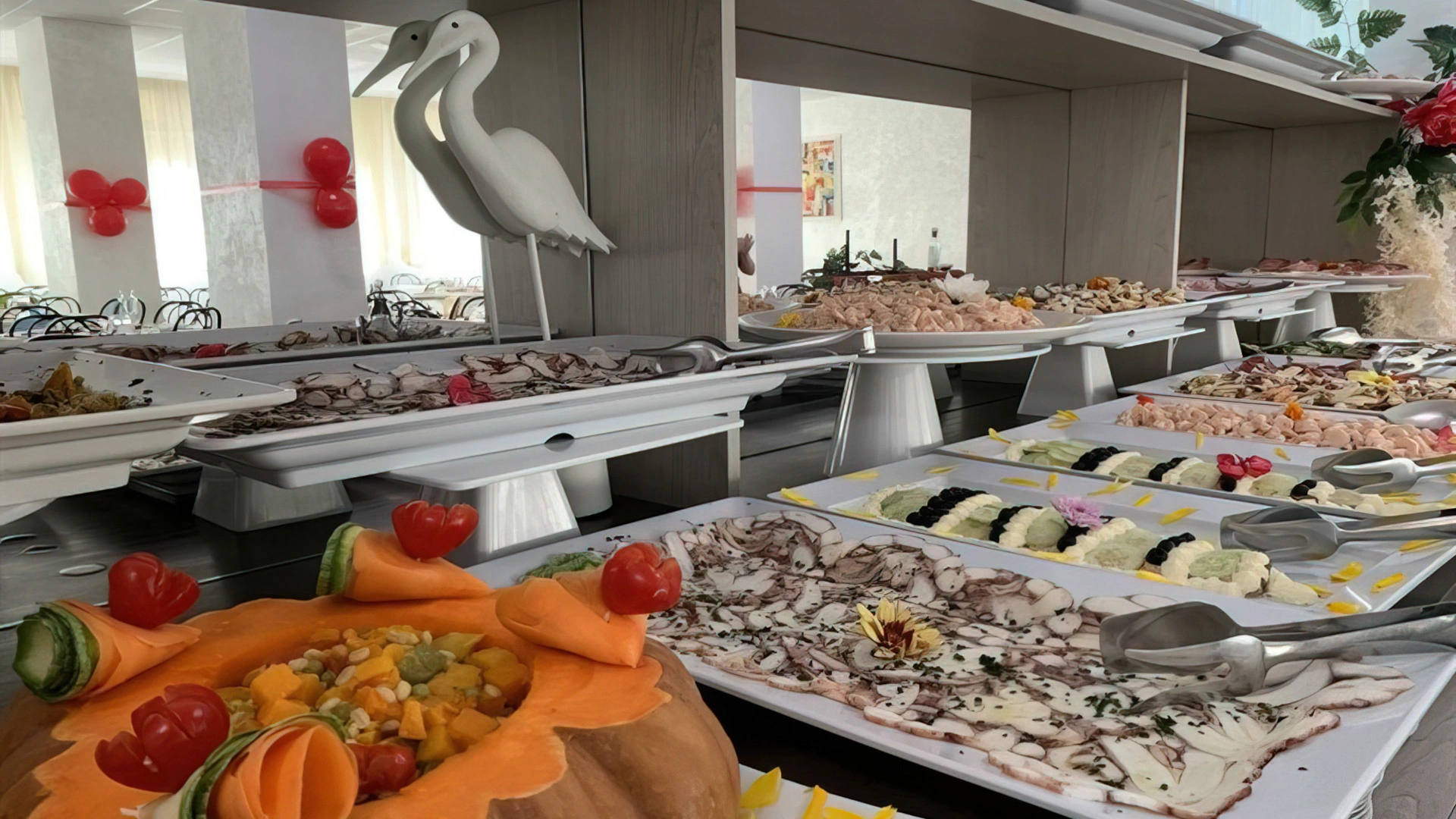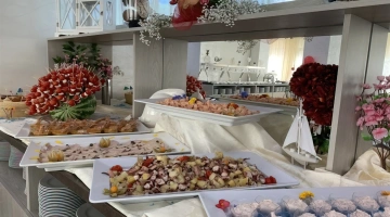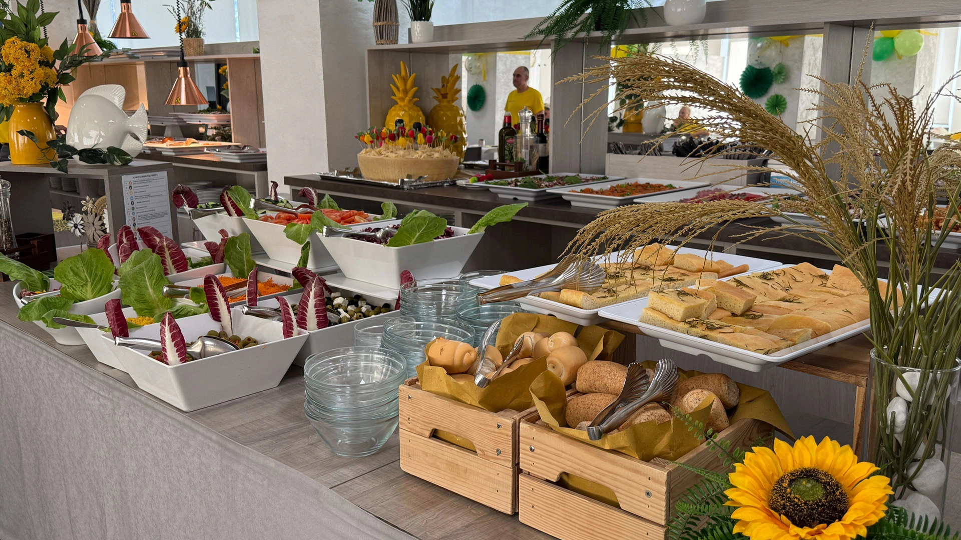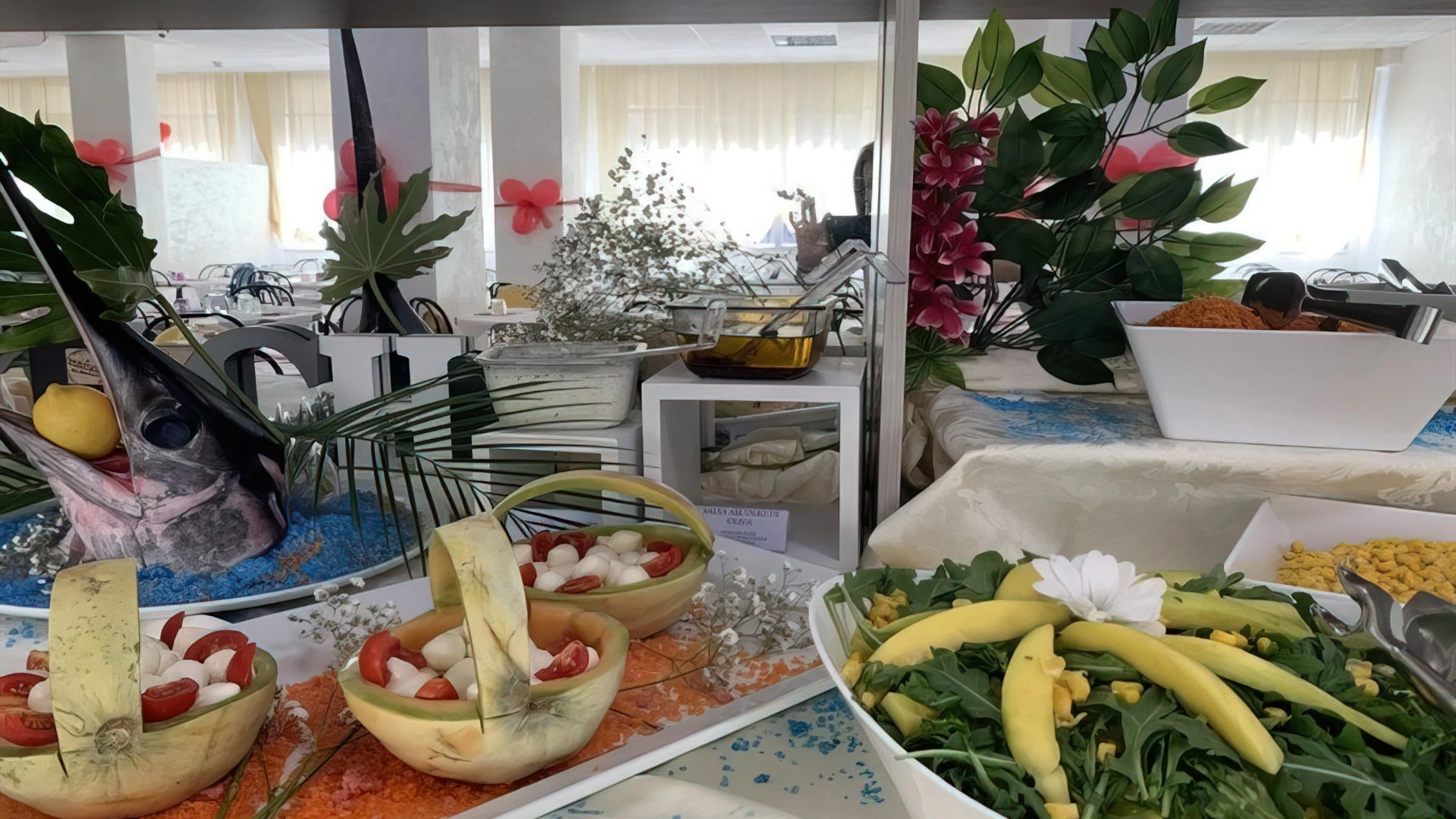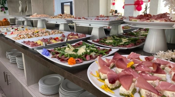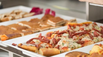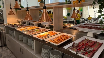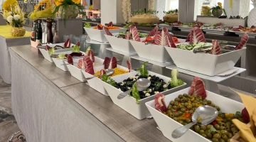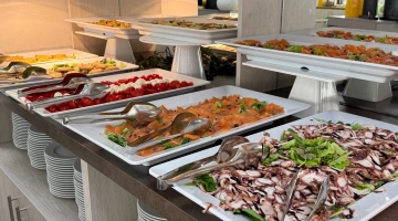 MITTAGESSEN UND ABENDESSEN: Buffets mit Fleisch- und Fischgerichten, Vorspeisen, Beilagen und Vorspeisen, hausgemachte Desserts.