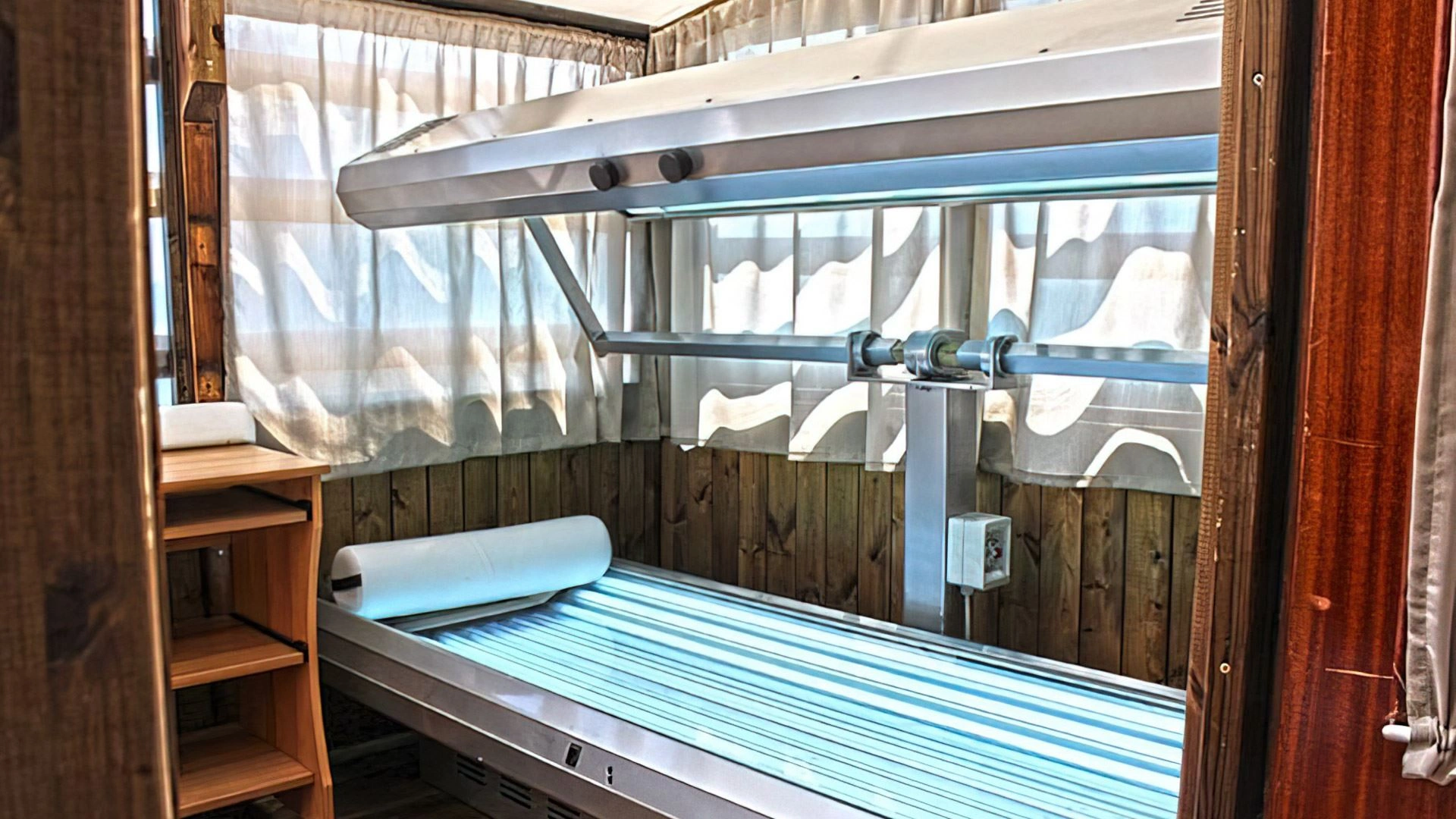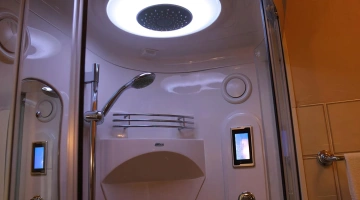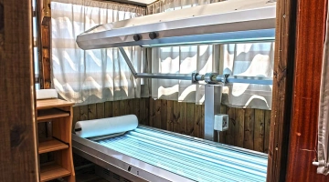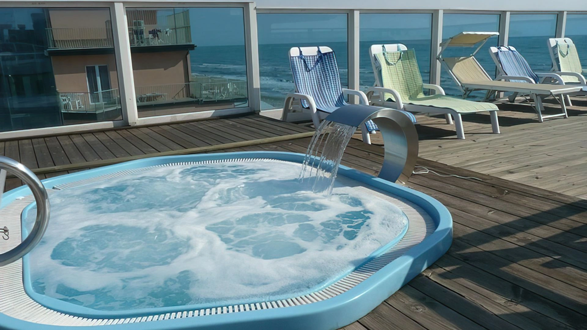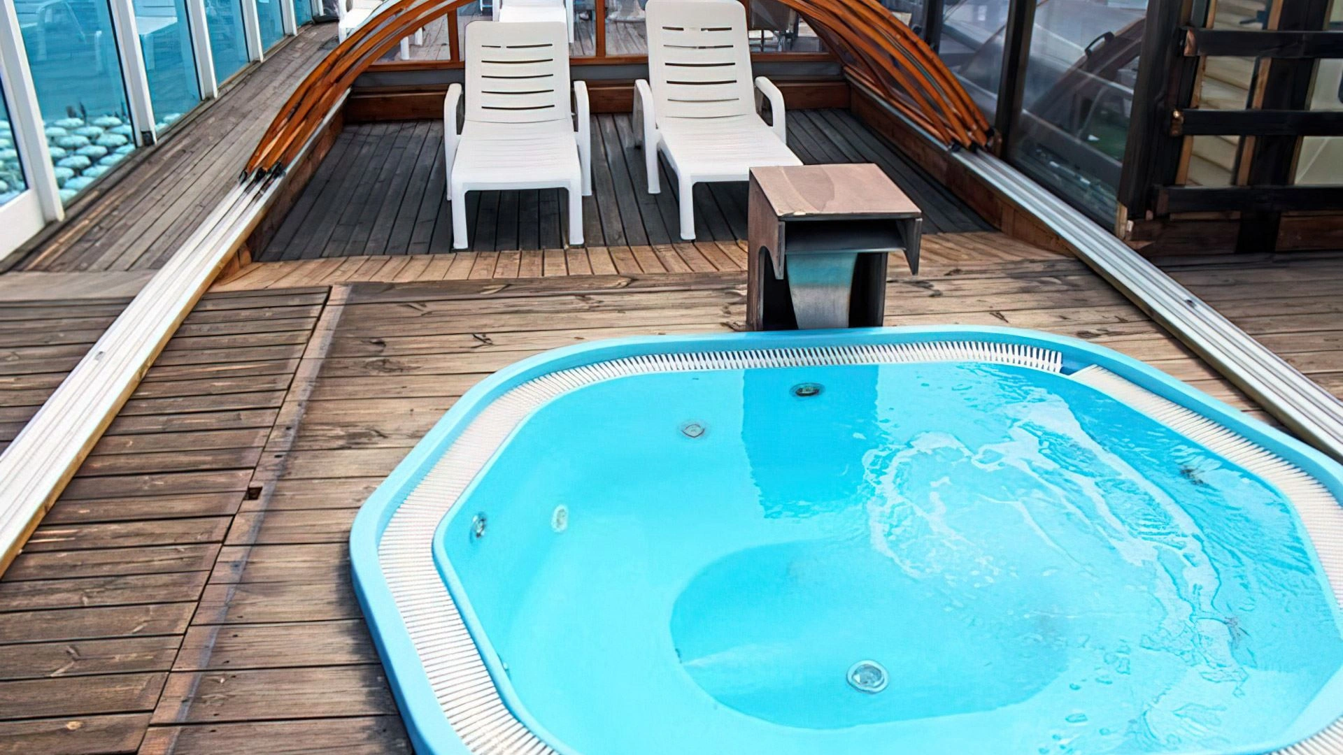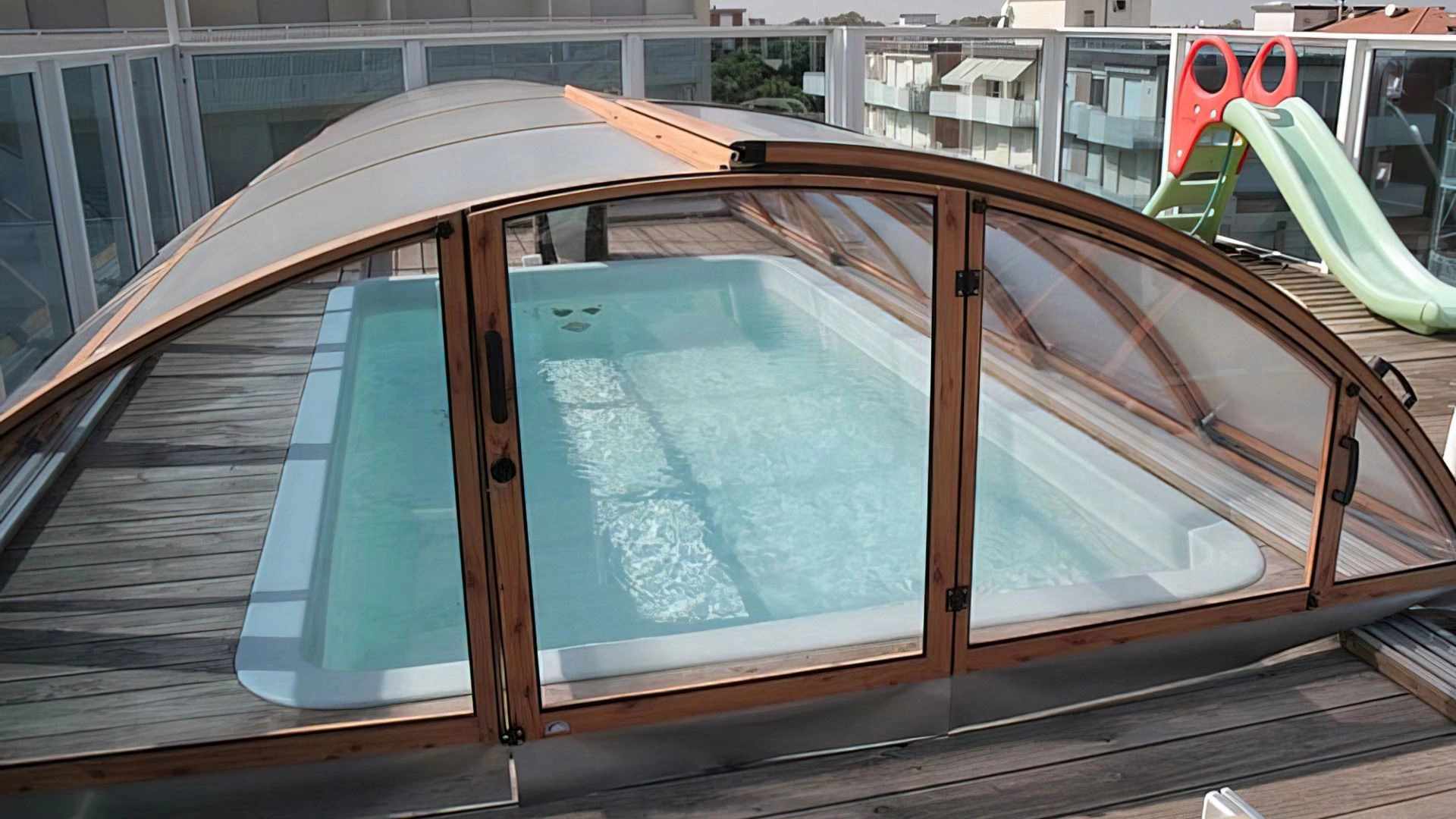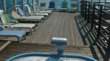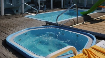 Der Swimmingpool und der Whirlpool befinden sich auf der Panoramaterrasse der Unterkunft. Das Schwimmbad, das bei schlechtem Wetter abgedeckt werden kann, ist mit beheiztem Wasser, Gegenstromschwimmen, 2 Tretbooten und einer Rutsche ausgestattet. Neben dem Pool befindet sich eine Whirlpool-Hydromassagewanne, die mit einem Wasserblatt zur Nackenmassage ausgestattet ist. Es gibt auch einen Solariumbereich mit Sonnenliegen.