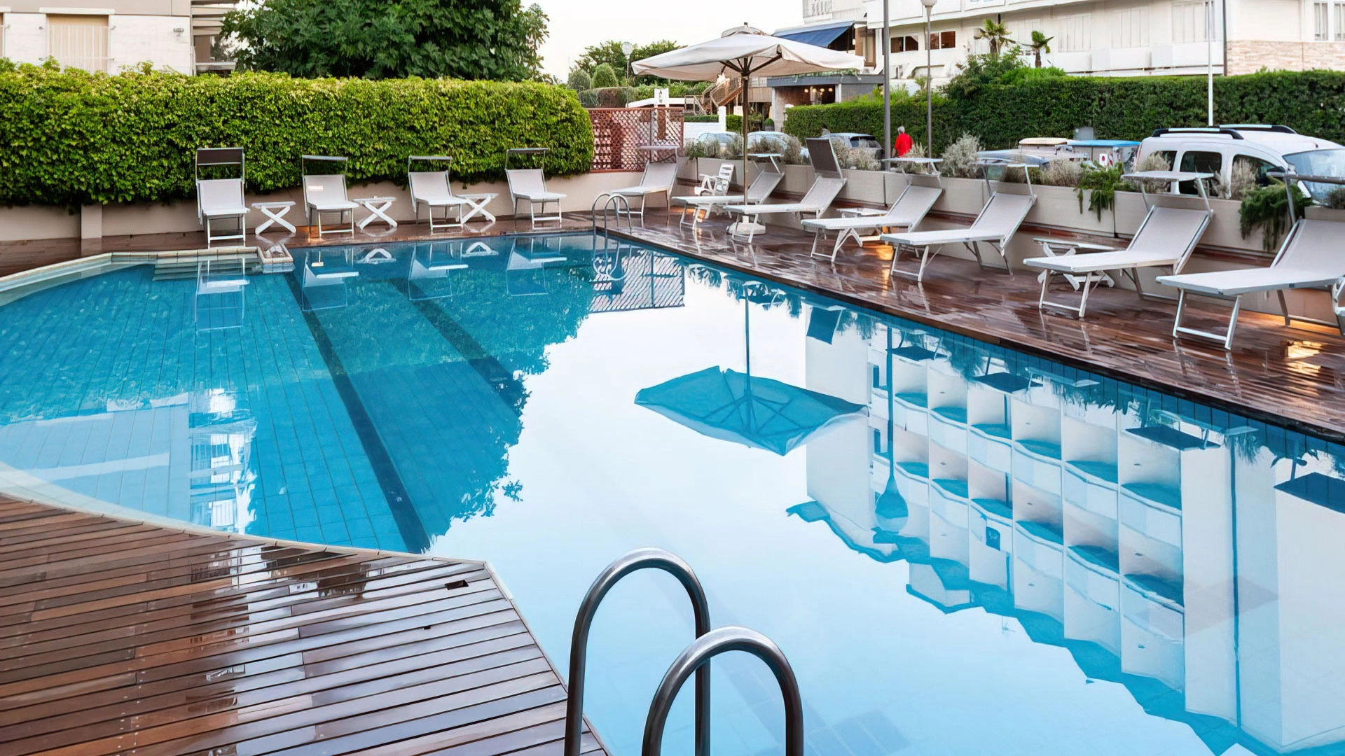 Der Swimmingpool befindet sich im Garten, ist 90 m² groß, 140 cm tief und von einem Solarium mit Sonnenschirmen und Liegestühlen umgeben.