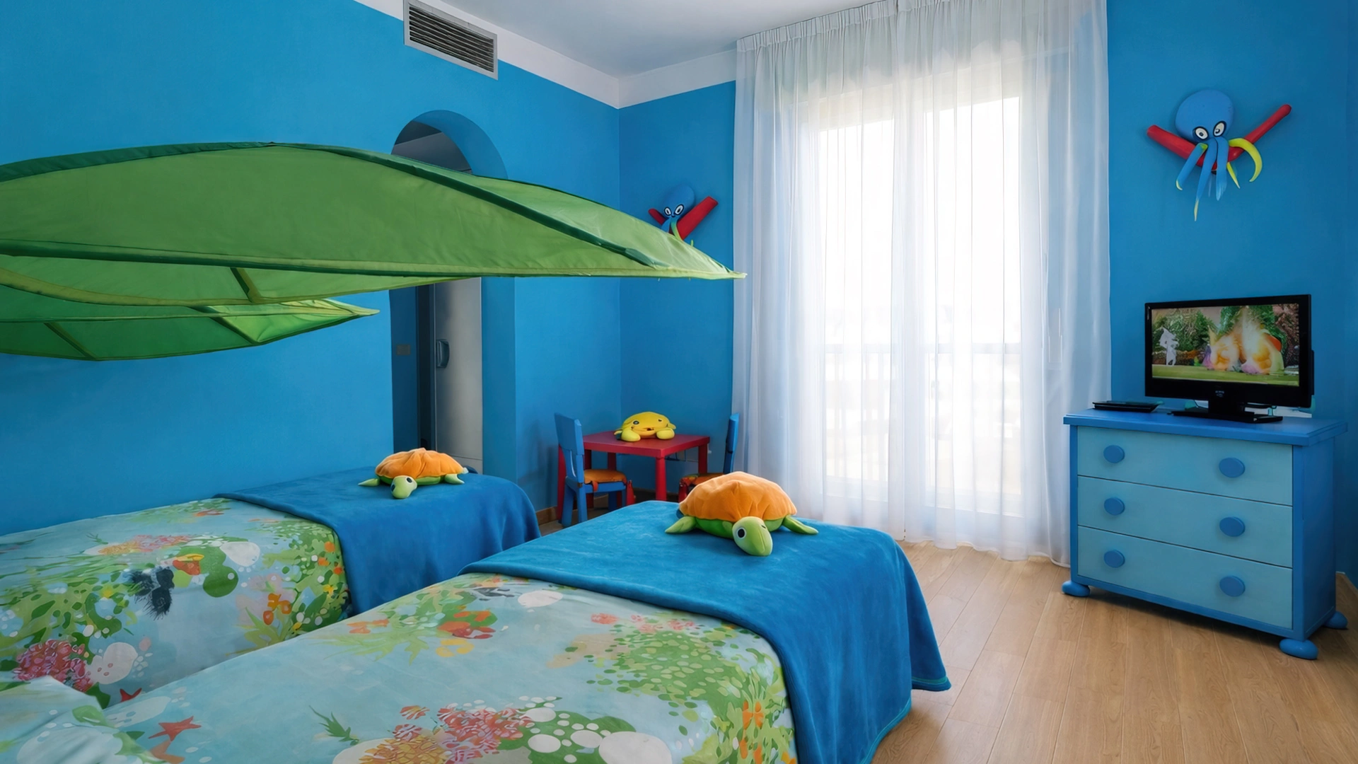 CARTOON-ZIMMER 422: 2 Zimmer mit Verbindungstür im Erdgeschoss, mit 22-Zoll-LCD-TV, Minibar, Safe und Haartrockner.