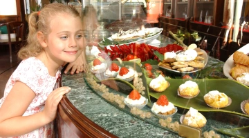 Zu den Mahlzeiten: Babymenü, Babynahrung, Hochstühle, Nachmittagssnack. Animation während der Mahlzeiten.