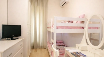 FAMILIENSUITE 105: 2 Zimmer mit Verbindungstür, 2 Balkone mit Poolblick, Minibar, individuell regulierbare Klimaanlage, 32-Zoll-TV, 22-Zoll-TV im Kinderzimmer, digitaler Safe, separate Terrasse mit Wäscheständer, zweigeteiltes Badezimmer.