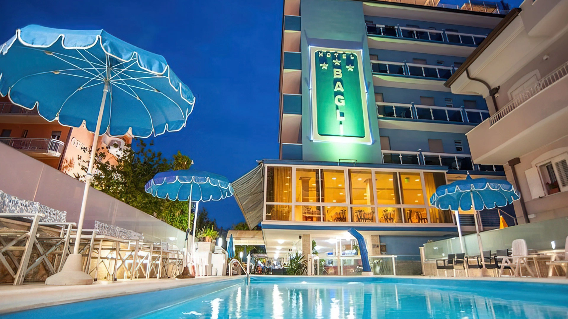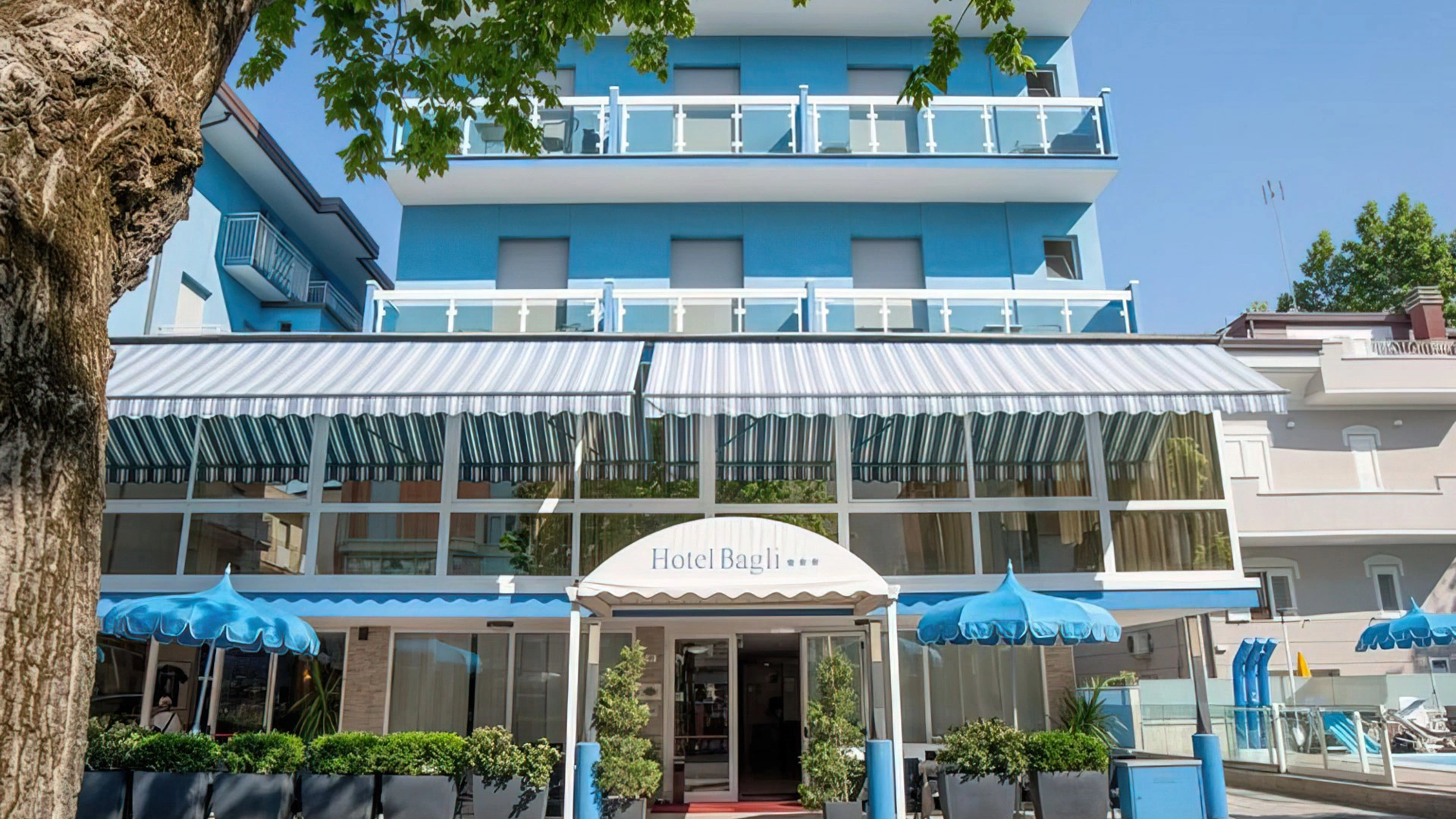Das 3-Sterne- Hotel Bagli in Rivazzurra di Rimini ist ein komfortables und elegantes Gebäude mit angenehmen Gemeinschaftsräumen, Swimmingpool, Whirlpool mit beheiztem Wasser, Dienstleistungen für Radfahrer und Kinder, Zimmern mit Balkon und WLAN-Verbindung in allen Zimmern. Haustiere erlaubt.