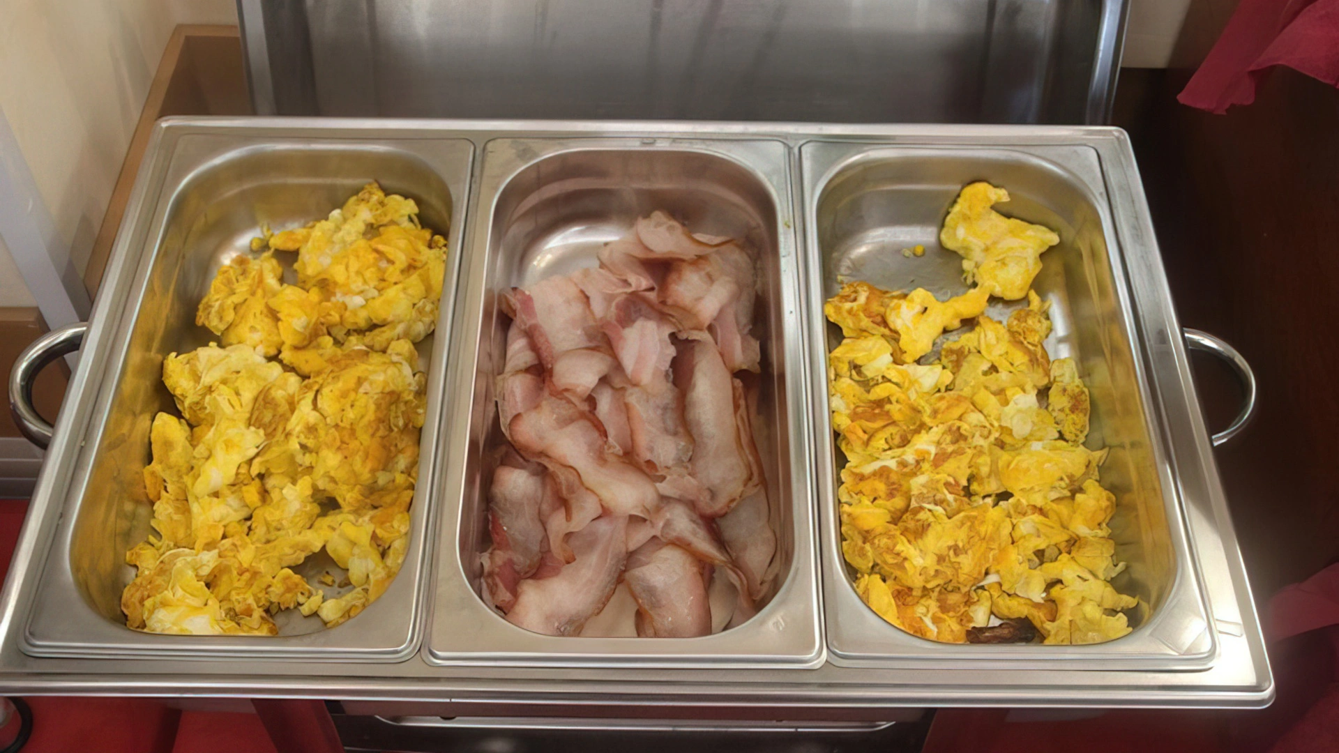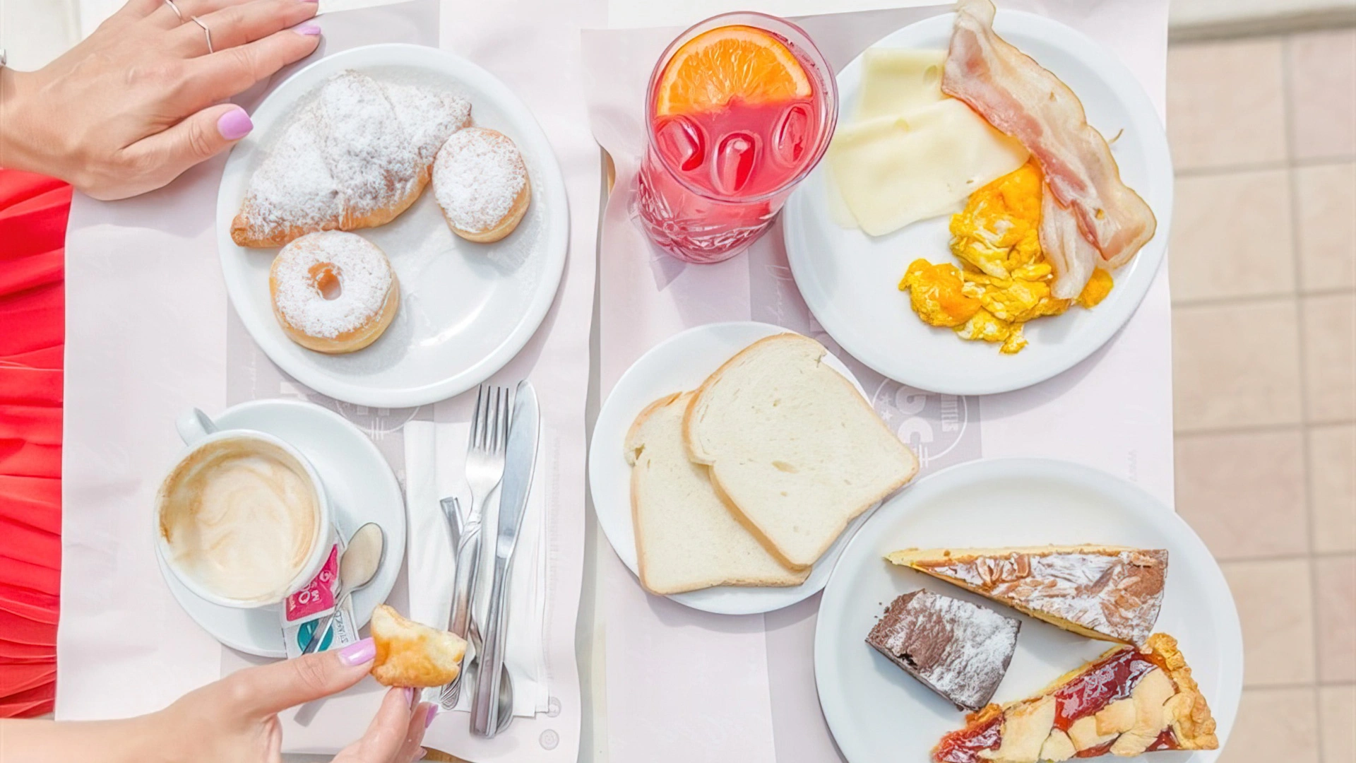 FRÜHSTÜCK: Internationales Frühstücksbuffet mit frischen Desserts, Ringkuchen, Croissants, Brot, Marmelade, Eiern, Speck, Käse, Joghurt, Obst, Müsli, Kaffeegetränken.