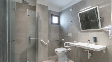DIENSTLEISTUNGEN FÜR BEHINDERTE: Eingang im Erdgeschoss mit geneigter Rampe, geräumiges Zimmer mit Hilfsmitteln, Dusche mit Stuhl und Duschstuhl erreichbar.