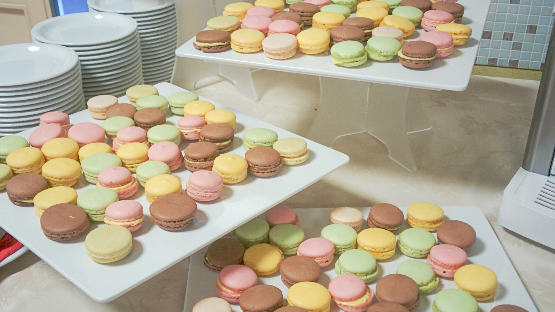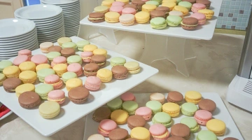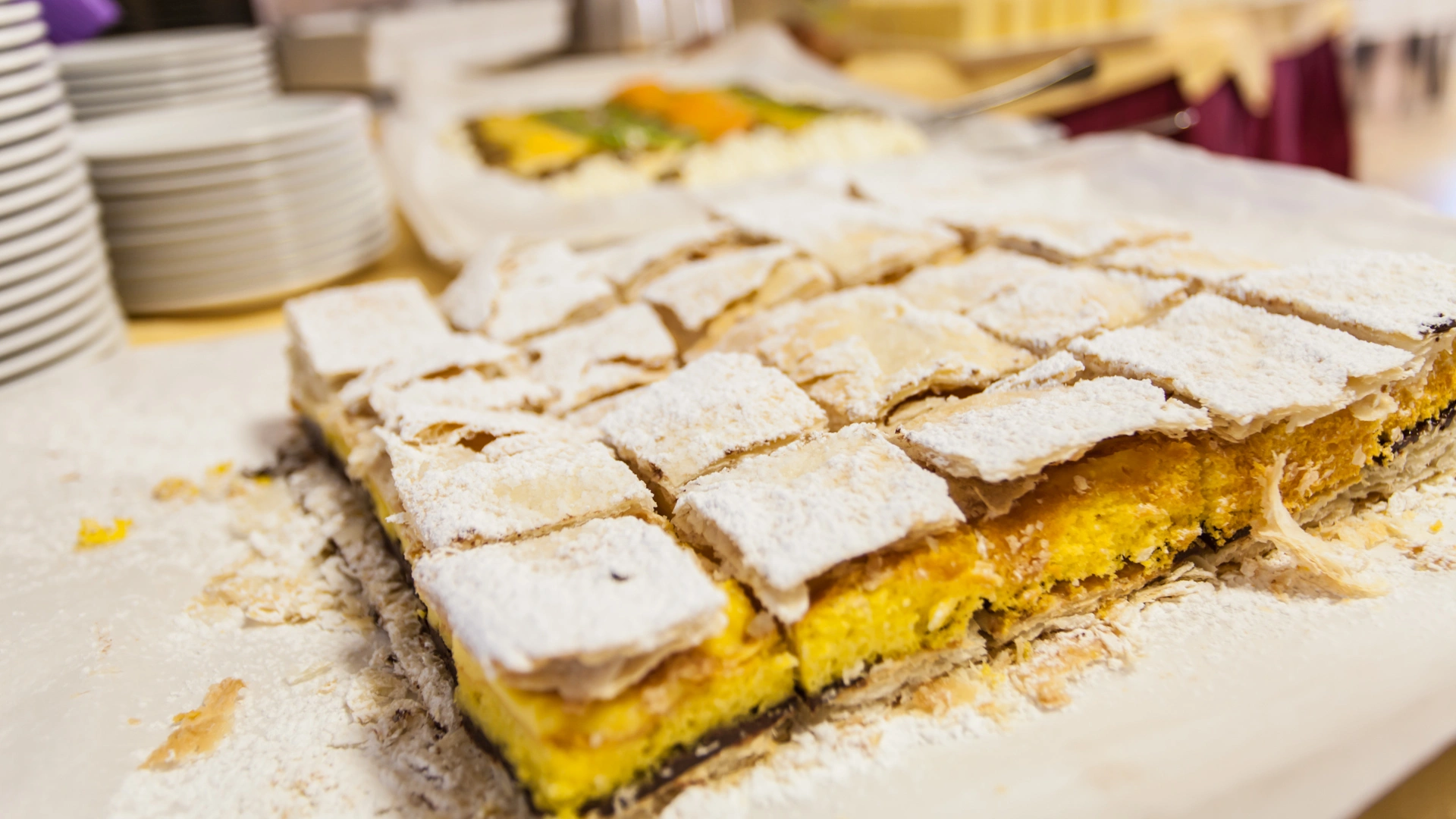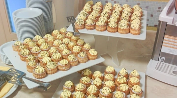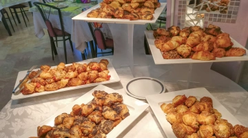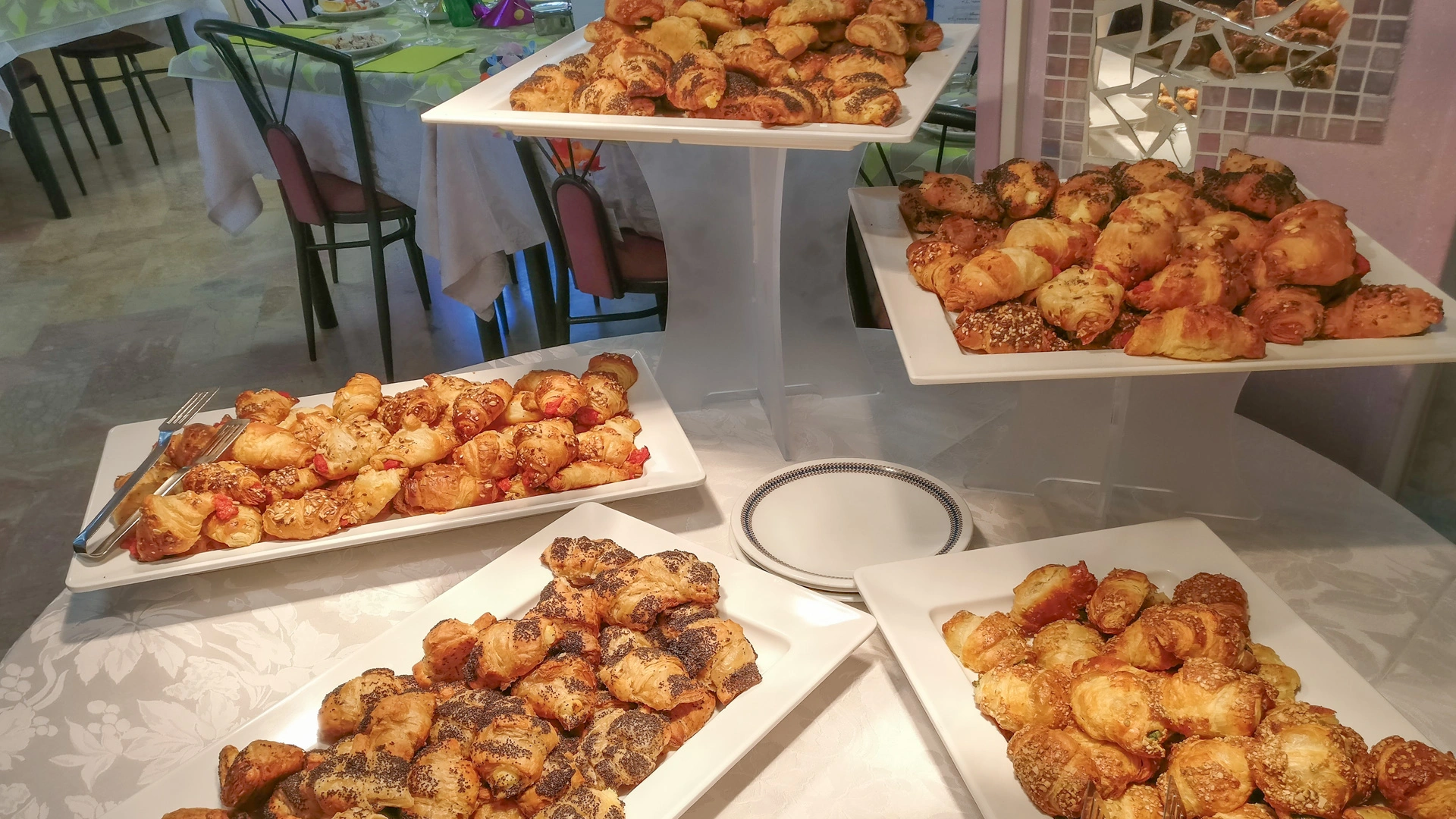 FRÜHSTÜCK: Buffet mit Croissants, Brot, Keksen, Joghurt, Fruchtsäften und Kaffeegetränken.