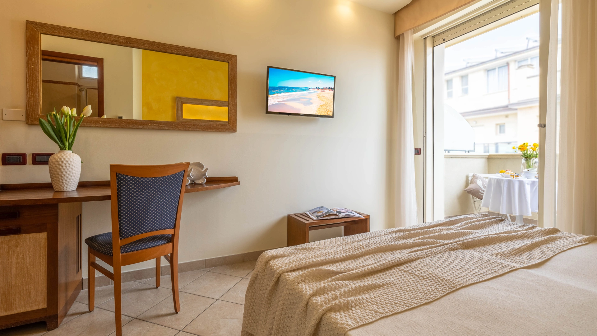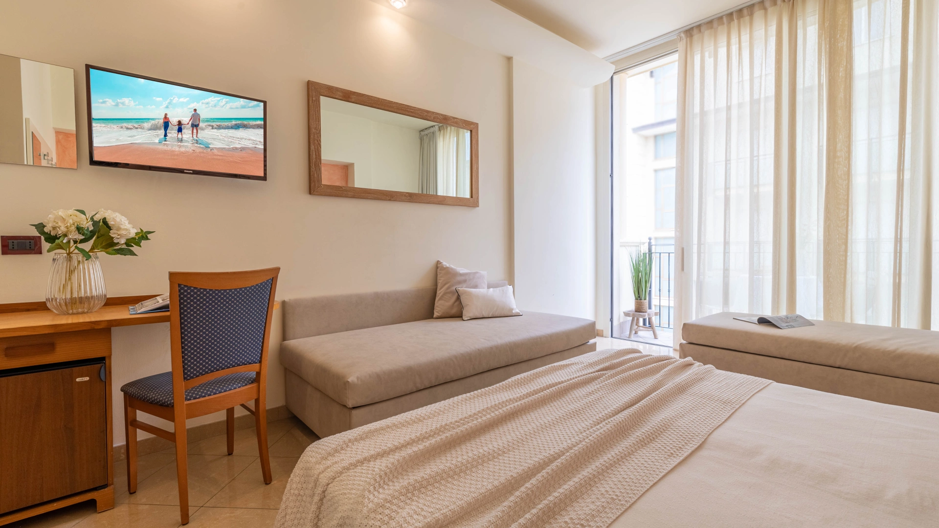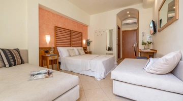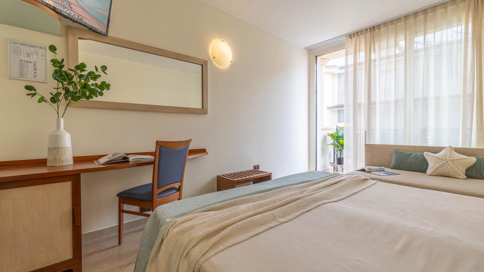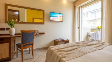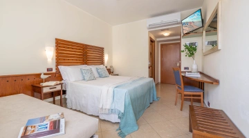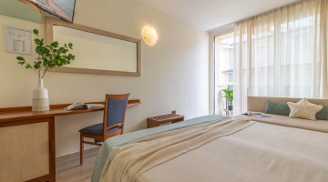 Die Zimmer werden mit einer Karte geöffnet und sind ausgestattet mit: Balkon, individuell regulierbarer Klimaanlage, Flachbild-Sat-TV, Safe, Kühlschrank, Direktwahltelefon, 200-Mbit/s-Glasfaser-WLAN, eigenem Bad mit Duschkabine und Haartrockner. Frühstück im Zimmer auf Anfrage, gegen Aufpreis.