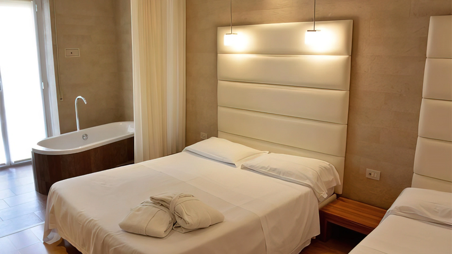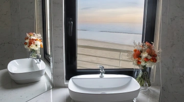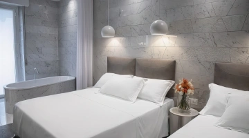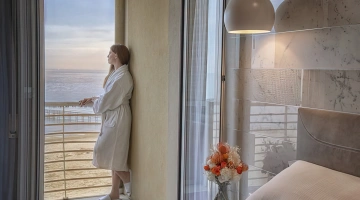 PRESTIGE: moderner, luxuriöser Stil, Badewanne im Zimmer, Balkon mit Meerblick, Bademantel und Hausschuhe, Frühstück im Zimmer möglich.