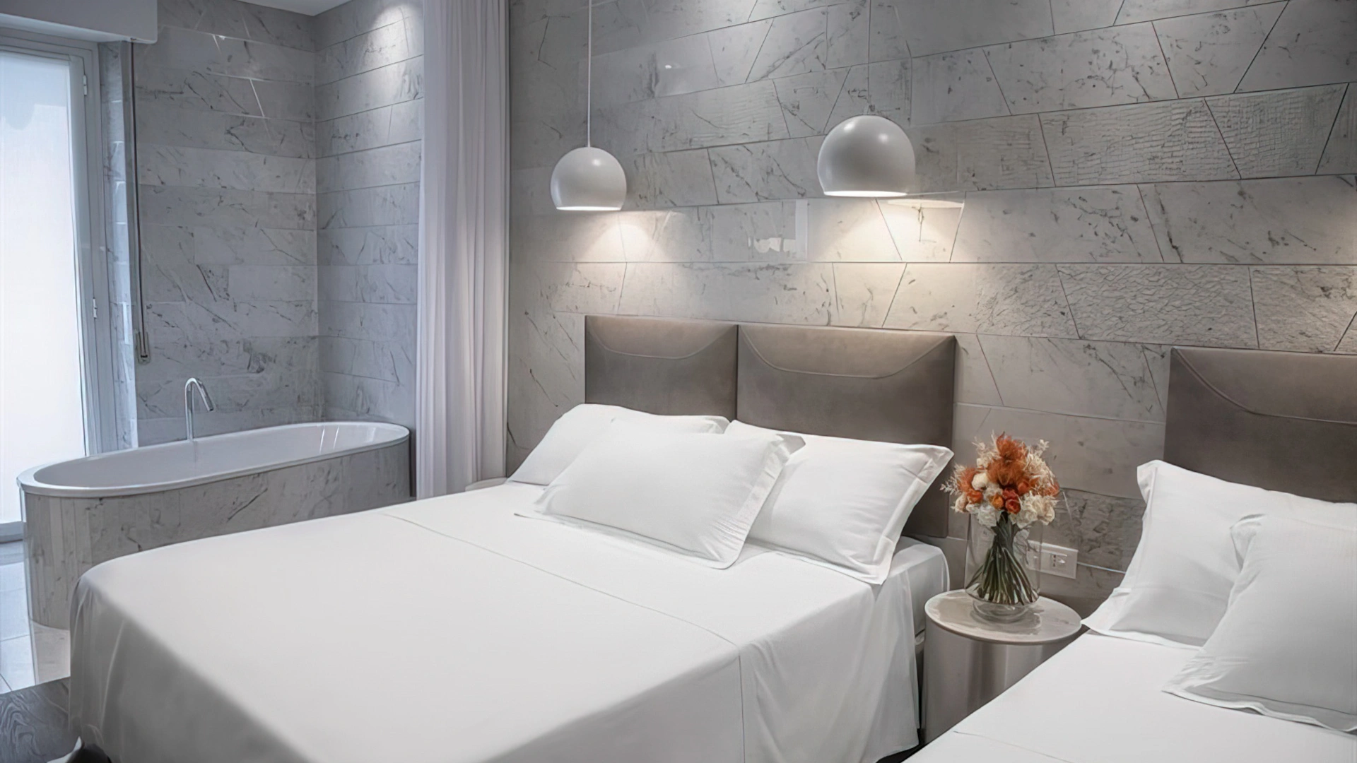TECH: Designmöbel, freistehende Badewanne im Zimmer, Meerblick-Balkon auf Anfrage, digitale Zeitungsstände, Bademantel.