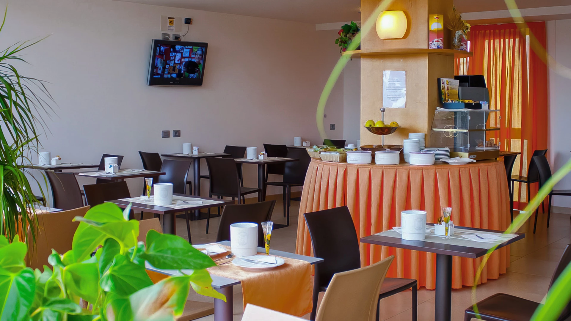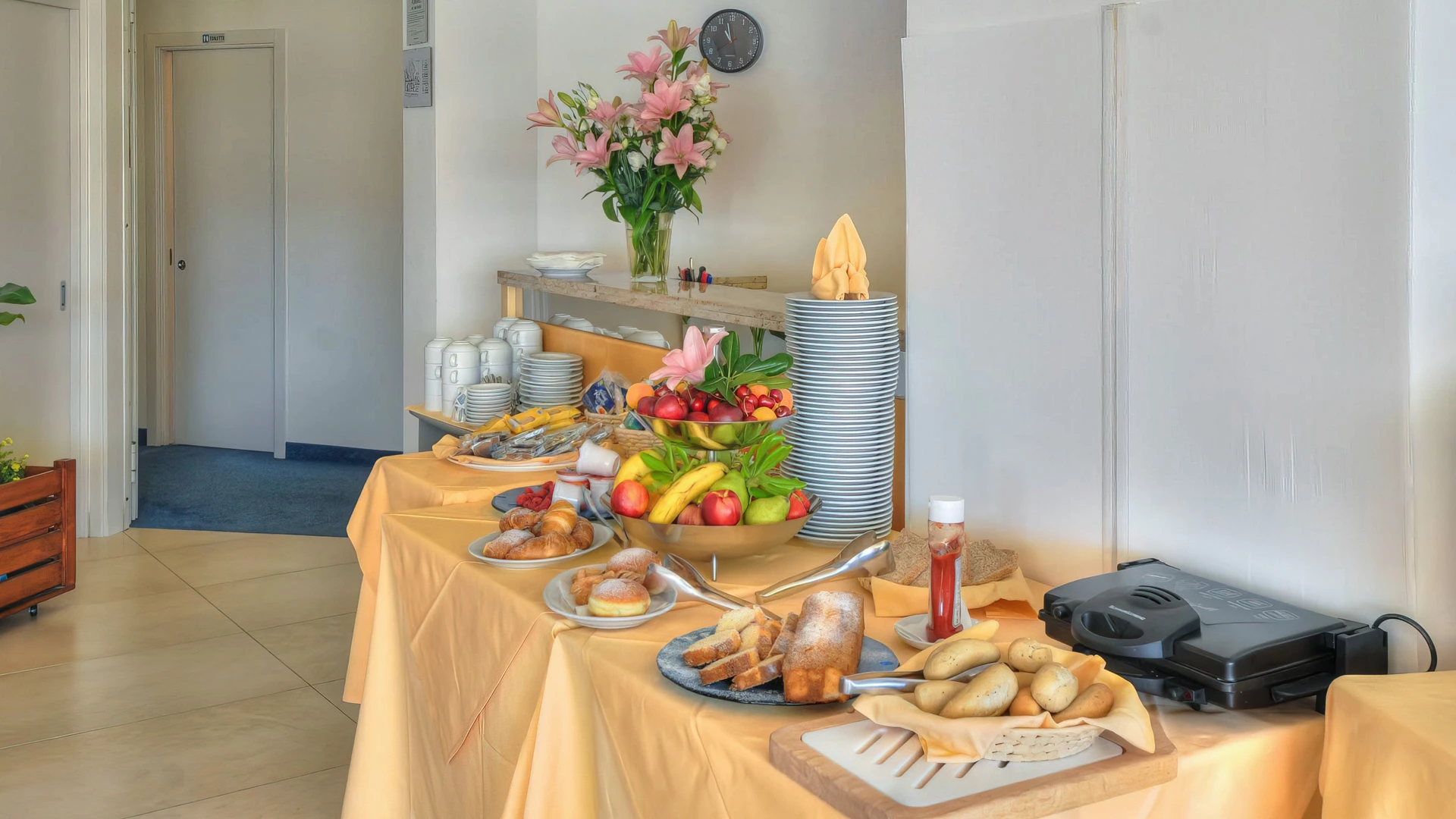 Das Frühstück wird auf der Terrasse serviert und bietet süße und herzhafte Speisen in Buffetform.