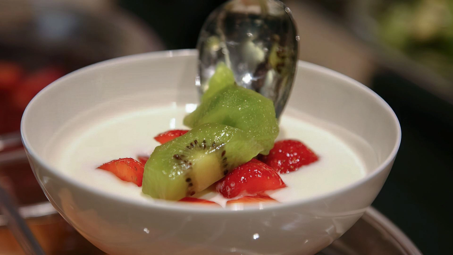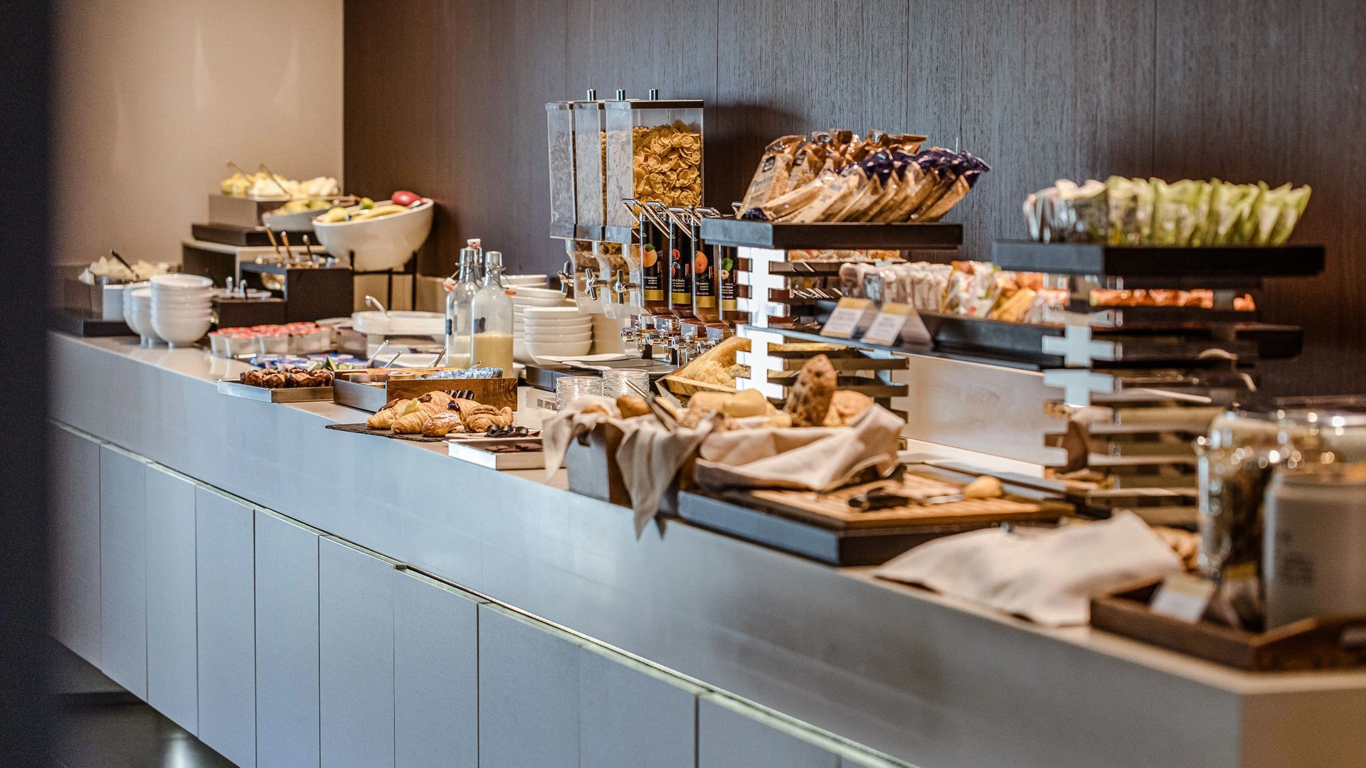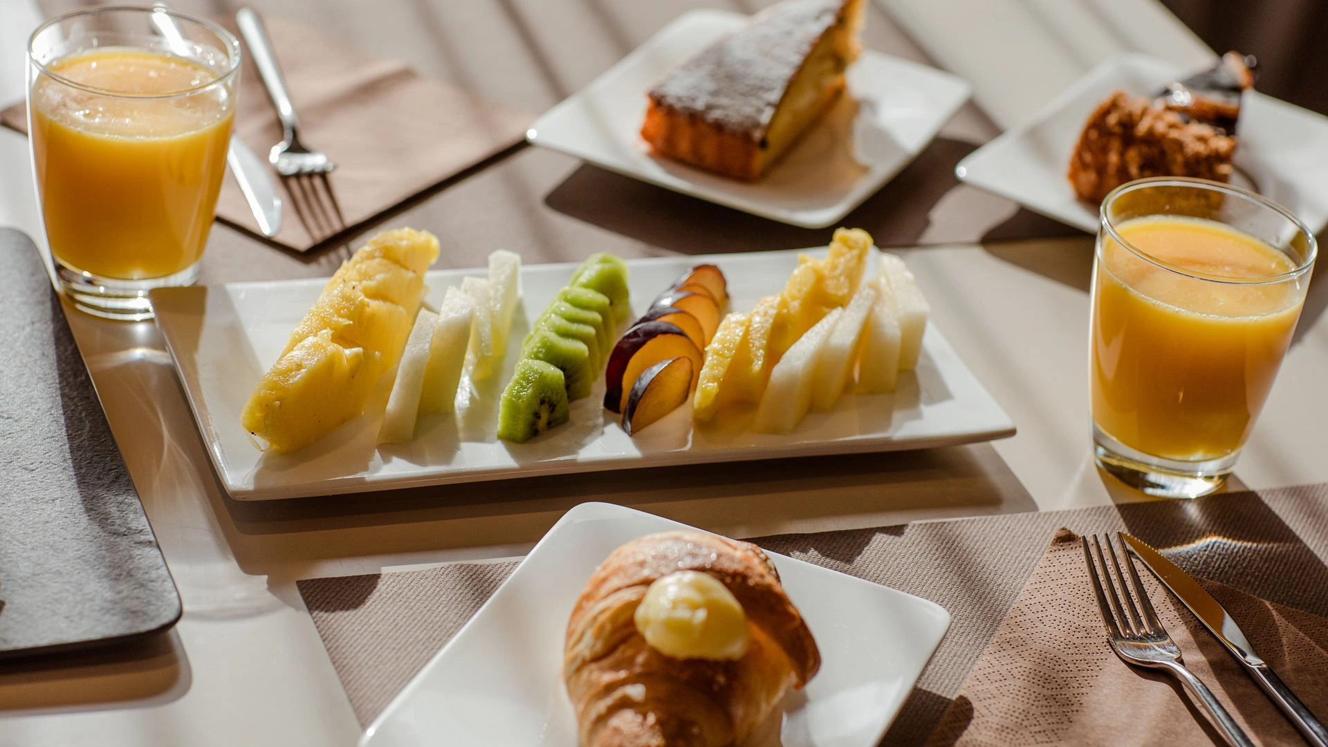 Das Frühstück ist ein Buffet und bietet biologische, vegane, kalorienarme und Zöliakie-freundliche Produkte, sowohl süß als auch herzhaft, begleitet von heißen und kalten Getränken.