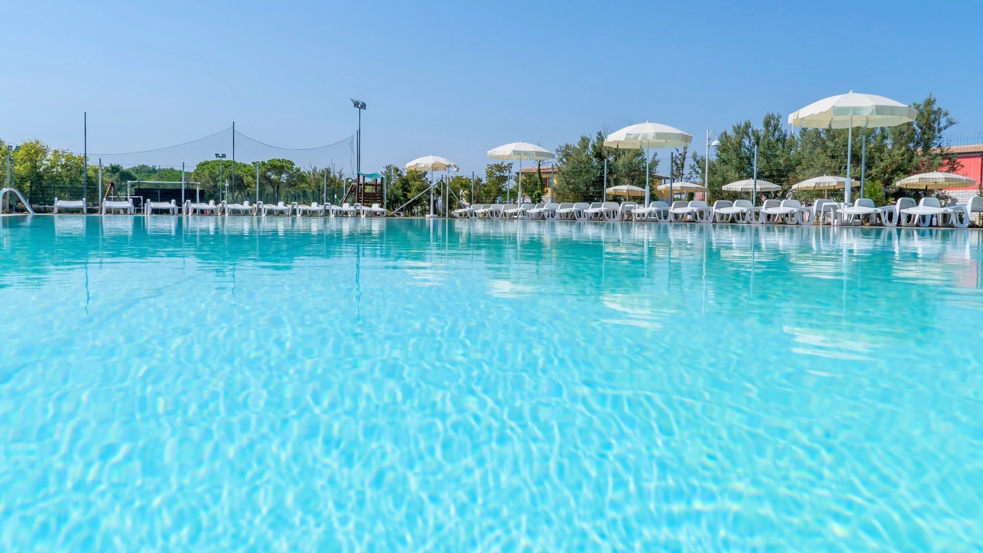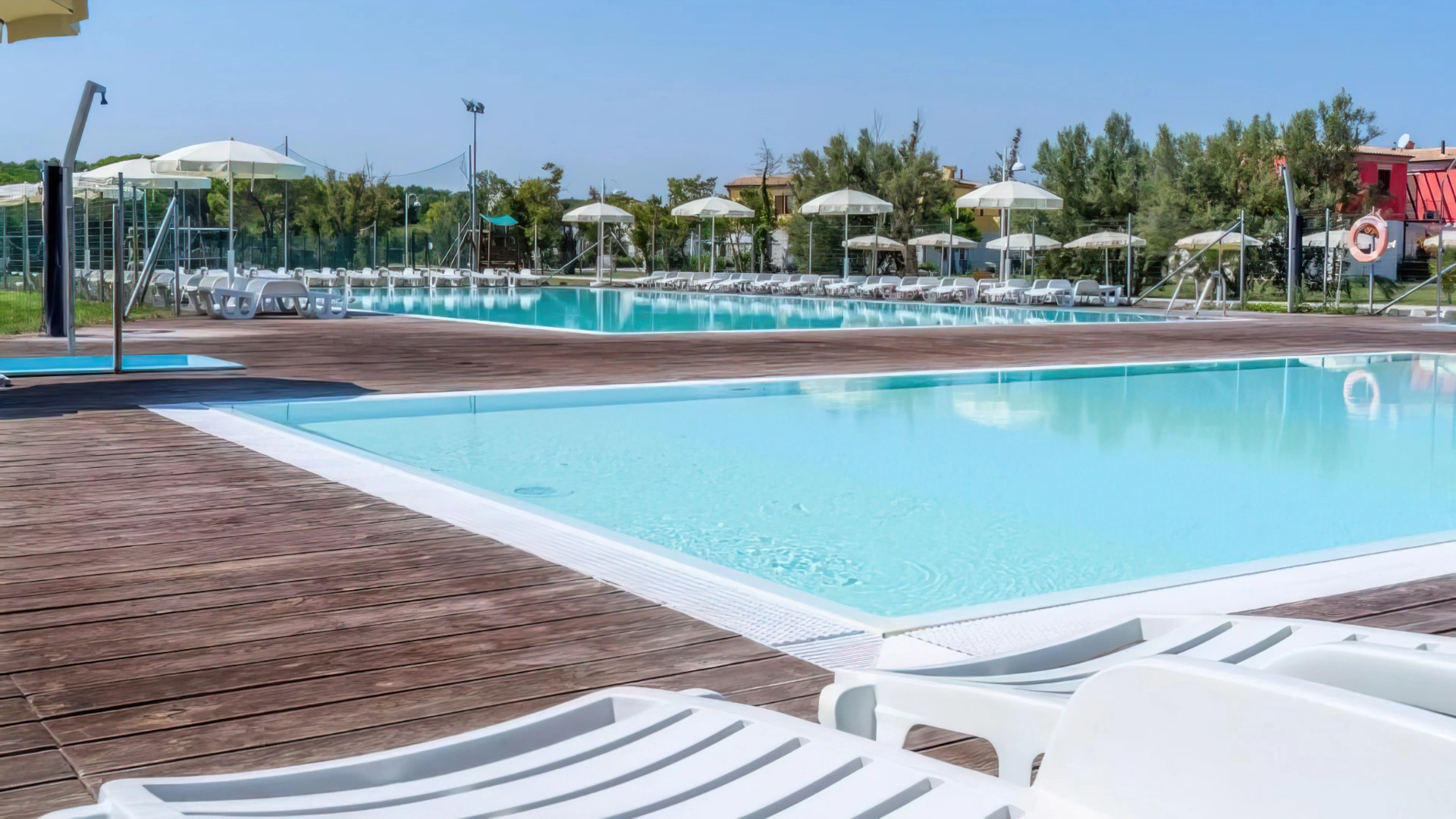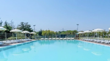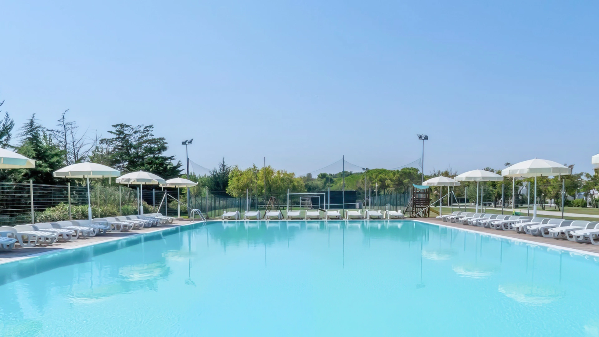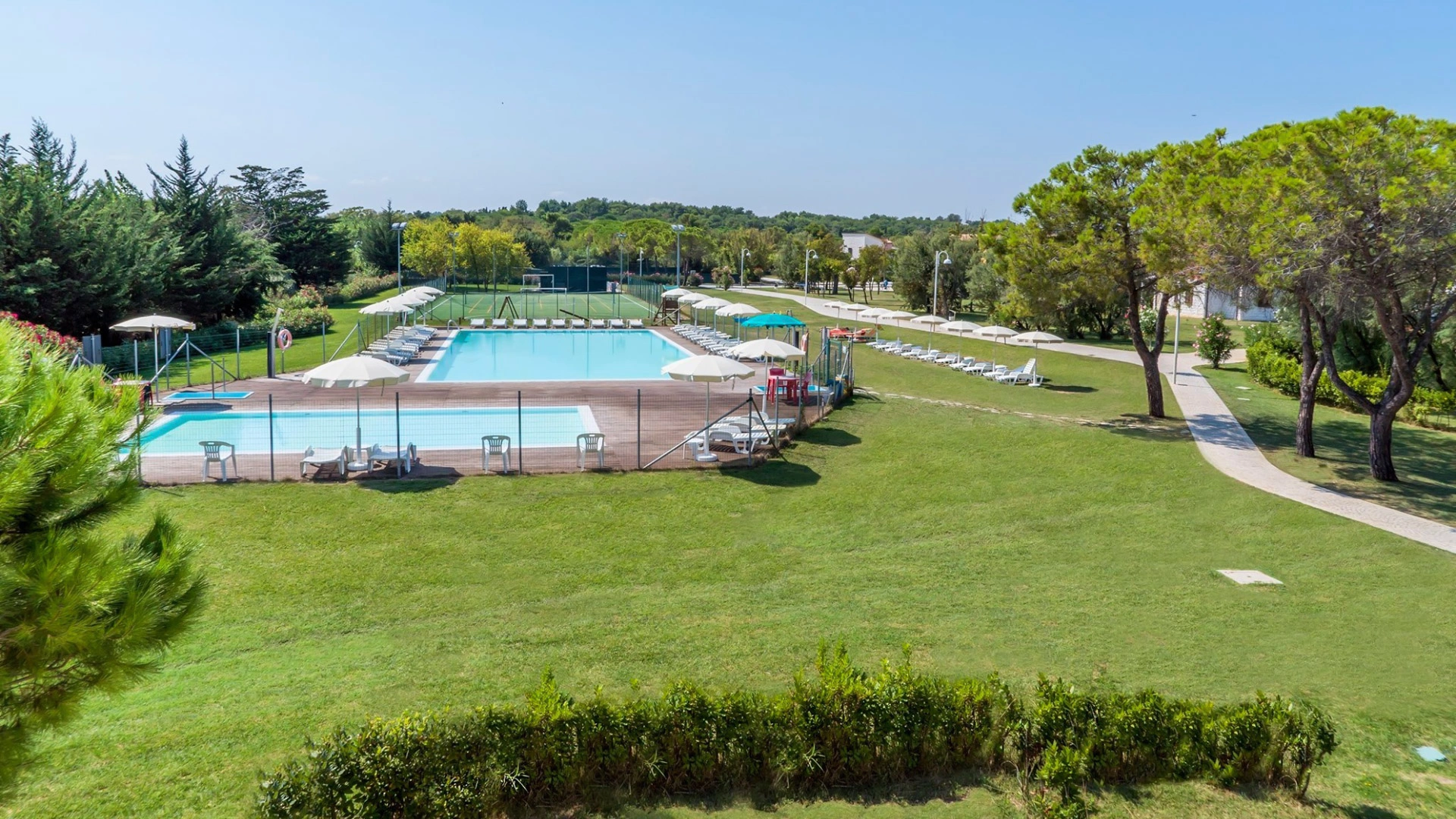 Im Garten gibt es zwei saisonale Swimmingpools, einen für Erwachsene und einen für Kinder, umgeben von einer großen Solariumfläche. Die Nutzung ist kostenlos und exklusiv für Gäste der Anlage.