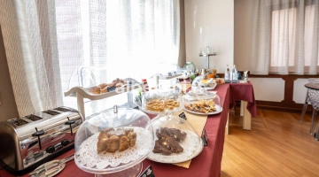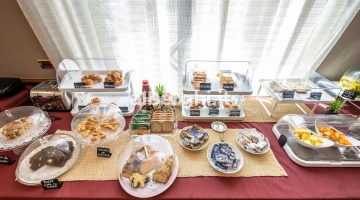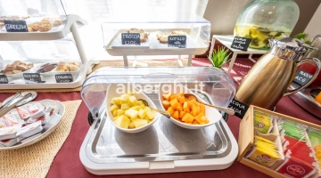 Das süße und herzhafte Frühstücksbuffet wird im Frühstücksraum oder auf Wunsch auch auf dem Zimmer serviert.
