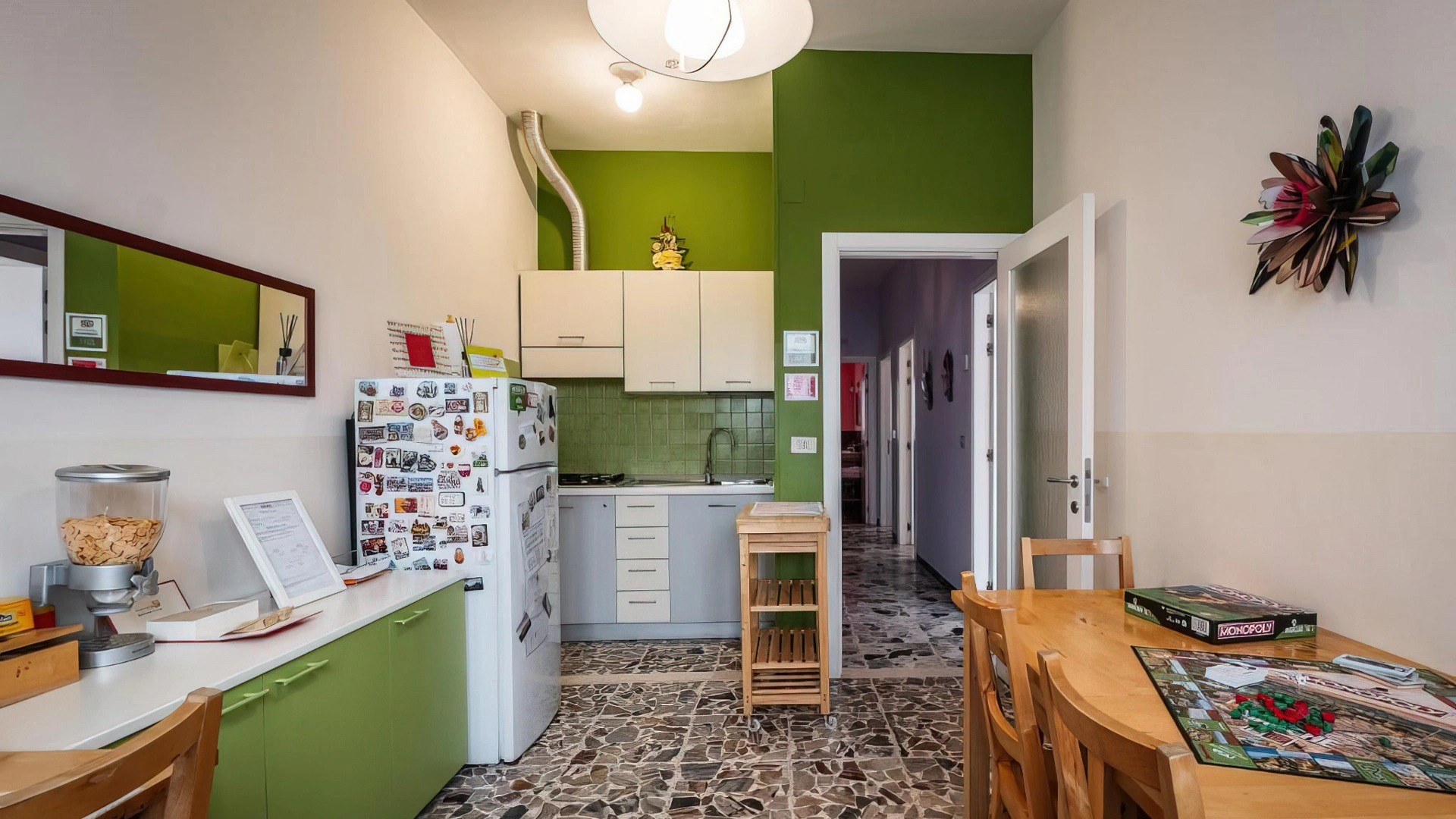 Das im Aufenthaltspreis enthaltene italienische Frühstück umfasst unter anderem typische hausgemachte Süßigkeiten aus den Marken, Bio-Obst der Saison, Säfte, Tee und Kaffee. Glutenfreie und vegane Optionen sind auf Anfrage erhältlich. Die Gemeinschaftsküche steht den Gästen den ganzen Tag über mit Speisen und Getränken zur Verfügung. Für Mittag- und Abendessen besteht die Möglichkeit, Vereinbarungen mit Restaurants in der Umgebung zu nutzen.