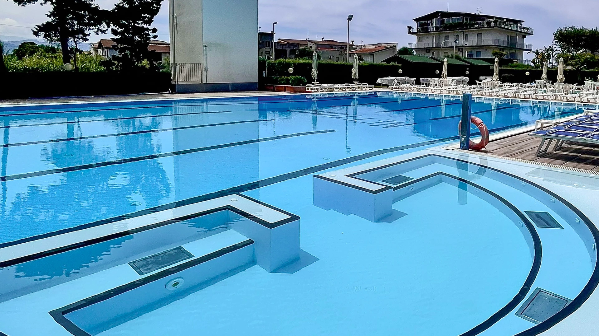 Der Garten des Anwesens verfügt über zwei nebeneinanderliegende Swimmingpools: ein halbolympisches Becken für Erwachsene (1,6 bis 3 Meter tief) mit Süßwasser-Infinity-Pool und Whirlpool sowie ein 72 Quadratmeter großes Kinderbecken (60 cm tief). Der gesamte Bereich ist mit Liegestühlen, Sonnenschirmen, Warmwasserduschen und Umkleidekabinen ausgestattet.