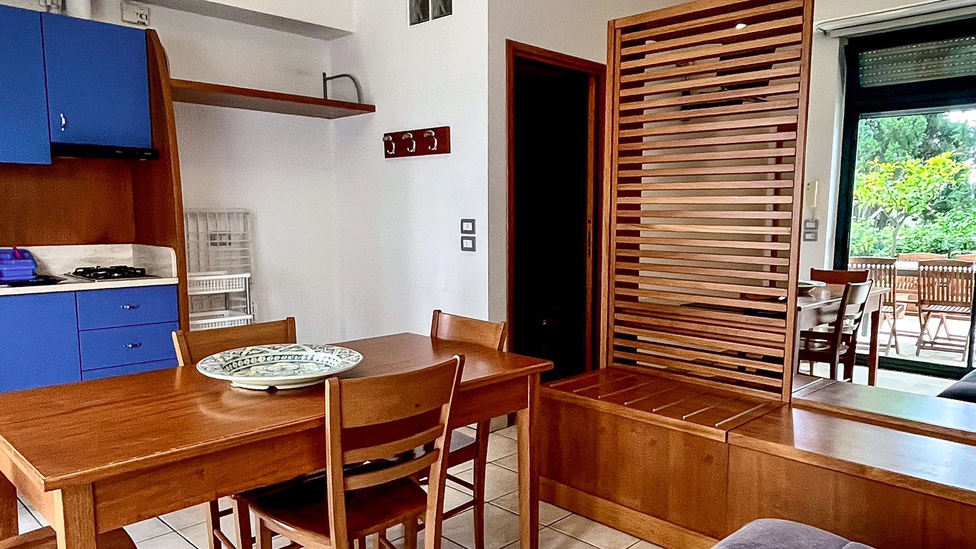 Die Studios (max. 4 Personen) befinden sich im Erdgeschoss und verfügen über einen Wohnbereich mit Eingang und Kochnische, ein Doppelbett und ein Badezimmer.