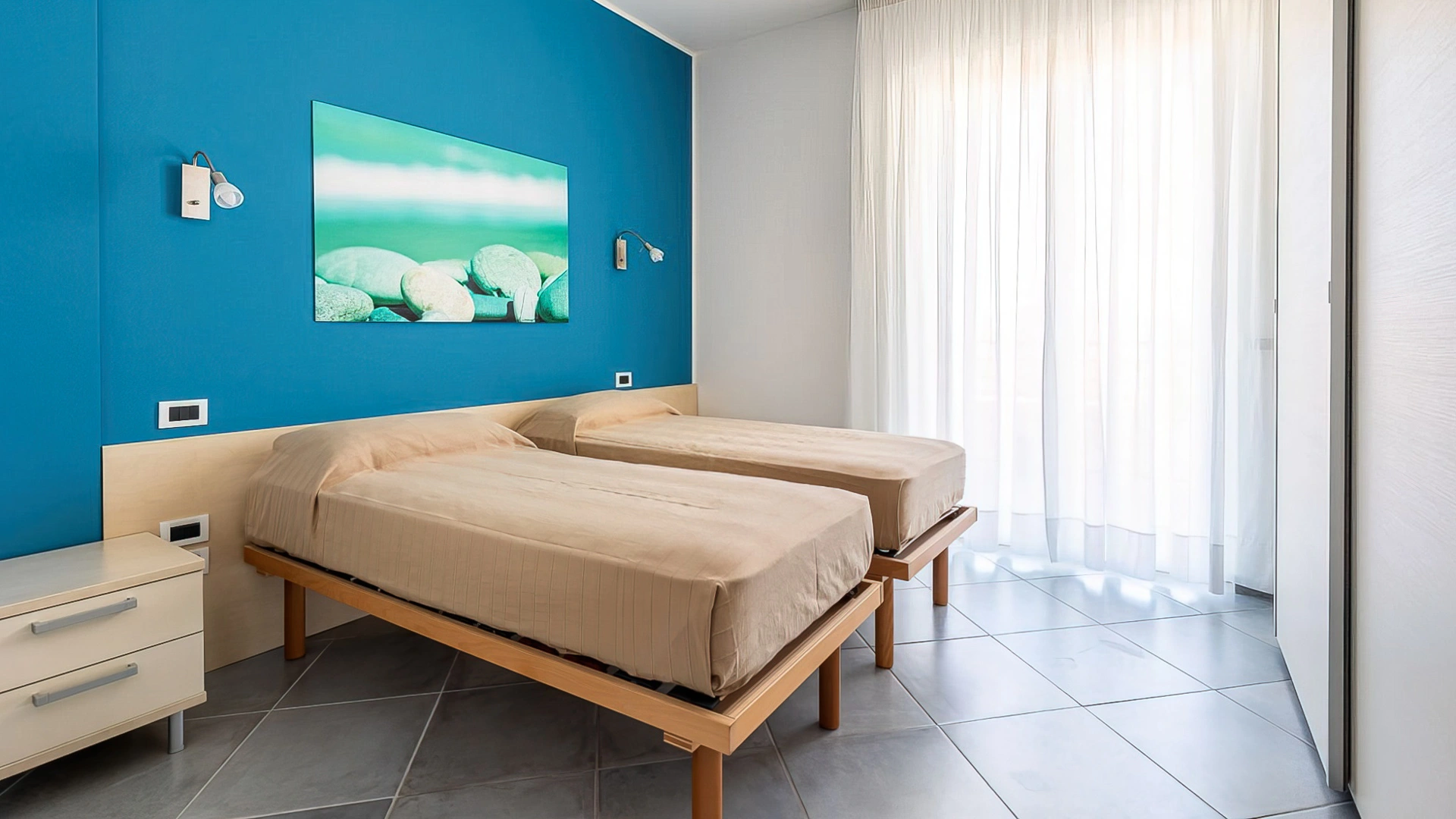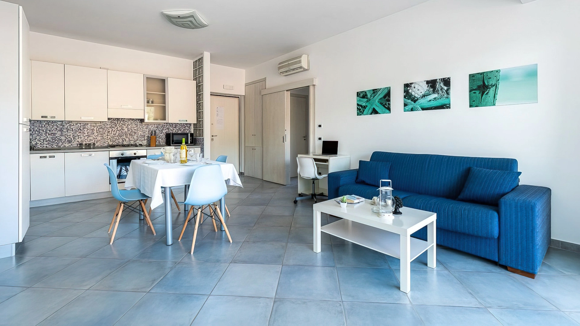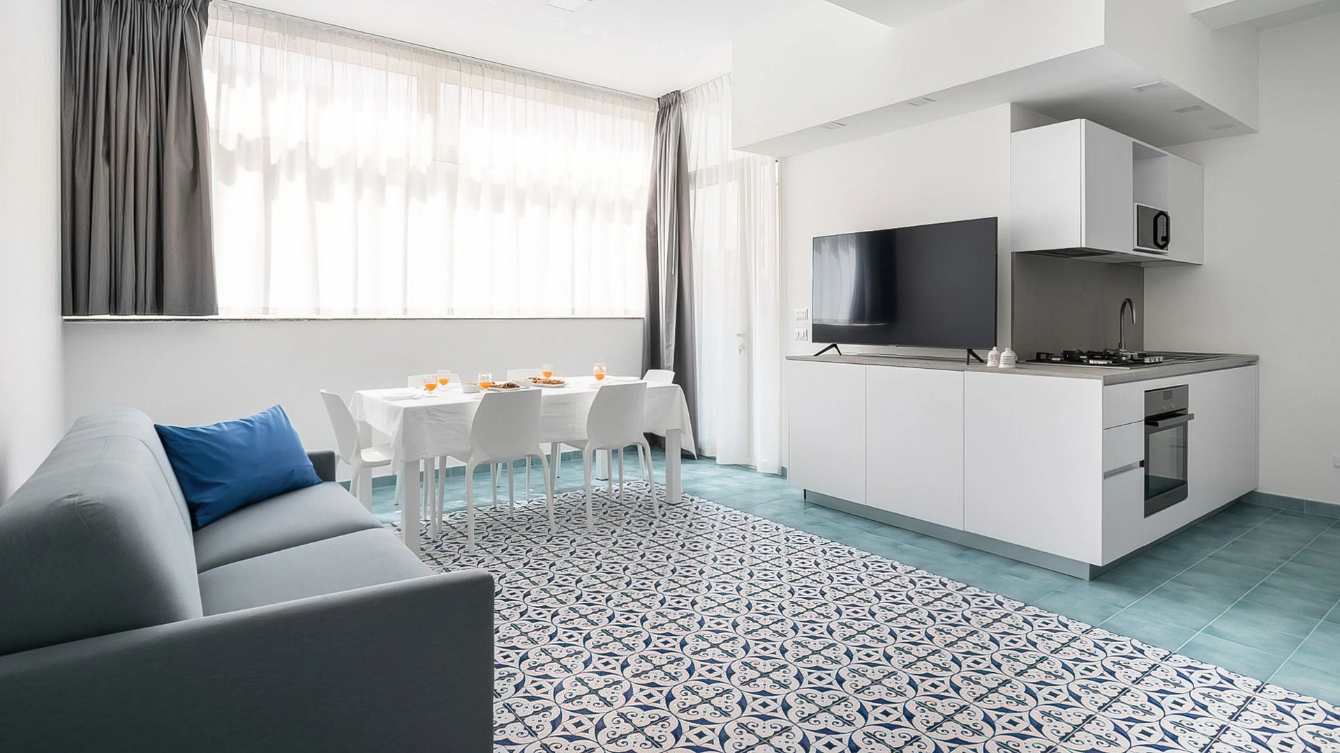 Es stehen Apartments mit zwei oder drei Zimmern zur Verfügung. Alle Apartments sind mit Fernseher, WLAN, Klimaanlage, Waschmaschine, Bügeleisen, einer Küche mit Backofen, Mikrowelle, Kühlschrank und Geschirrspüler sowie einem Badezimmer mit Dusche und Haartrockner ausgestattet. Einige bieten Meerblick, andere Poolblick. Bettwäsche und Handtücher sind gegen Gebühr erhältlich.
