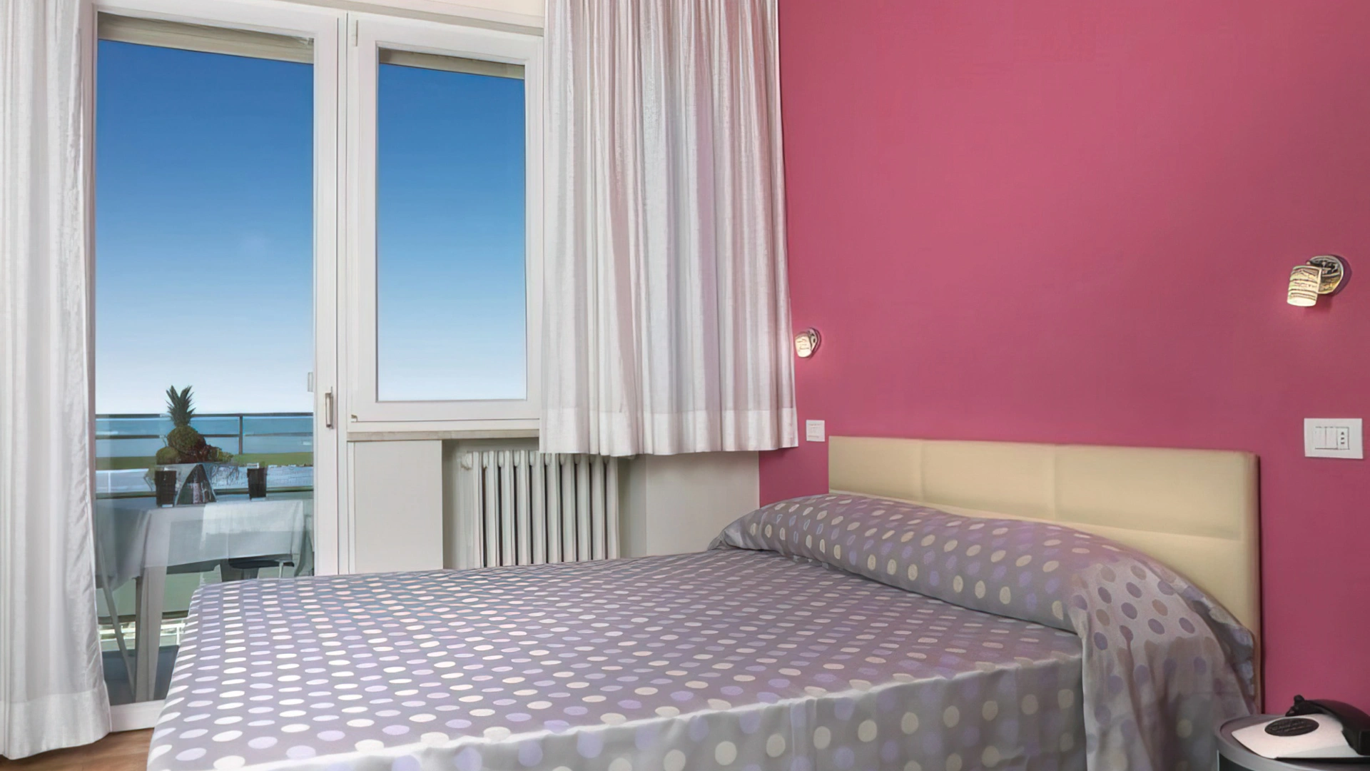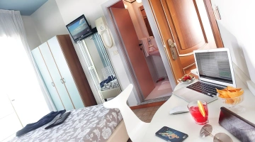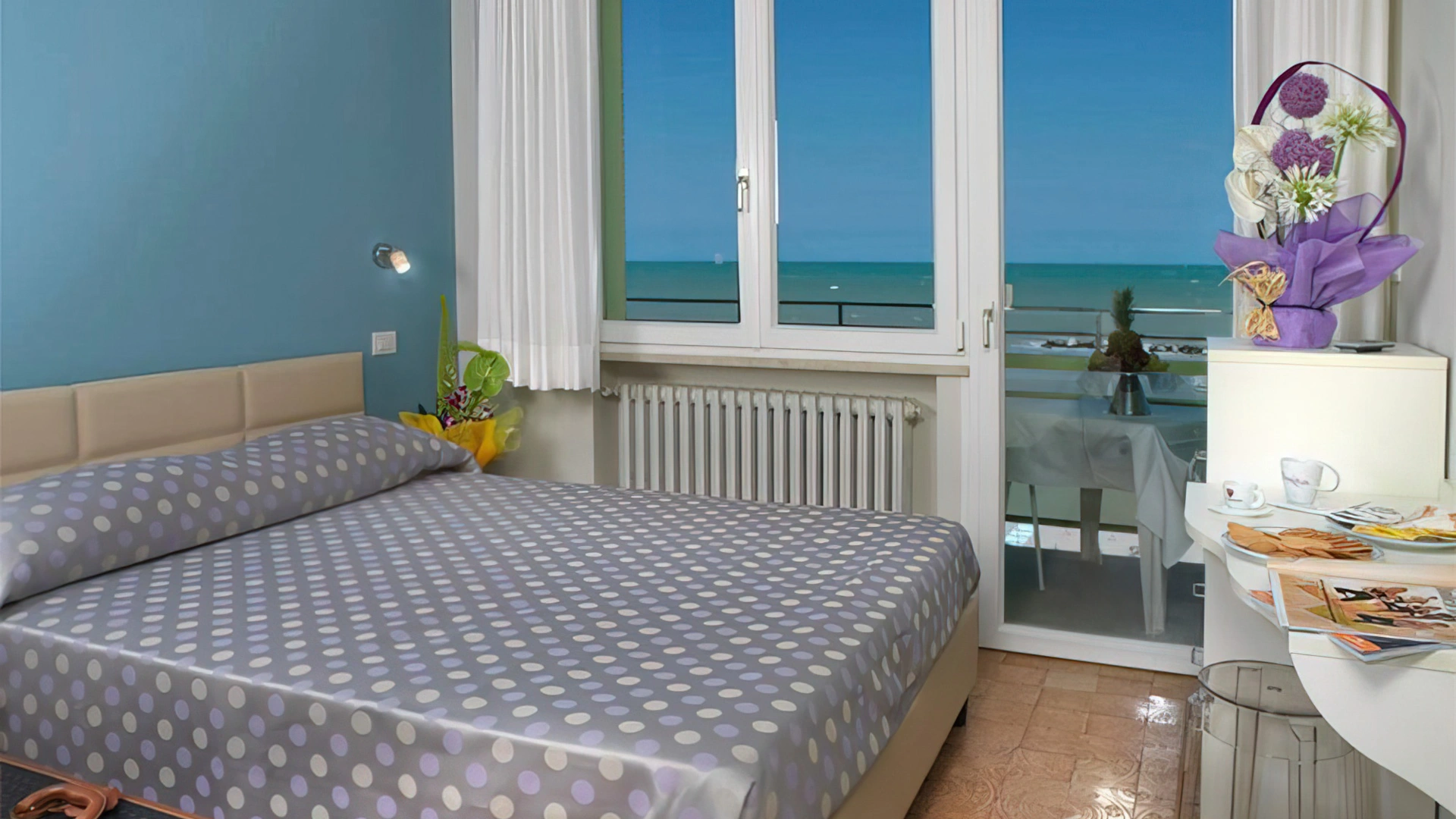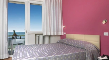 DOPPIA PLUS: camera affacciata sul mare con ampia vetrata e tutti i servizi elencati.