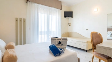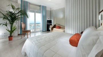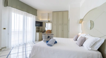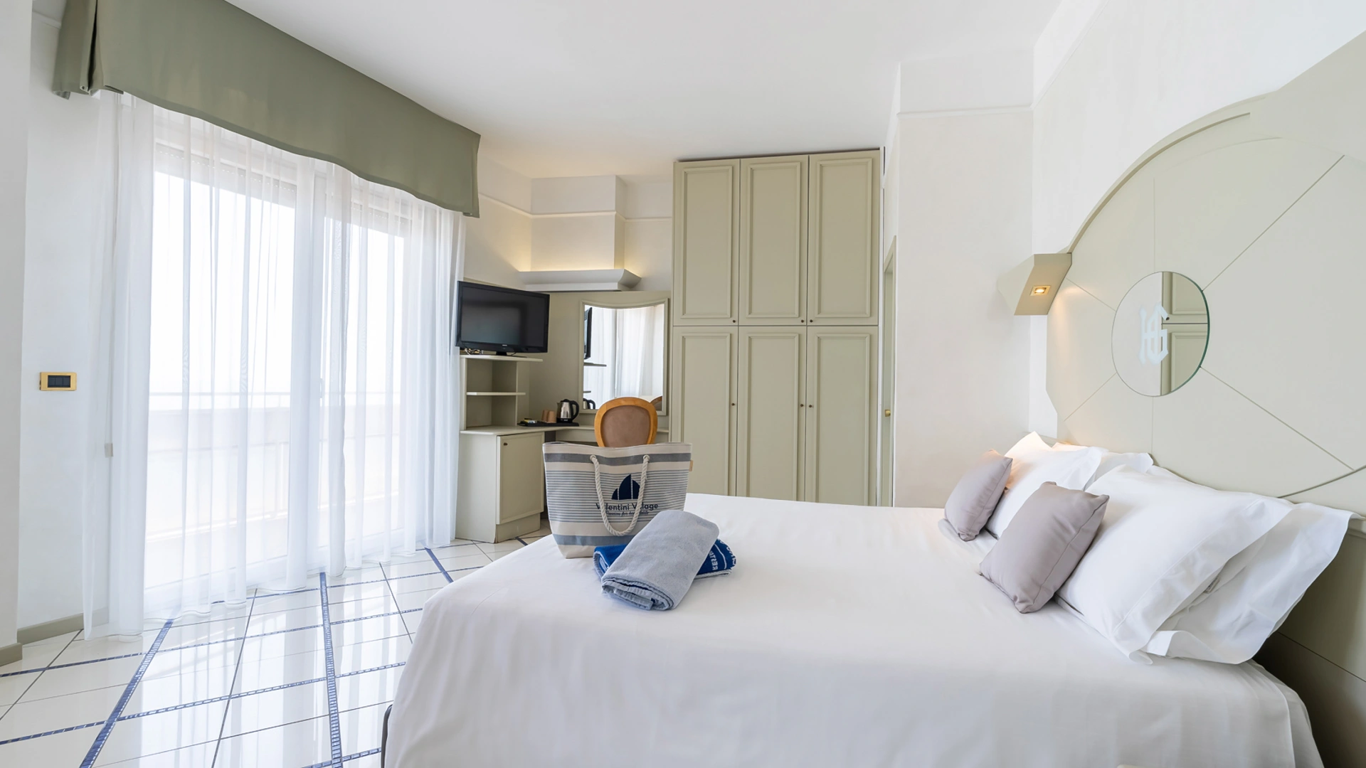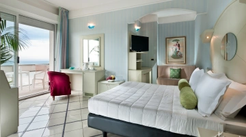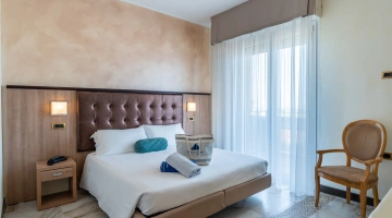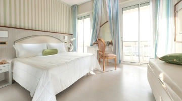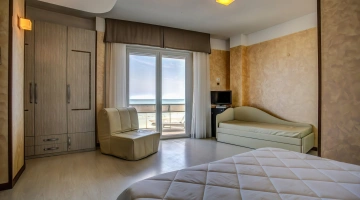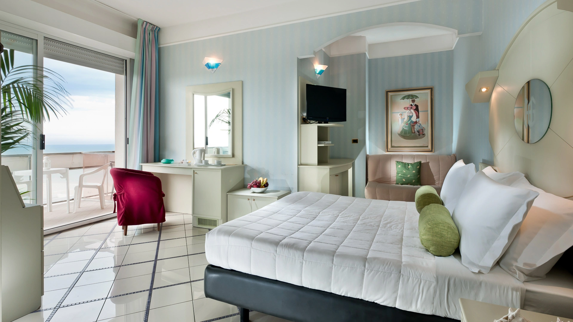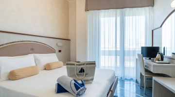 DELUXE SUPERIOR: al 7° o '8° piano, balcone vista mare con chaise longue, set cortesia + set cosmesi ADA, box doccia o vasca idromassaggio a richiesta, bollitore.