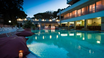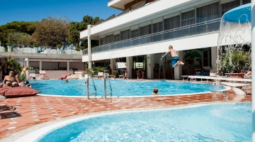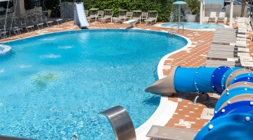 La zona delle piscine si estende su un'area di oltre 500 mq, circondata dal verde. La più ampia ha acqua riscaldata con pannelli solari e una zona bassa, alla quale si aggiungono la vasca idromassaggio in mosaico e la piscina bimbi con acqua riscaldata.