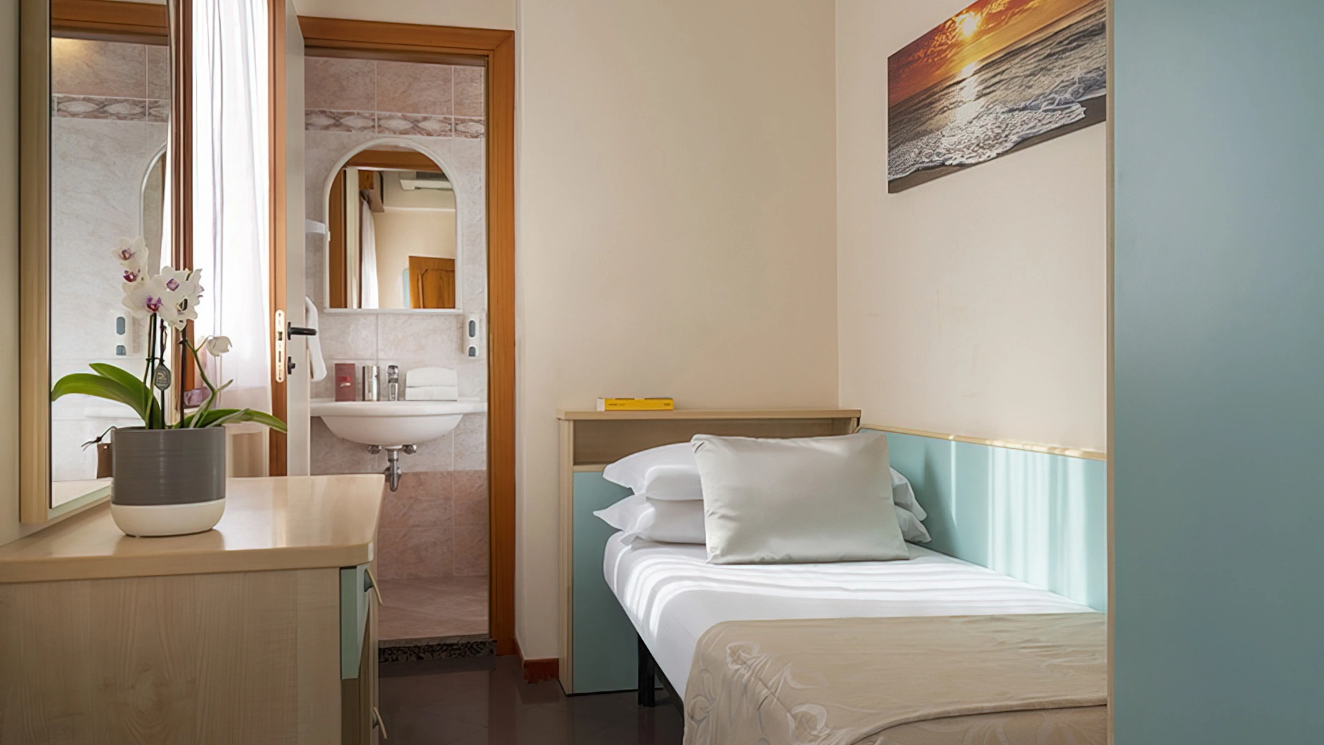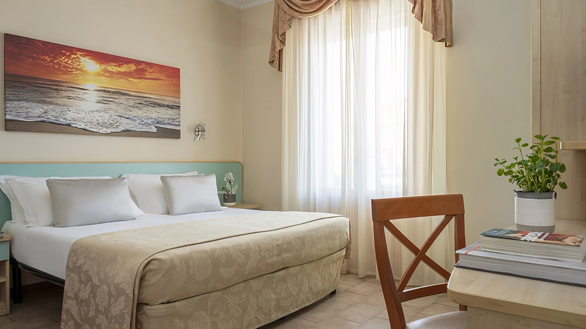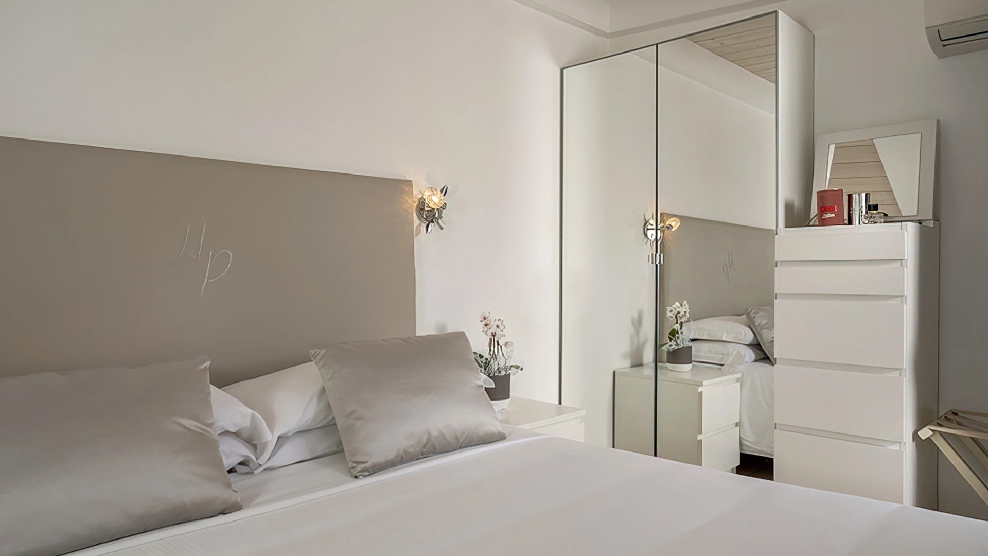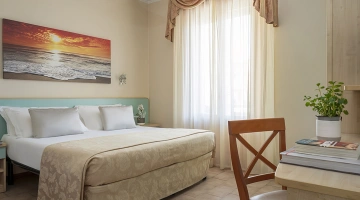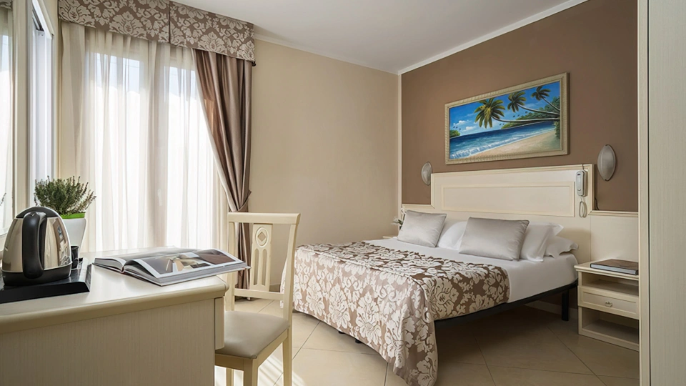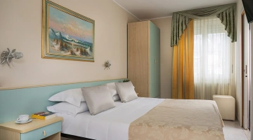 Le camere sono dotate di balcone, aria condizionata, Wi-Fi fibra, TV sat, telefono, bagno con box doccia (oppure vasca) e phon; frigobar su richiesta a pagamento.