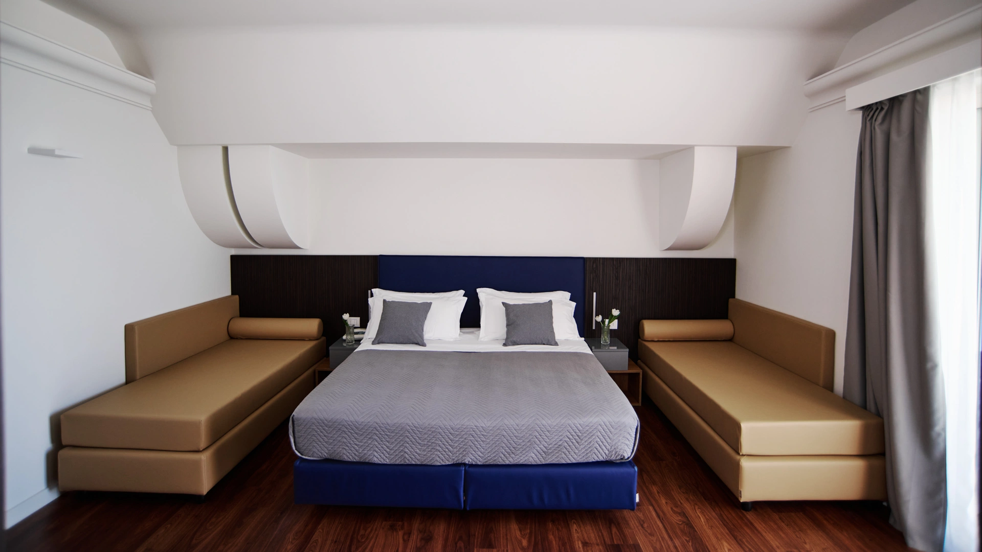 FAMILY ROOM: 2 zone notte separate collegate da un corridoio con ingresso unico, un bagno più grande e due balconi, uno dei quali con vista mare laterale.