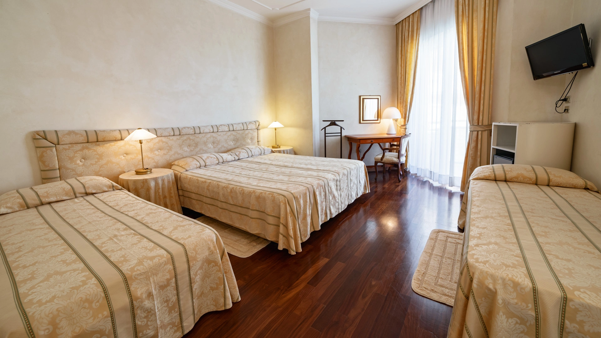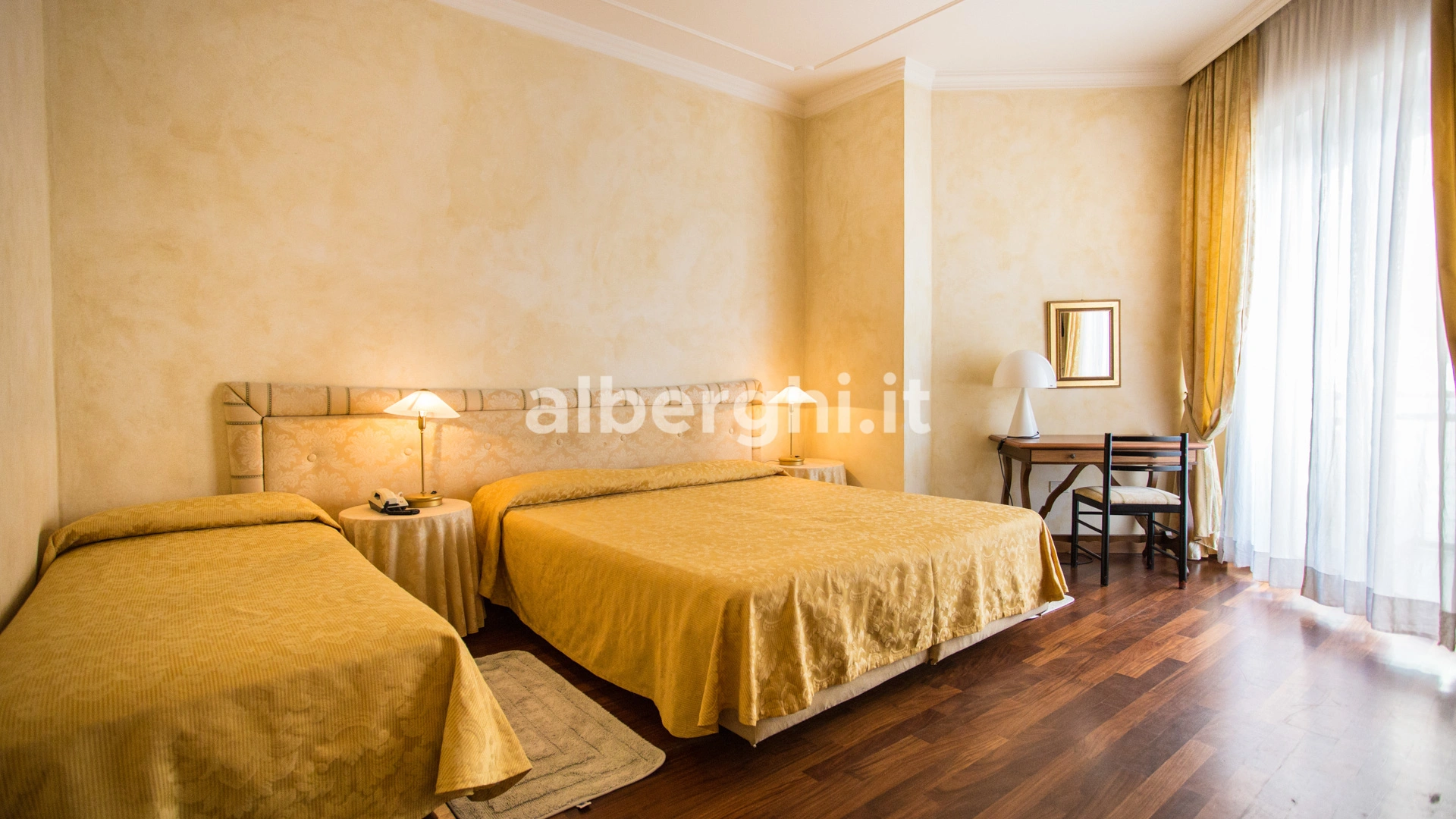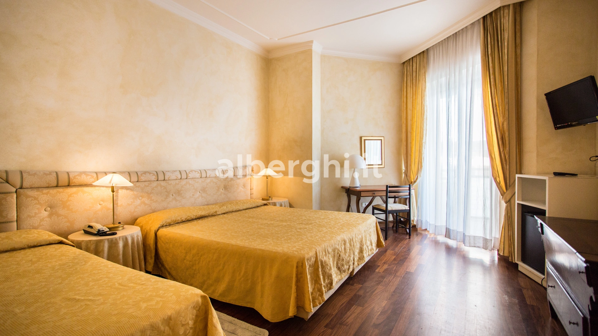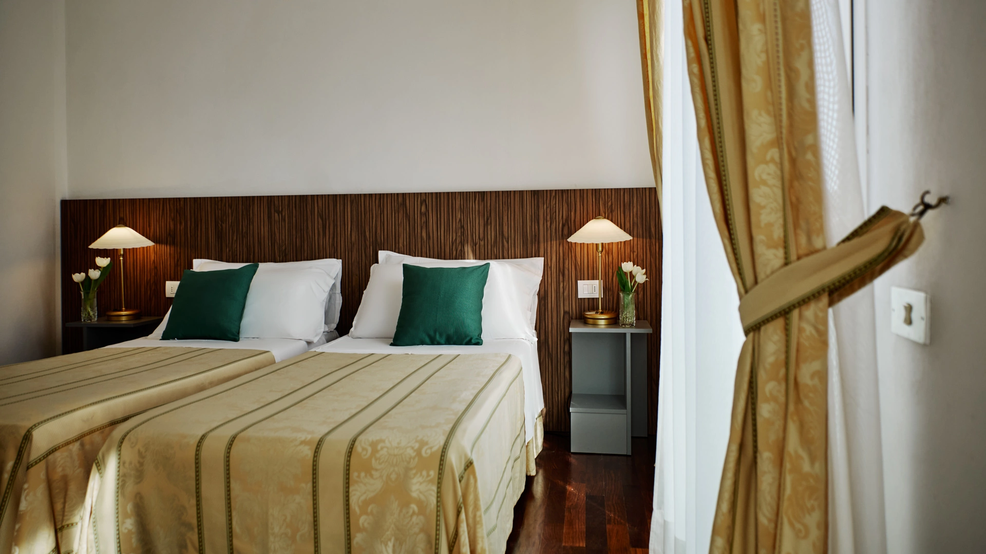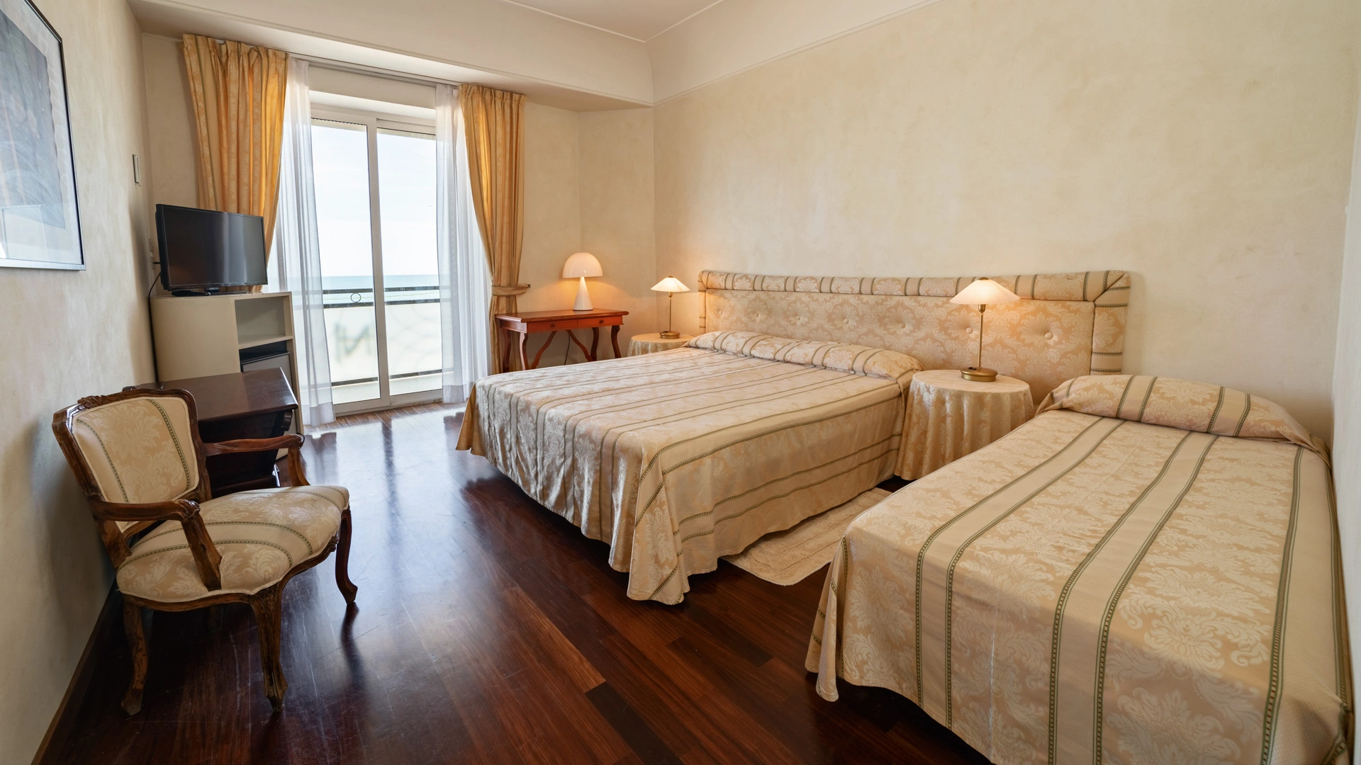 Le stanze dispongono di balcone, Wi-Fi fibra 100 Mbit/s, aria condizionata e riscaldamento, telefono, TV sat, cassetta di sicurezza, frigobar non rifornito. I bagni, completamente rinnovati nel 2020, sono dotati di box doccia e phon. Room service a pagamento.