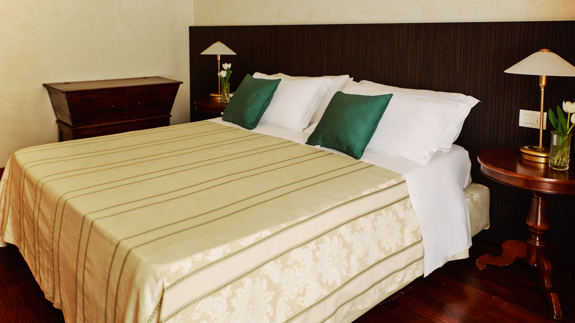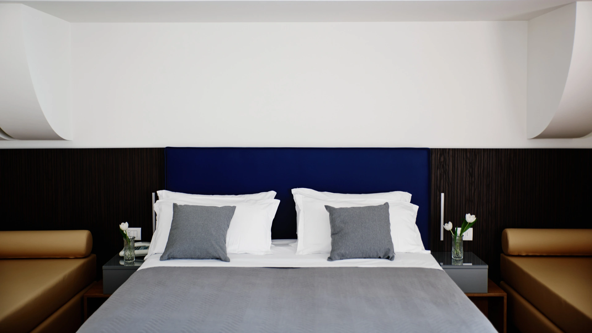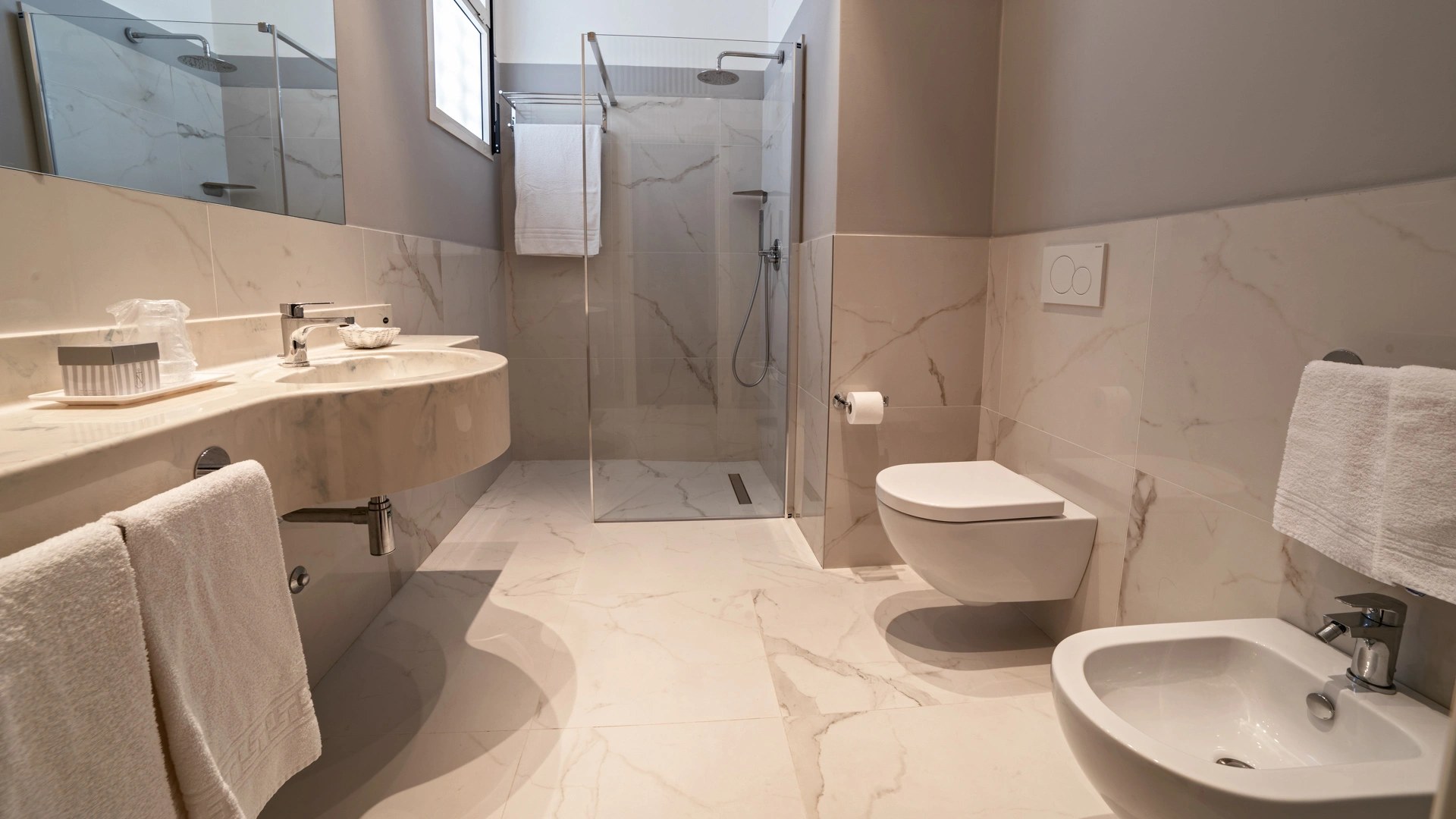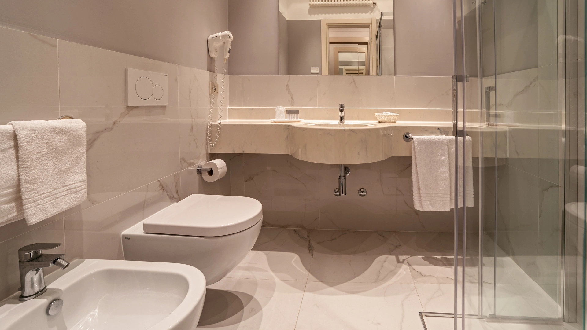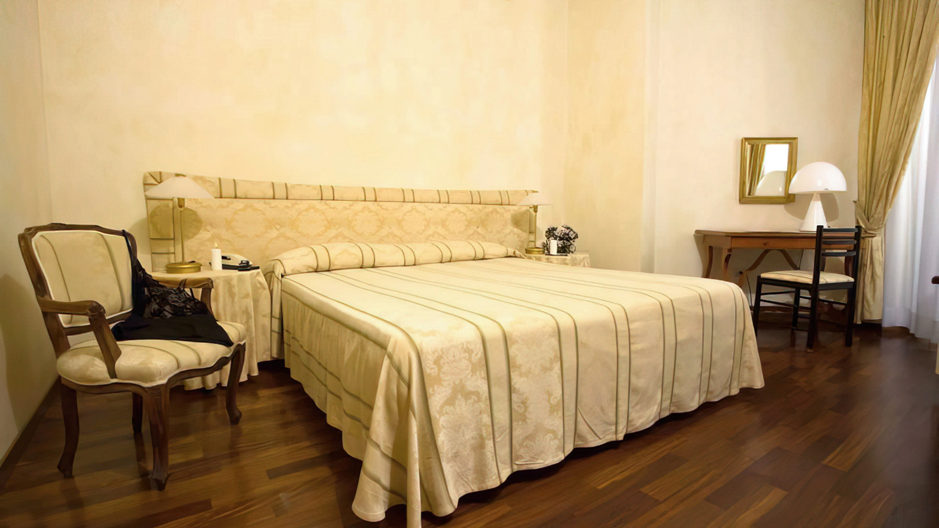 Le stanze dispongono di balcone, Wi-Fi fibra 100 Mbit/s, aria condizionata e riscaldamento, telefono, TV sat, cassetta di sicurezza, frigobar non rifornito. I bagni, completamente rinnovati nel 2020, sono dotati di box doccia e phon. Room service a pagamento.
