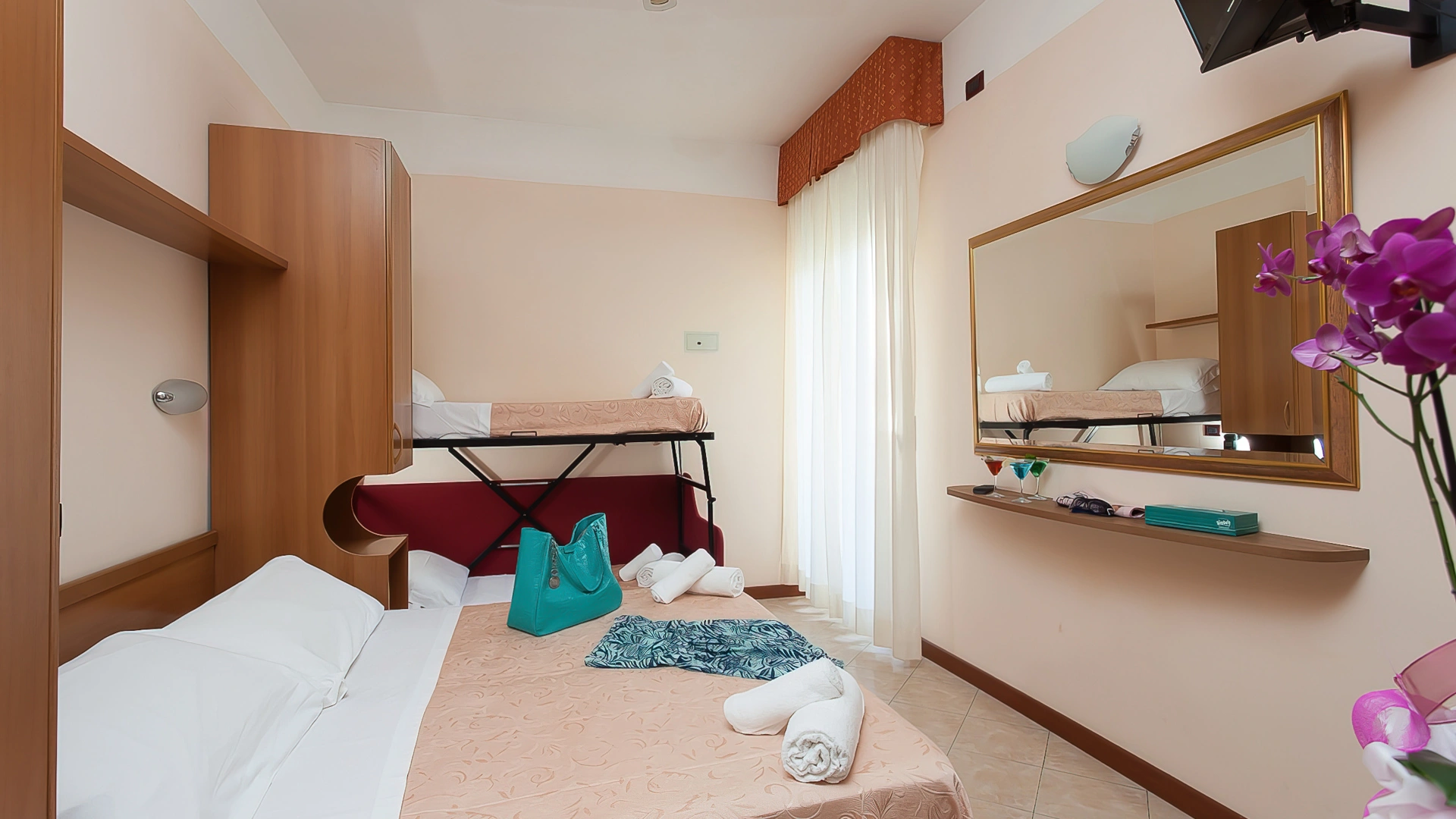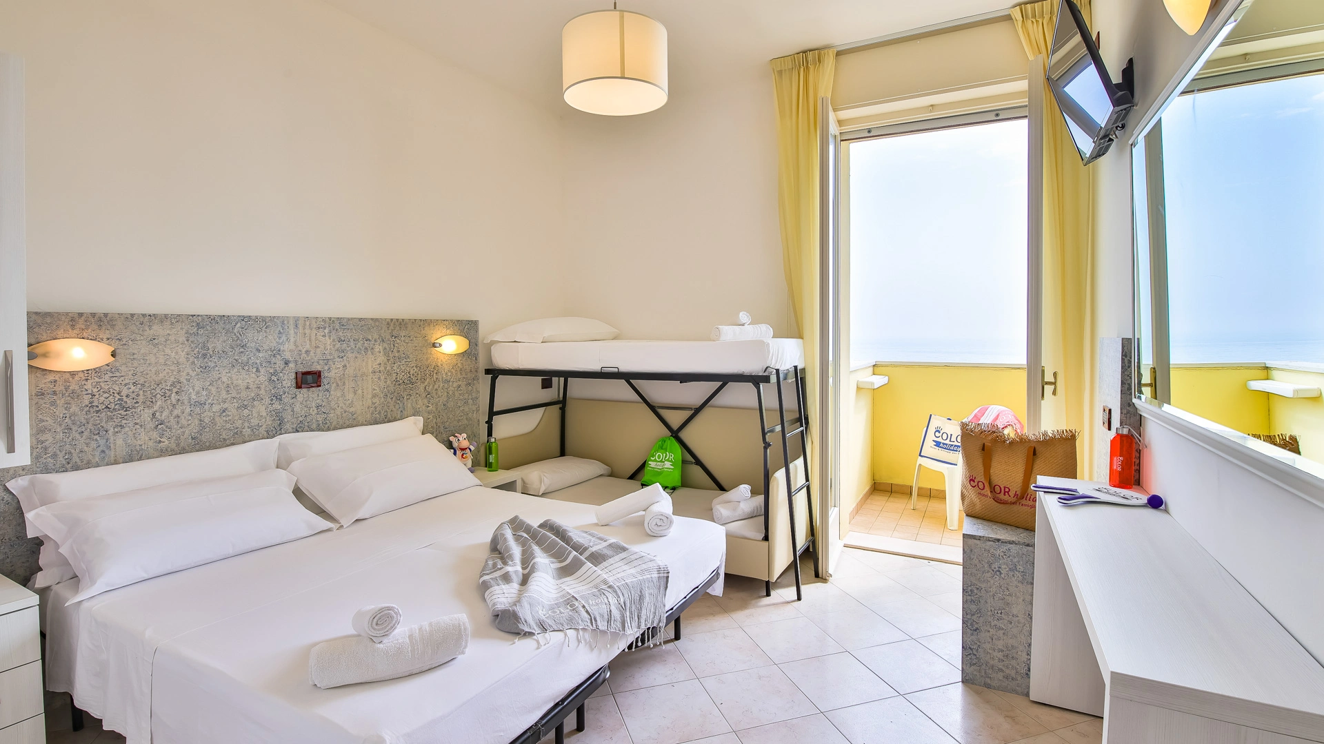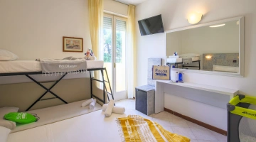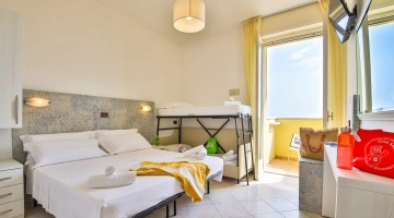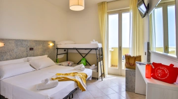 QUADRUPLA: 15 mq con letto matrimoniale più letto a castello, balcone vista pineta o mare laterale.