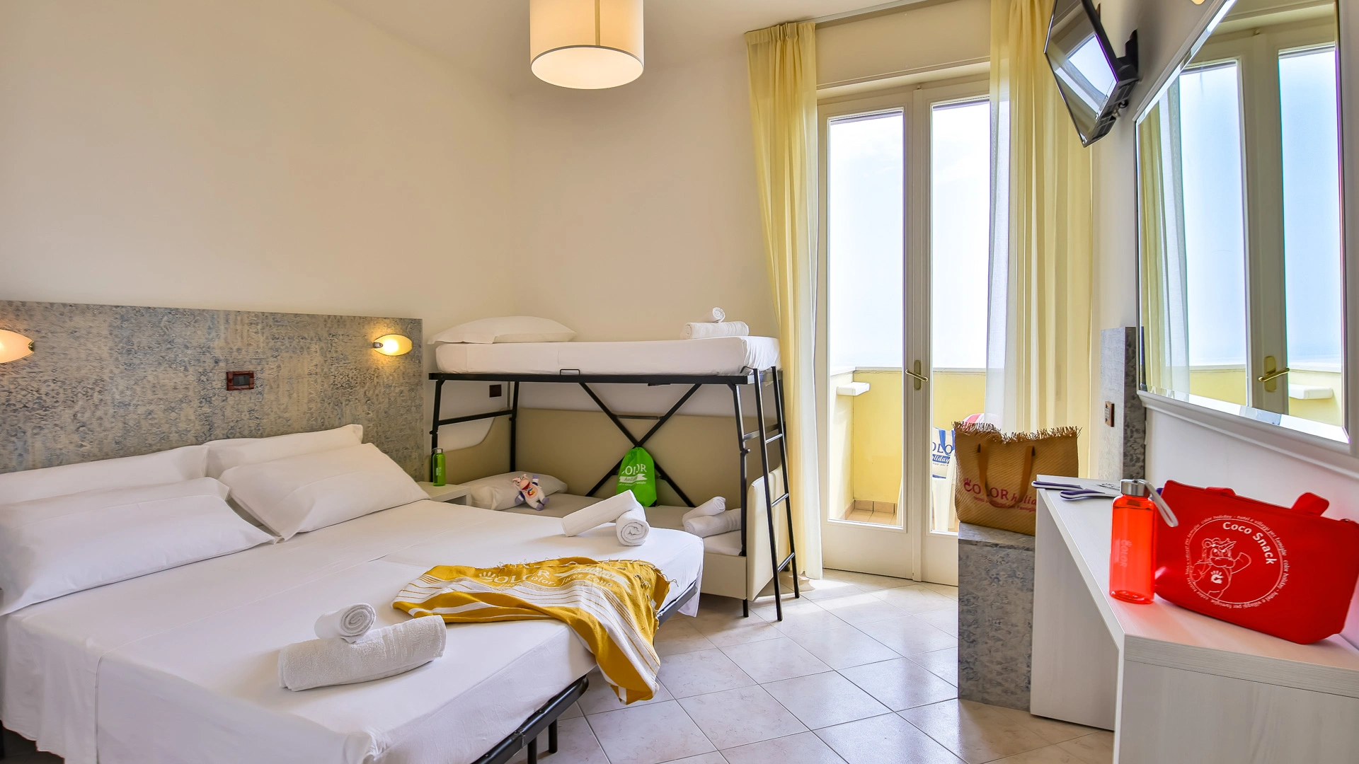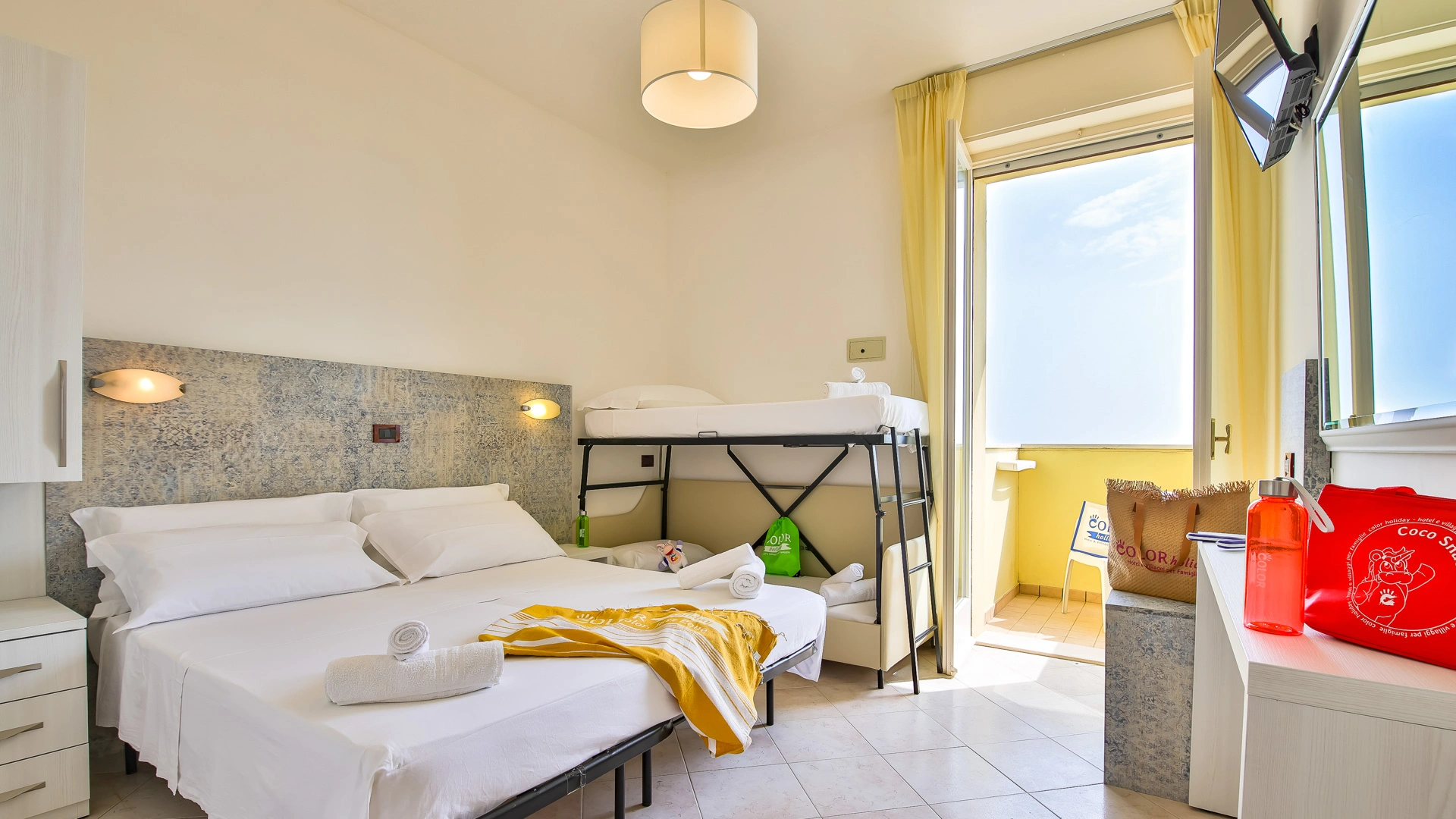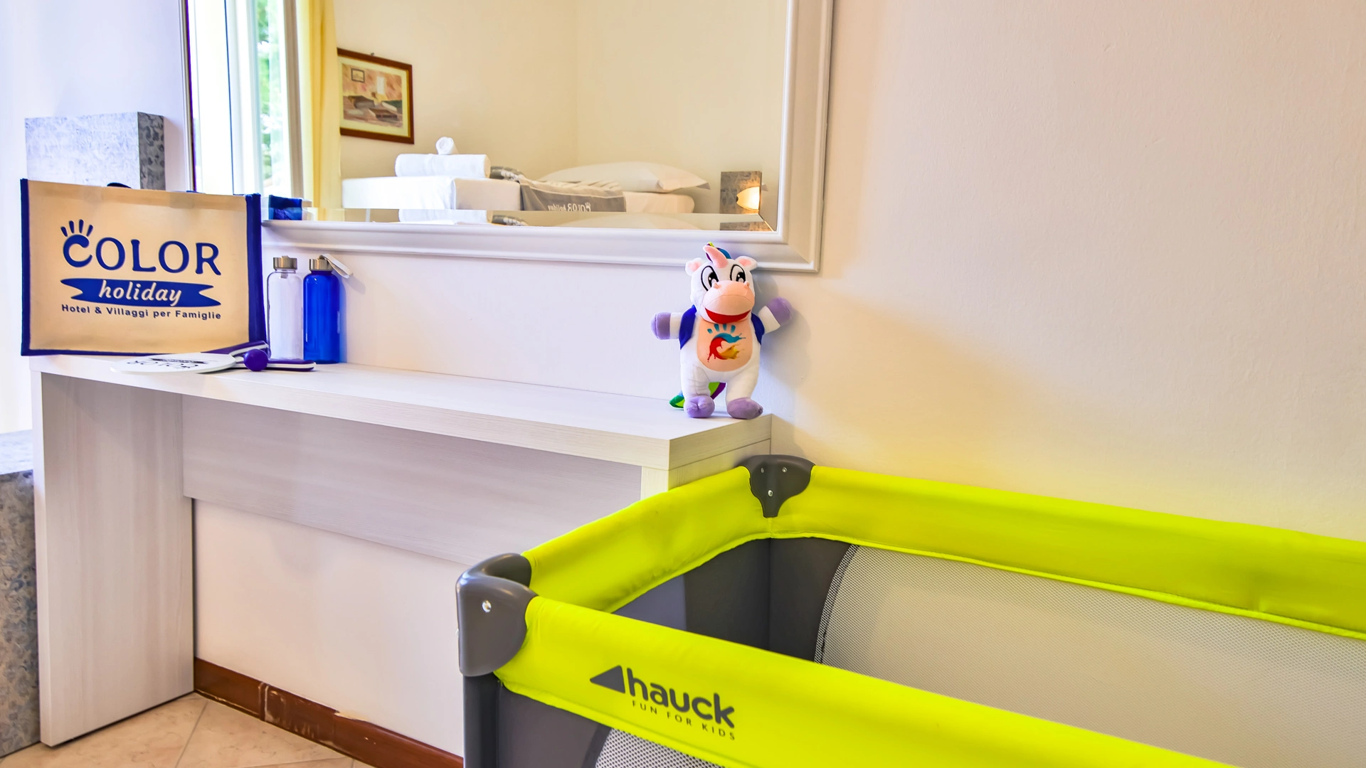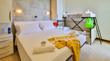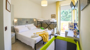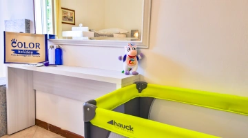 In camera: è possibile richiedere culle senza costi aggiuntivi, spondine anticaduta, lucina notturna, vaschette per il bagno e scaldabiberon.