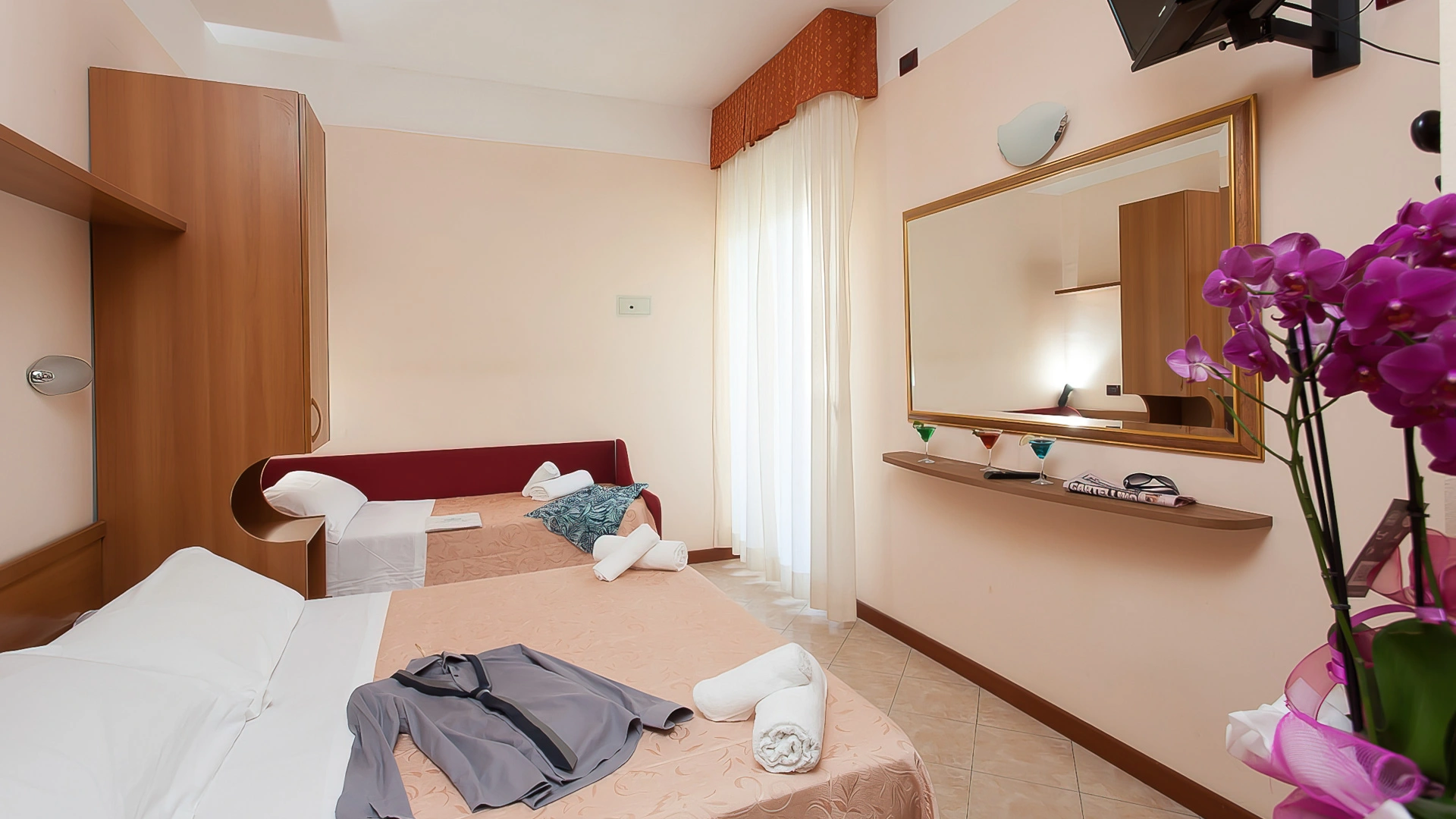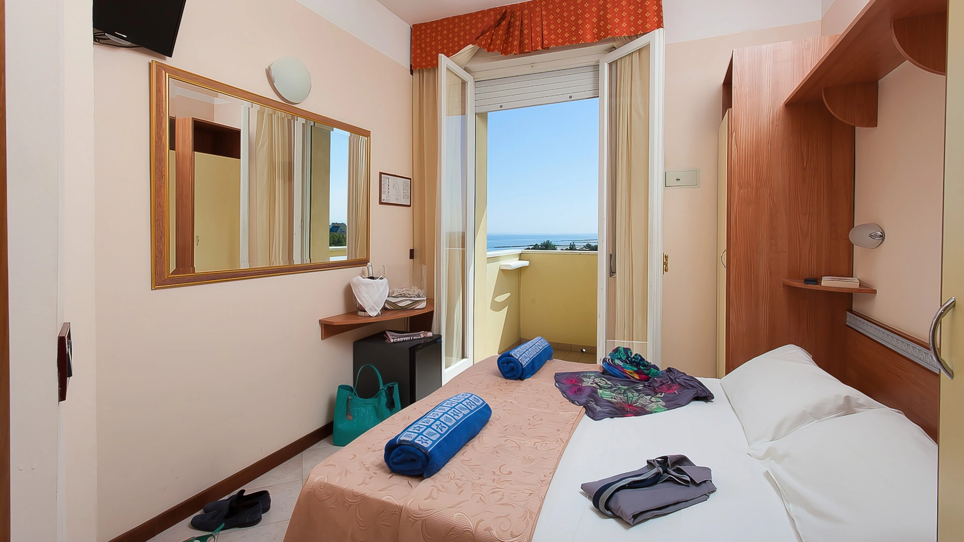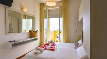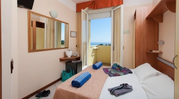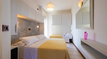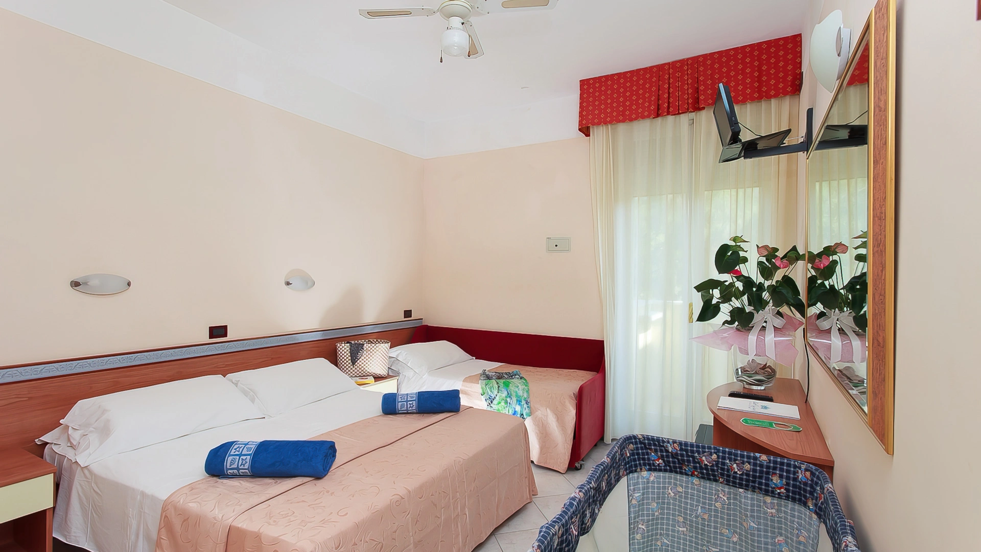 TRIPLA: 14 mq con letto matrimoniale più letto singolo o culla, balcone vista pineta o mare laterale.