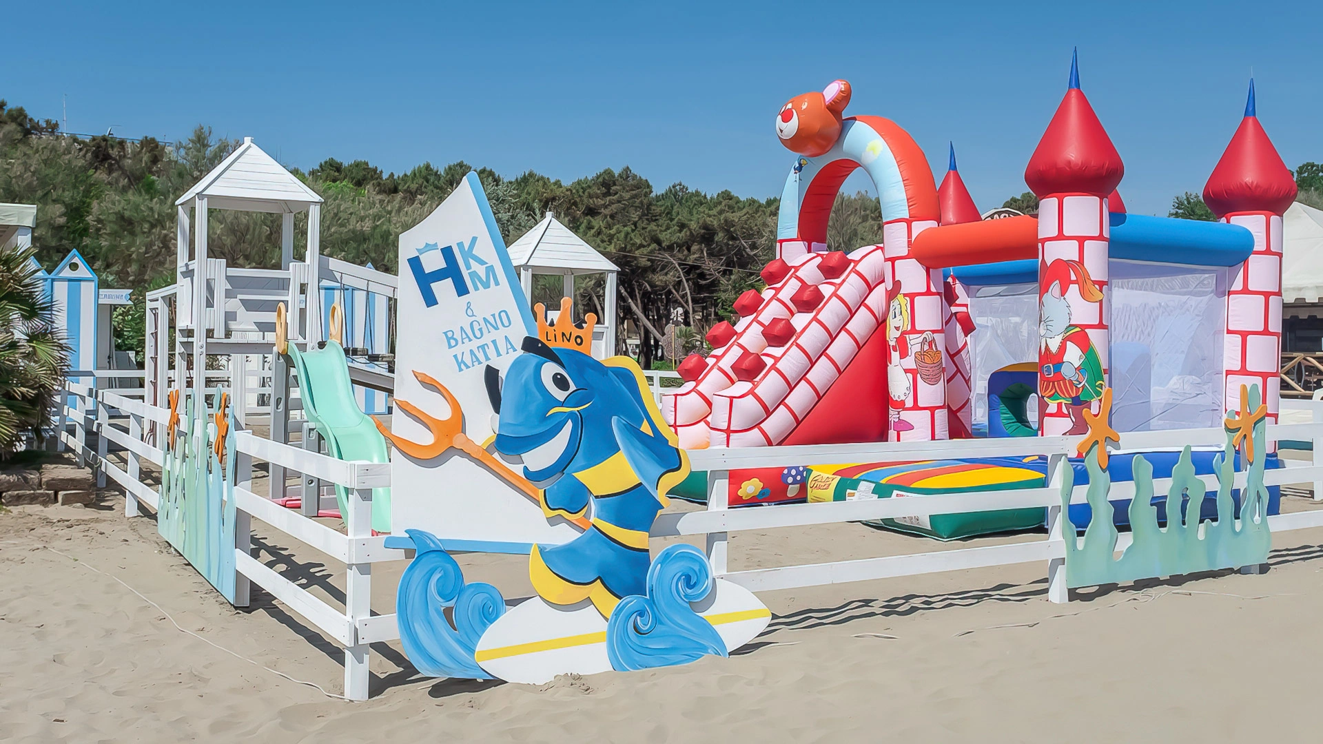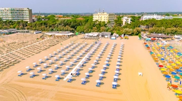 La spiaggia privata (Bagno Katia) gode di accesso diretto attraverso una breve striscia di pineta. È completamente attrezzata con lettini, ombrelloni, ristorante, bar e servizio di animazione, oltre a gonfiabili e giochi per i più piccoli. I teli mare sono disponibili a noleggio.