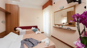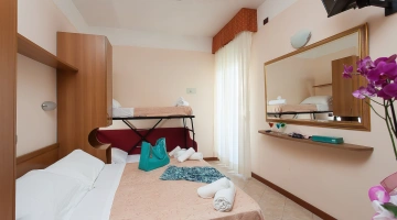 FAMILIARI: composta 2 camere comunicanti: 1 quadrupla alla quale si aggiunge 1 doppia con 2 bagni e 2 balconi vista pineta.