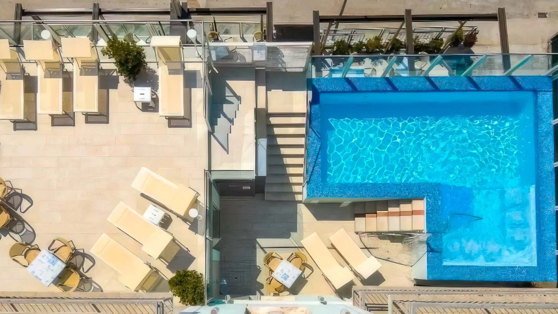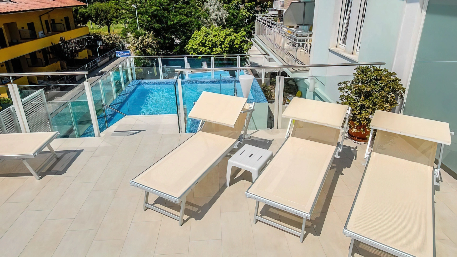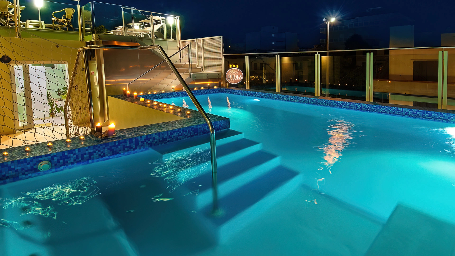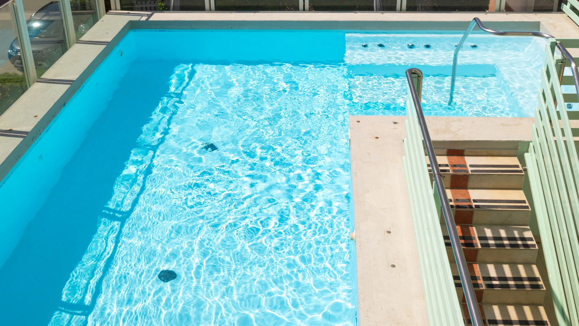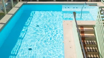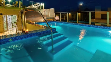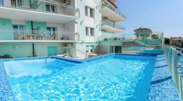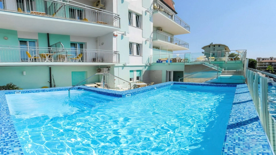 Dispone di una piscina di 25 mq con altezza da 94 a 126 cm, posizionata al primo piano. Riscaldata, con idromassaggio, percorso vascolare e nuoto controcorrente, circondata da un’area solarium attrezzata con lettini, tavolini e sedie.