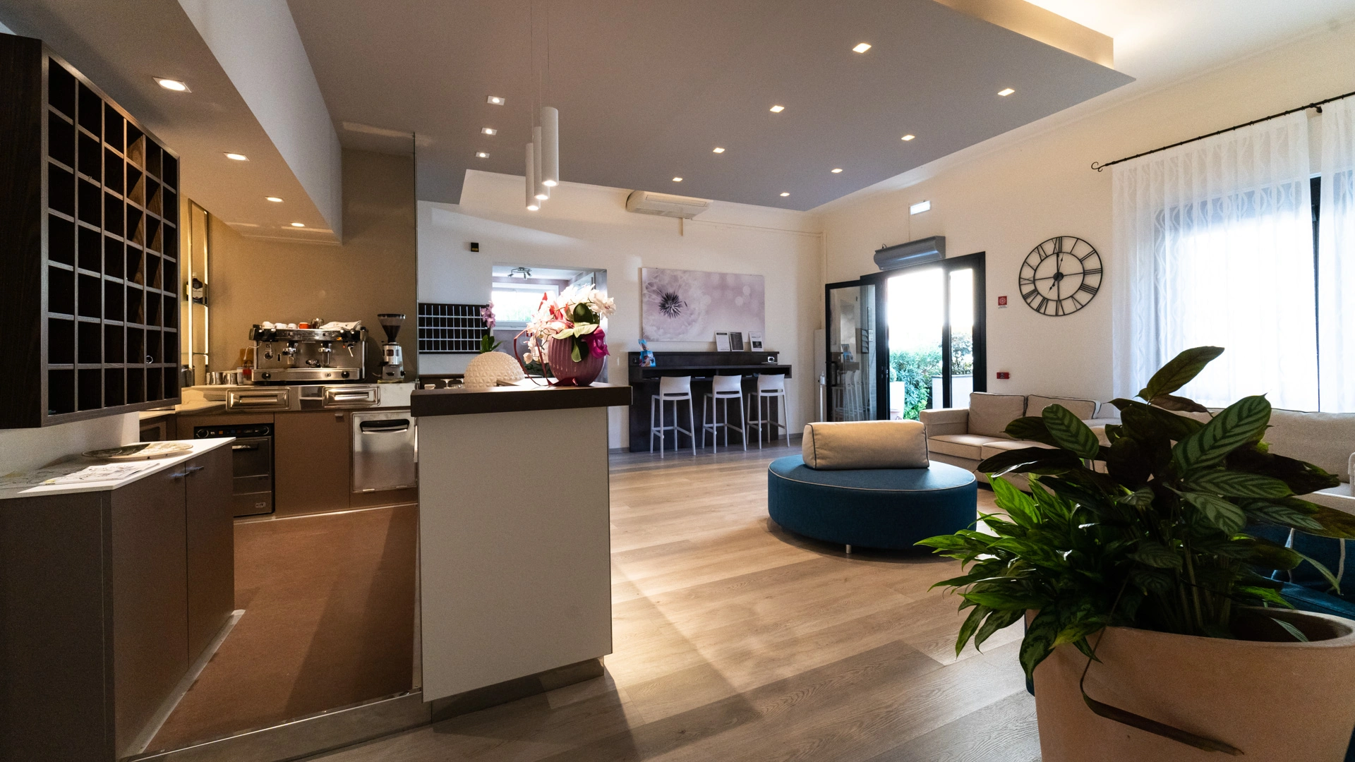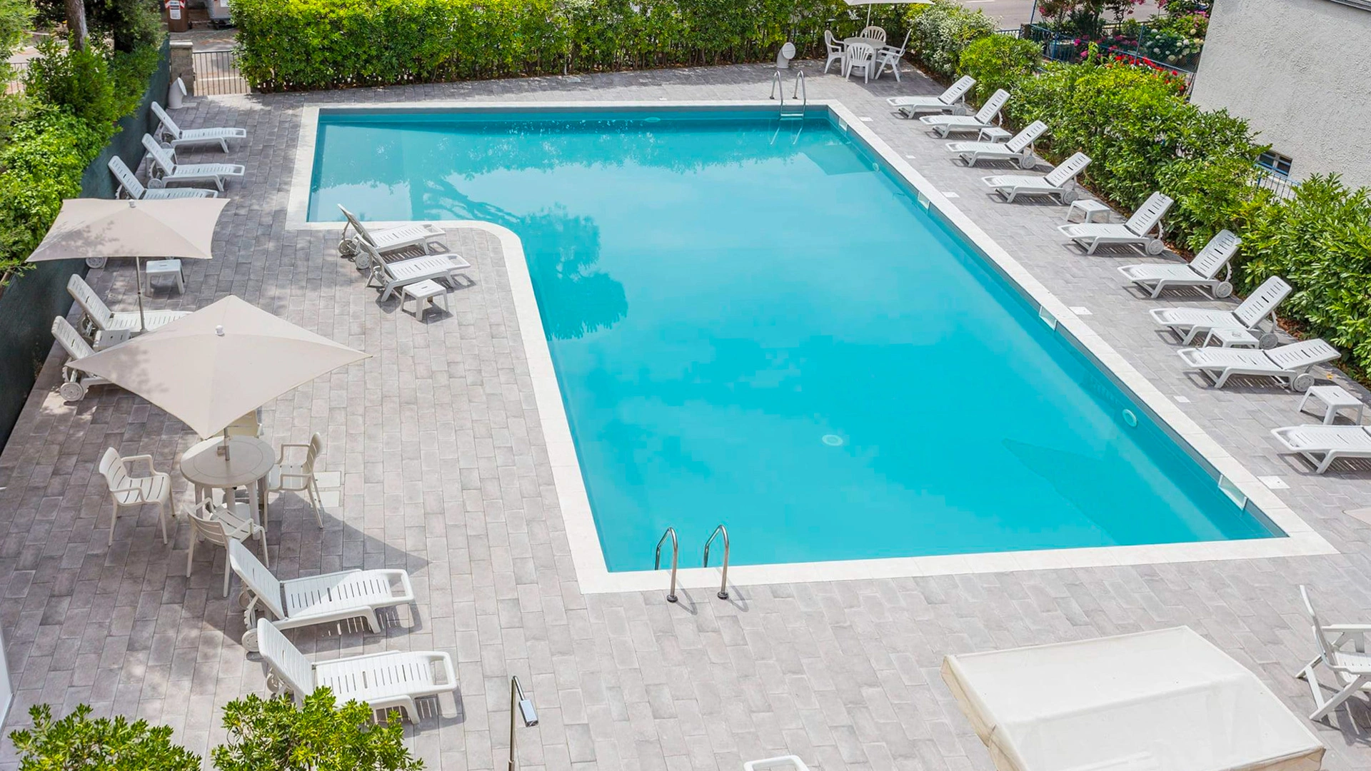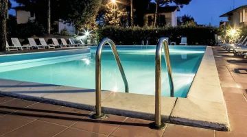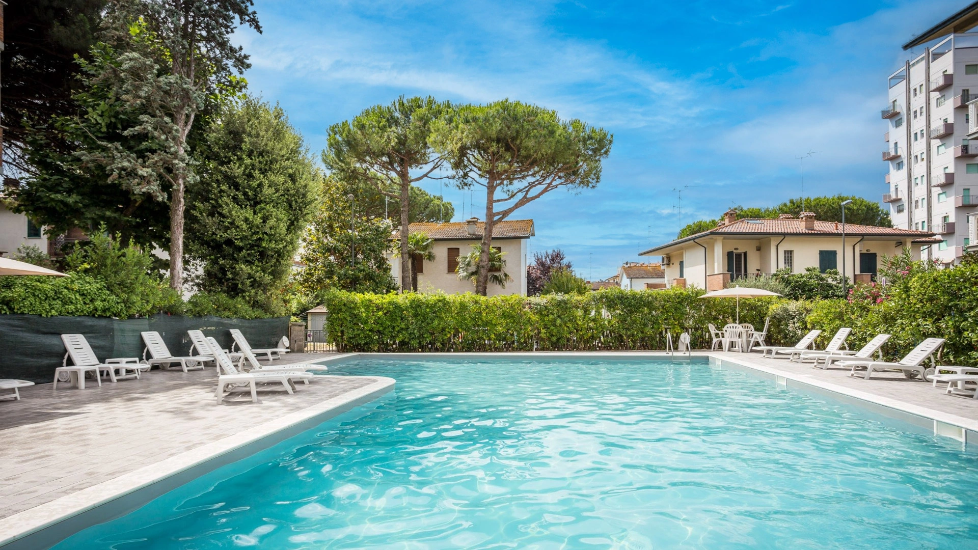 Piscina con zona più bassa per i bambini, solarium attrezzato con lettini e onbrelloni, giardino, veranda, terrazza, hall con TV sat e Sky, bar, ascensore, sala lettura, quotidiani.