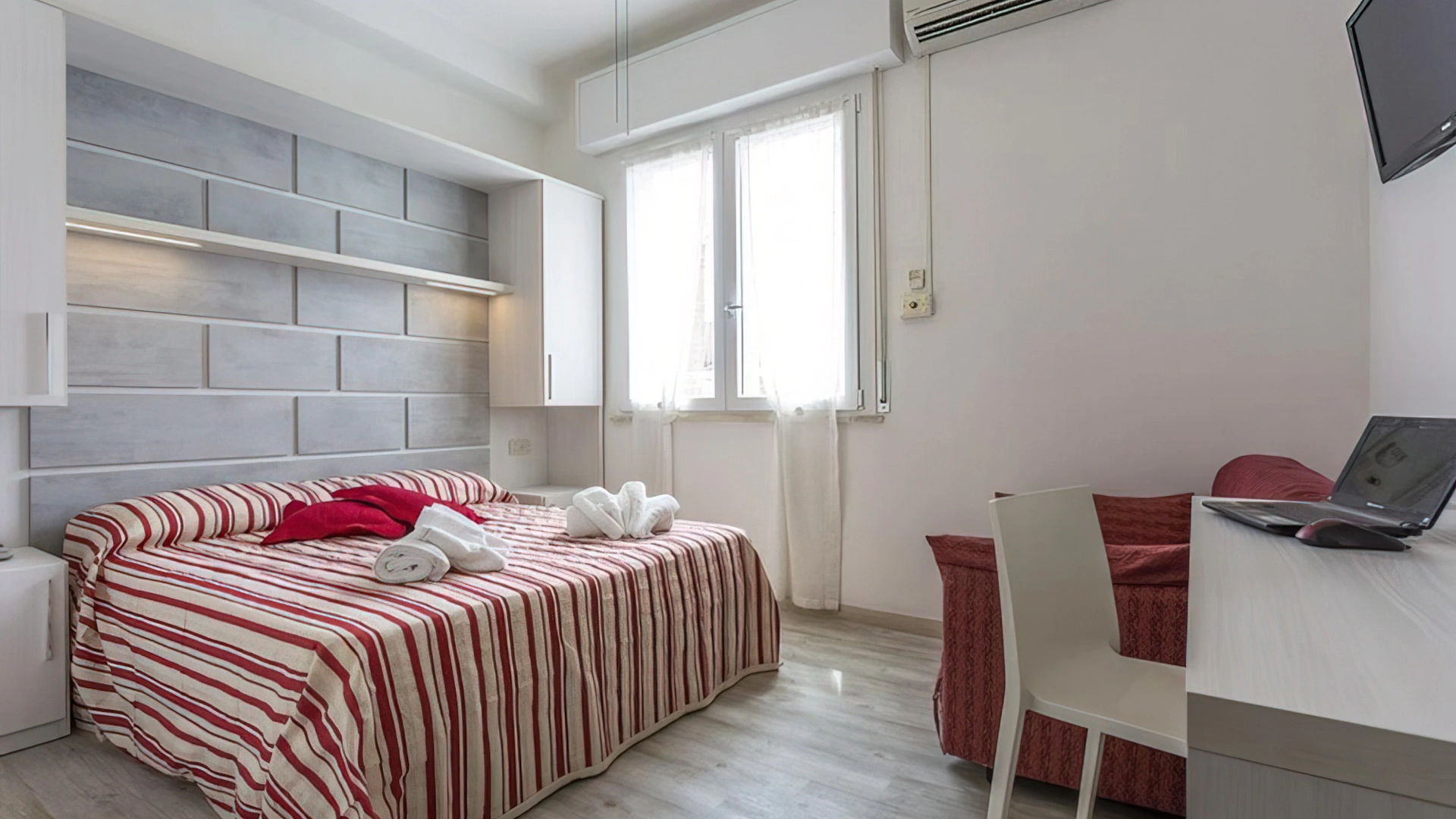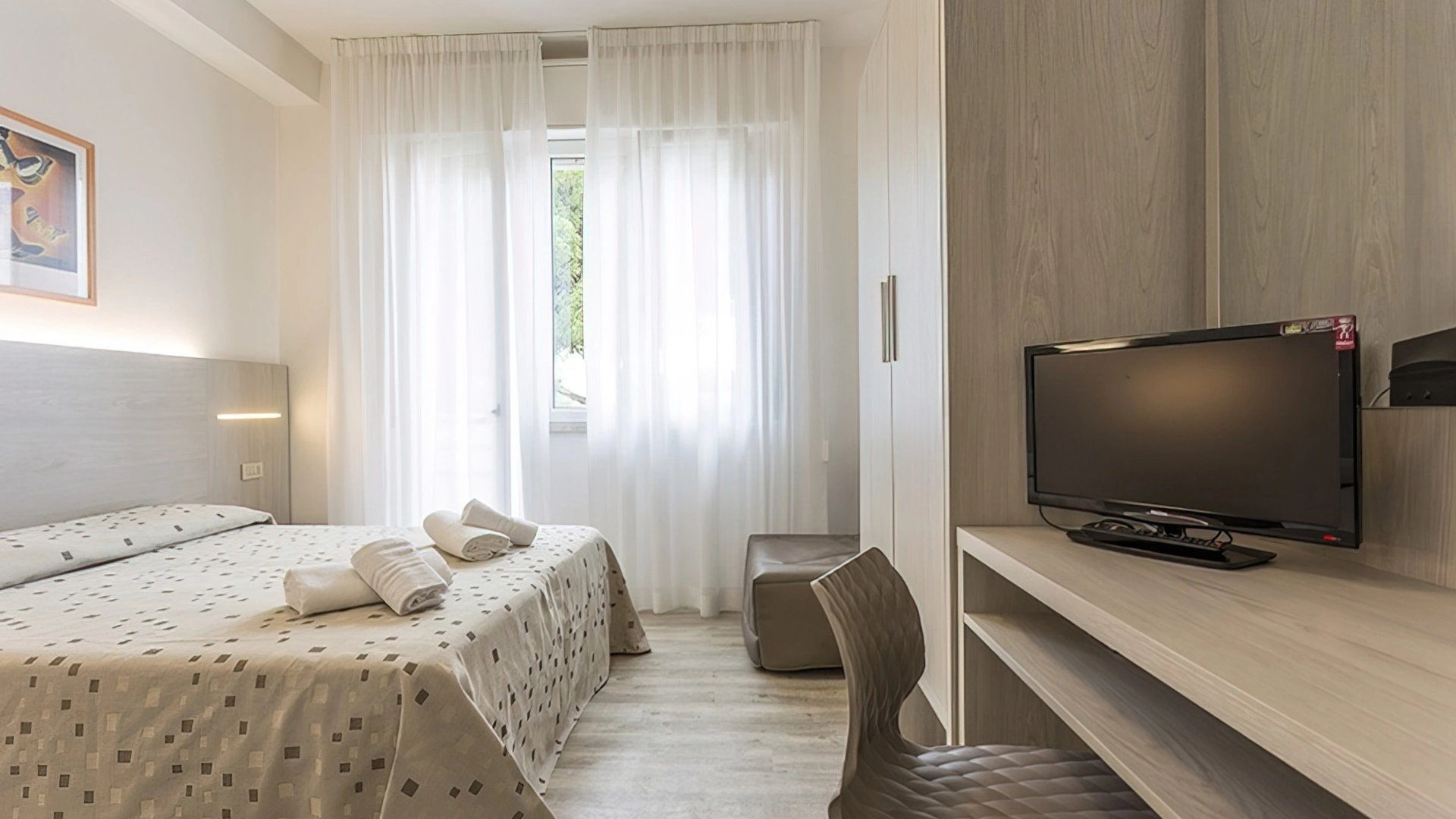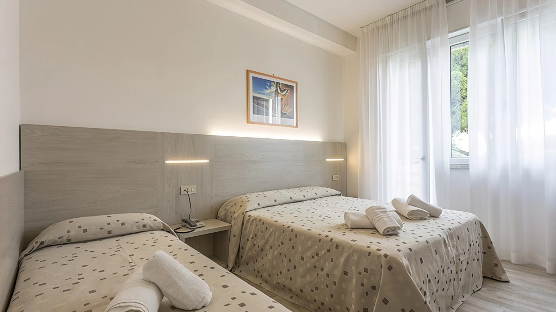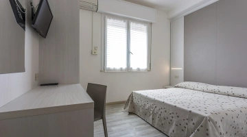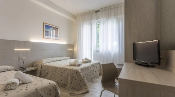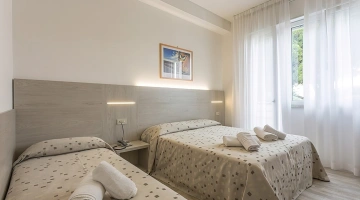 Le stanze sono dotate di balcone (nelle camere più grandi), TV a schermo piatto con canali sat, aria condizionata, telefono, cassaforte, Wi-Fi, servizi privati con box doccia, phon e set di cortesia. Si può scegliere tra varie tipologie di stanze: doppie, triple, quadruple o camere comunicanti. Tutte le stanze sono raggiungibili con l'ascensore; mentre solo in alcune è presente il frigobar.