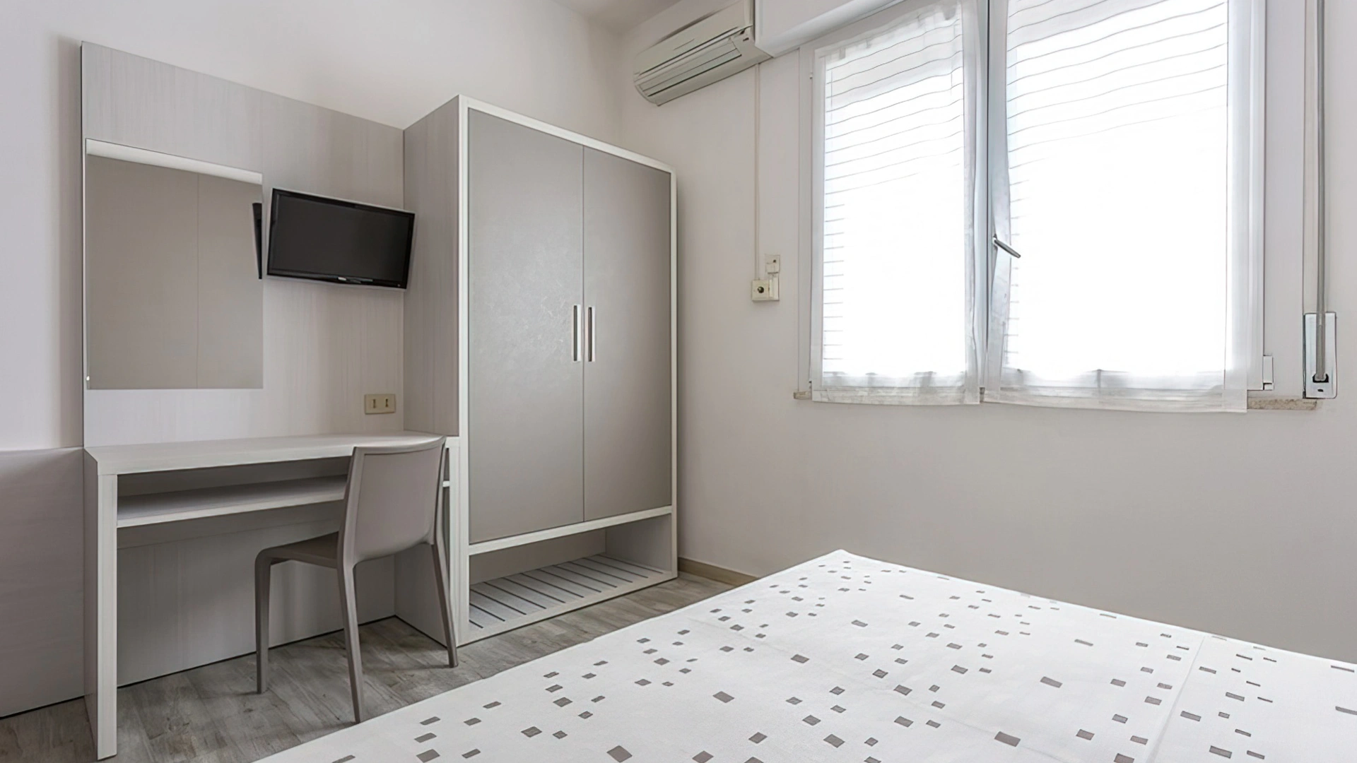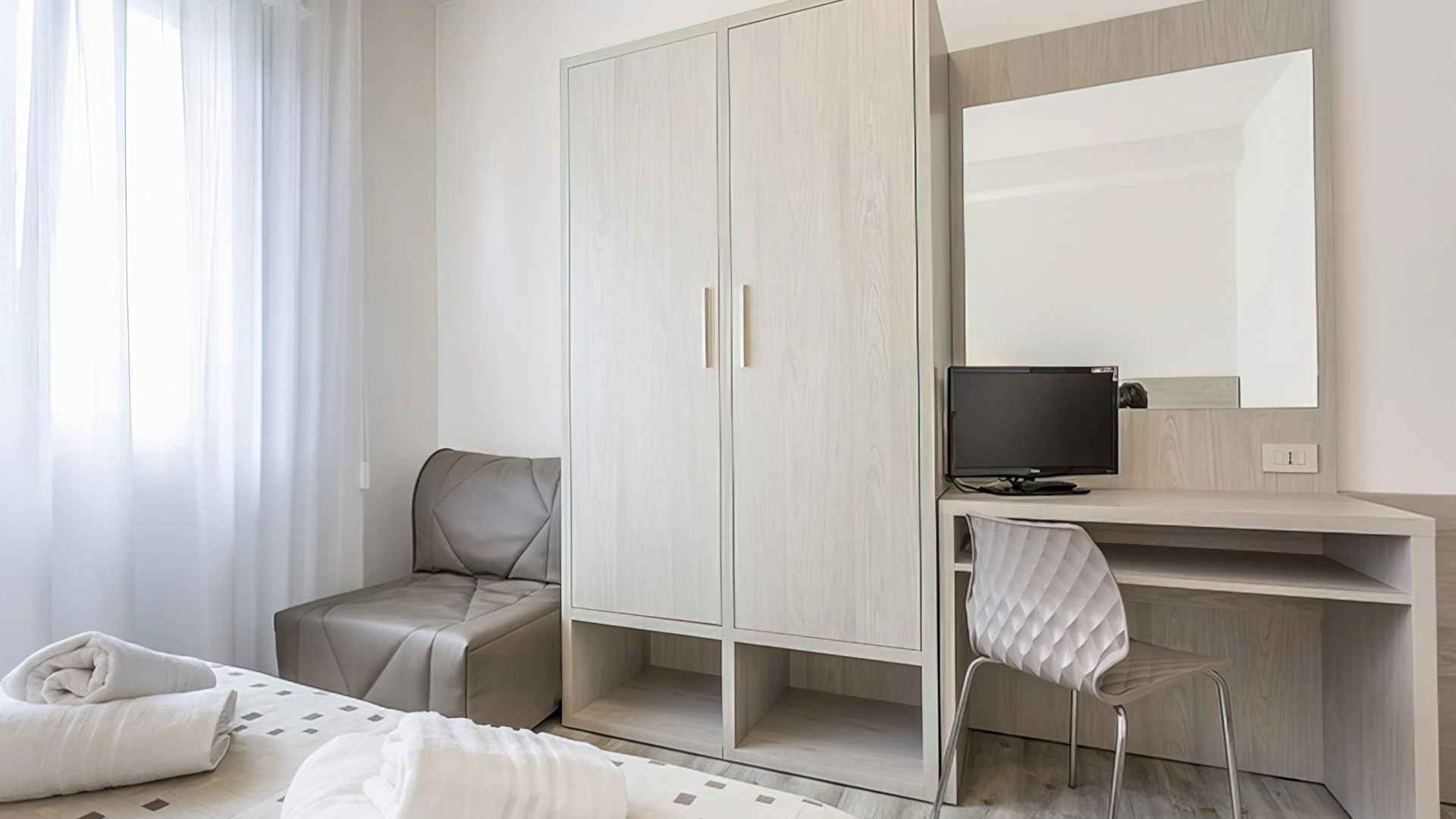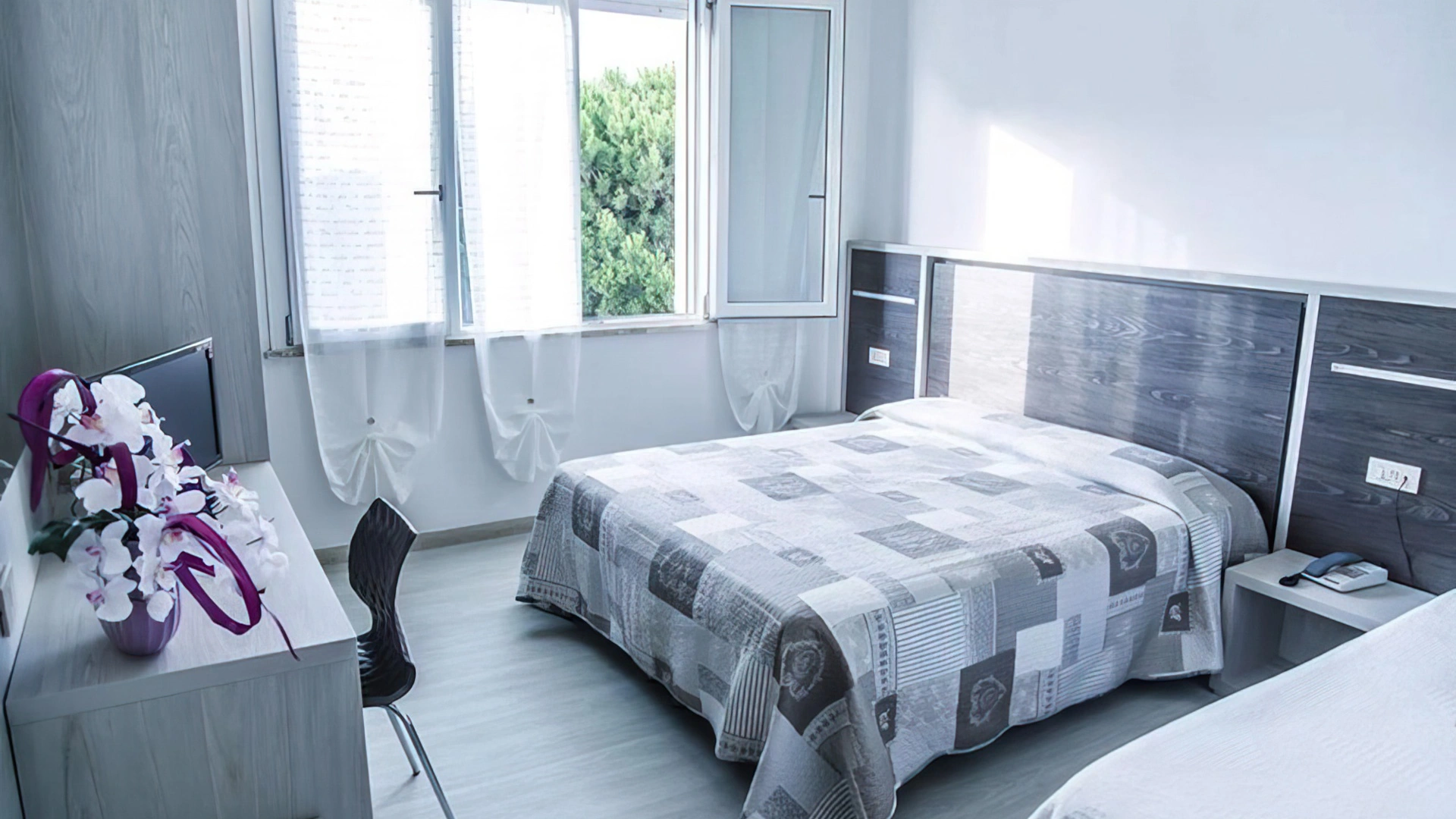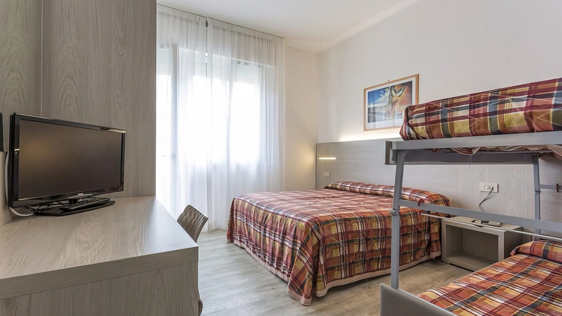 Le stanze sono dotate di balcone (nelle camere più grandi), TV a schermo piatto con canali sat, aria condizionata, telefono, cassaforte, Wi-Fi, servizi privati con box doccia, phon e set di cortesia. Si può scegliere tra varie tipologie di stanze: doppie, triple, quadruple o camere comunicanti. Tutte le stanze sono raggiungibili con l'ascensore; mentre solo in alcune è presente il frigobar.