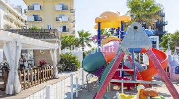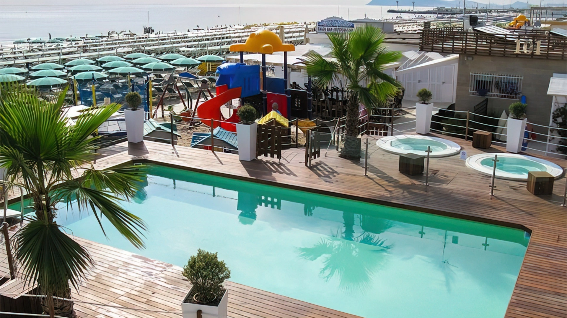 In spiaggia: animazione, area giochi, piscina per bimbi.