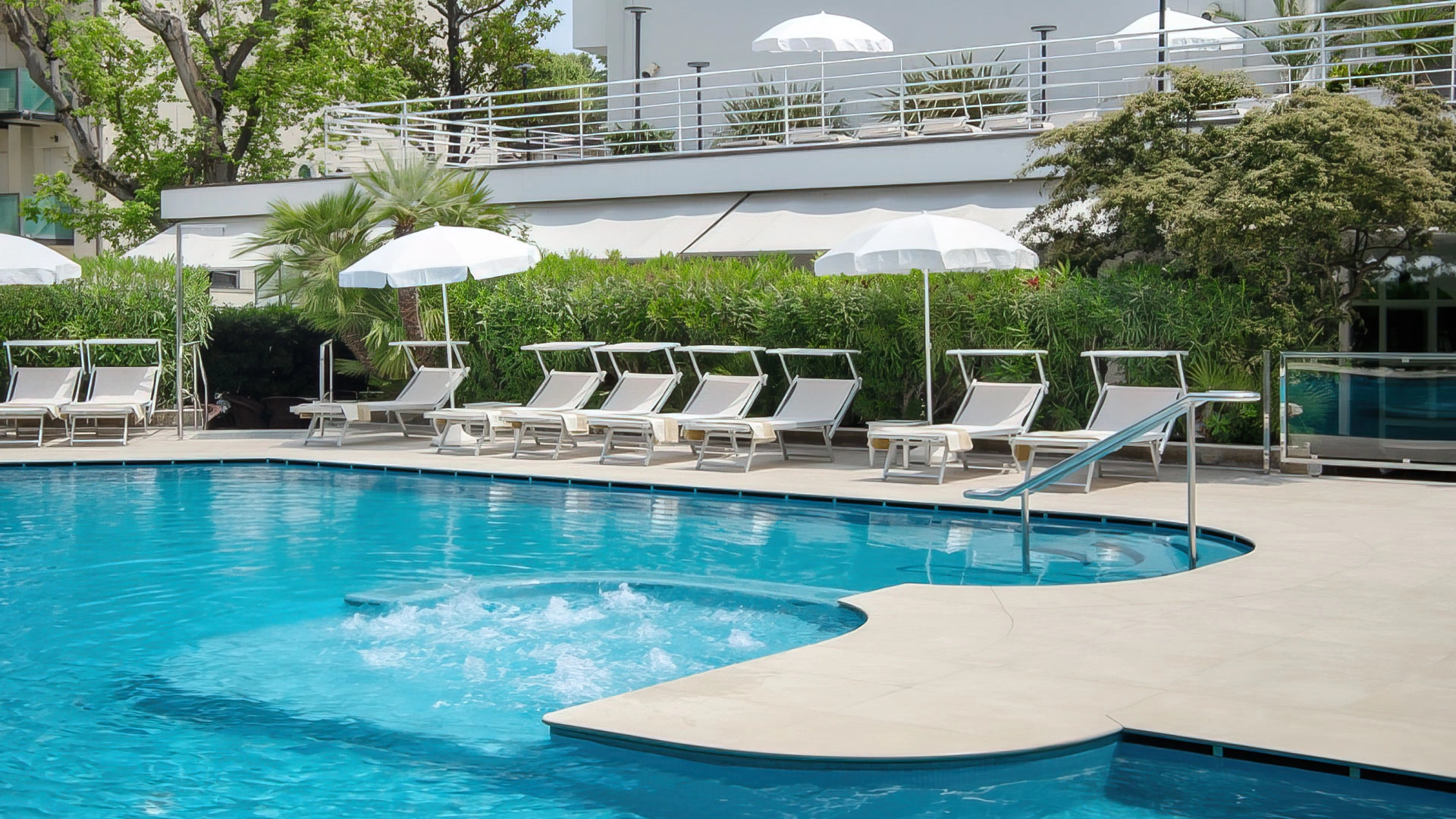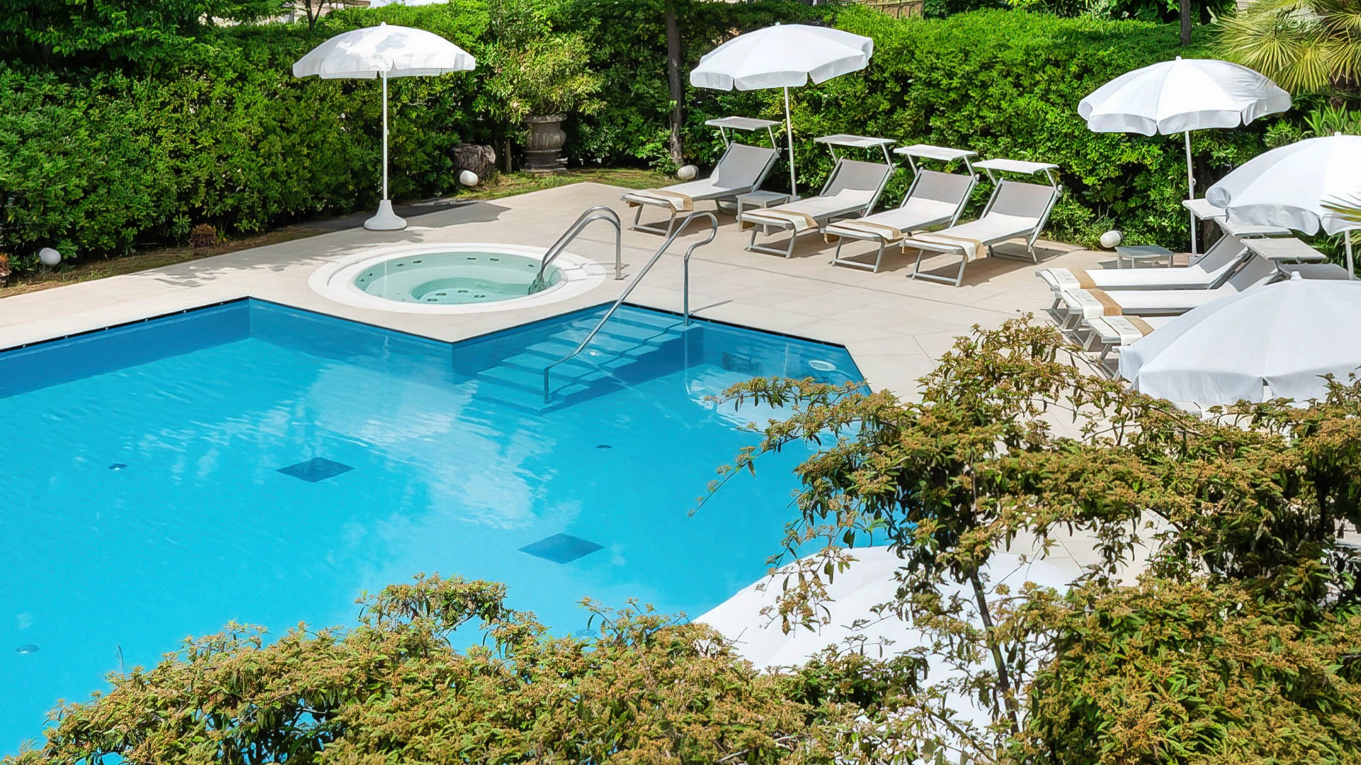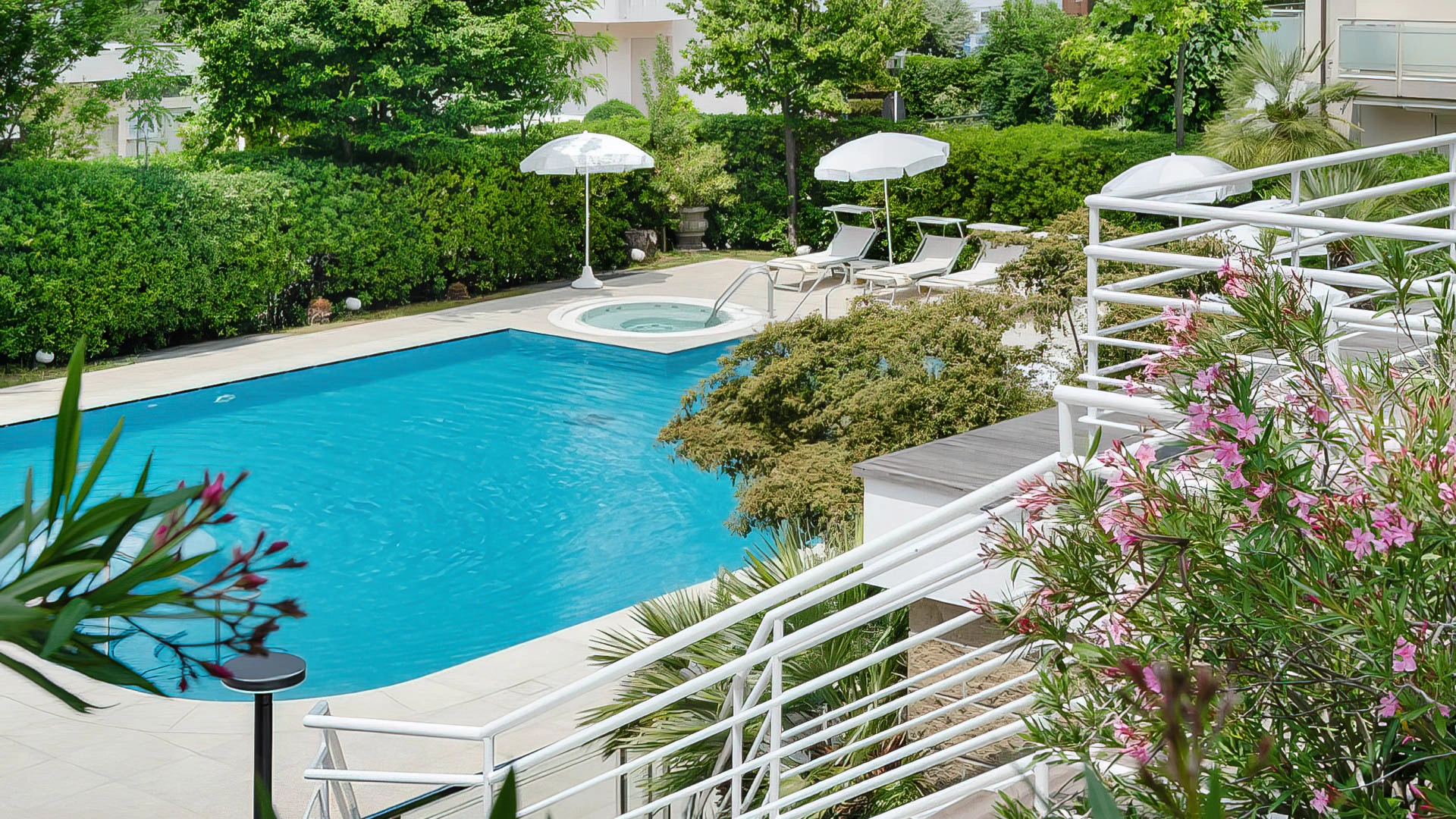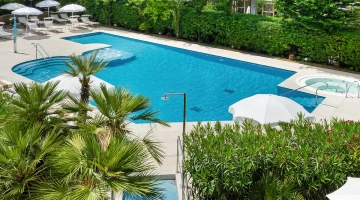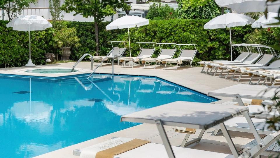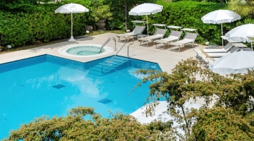 Il giardino ospita una grande piscina riscaldata con idromassaggio e vasca per bimbi, circondata da zona solarium con lettini e Wi-Fi area. Sempre in giardino sono presenti una vasca idromassaggio che può ospitare sino a 8 persone e una vasca bimbi.