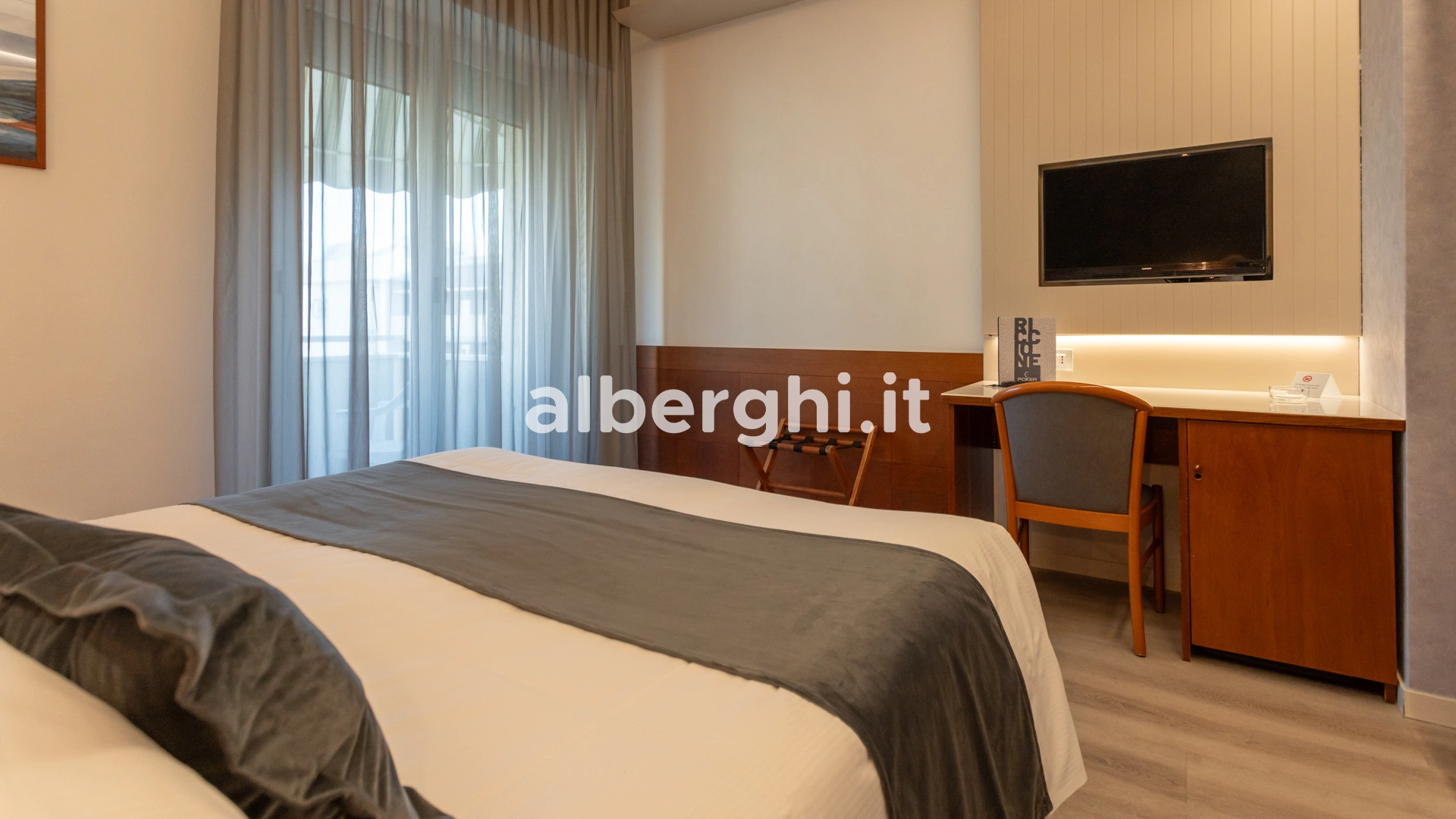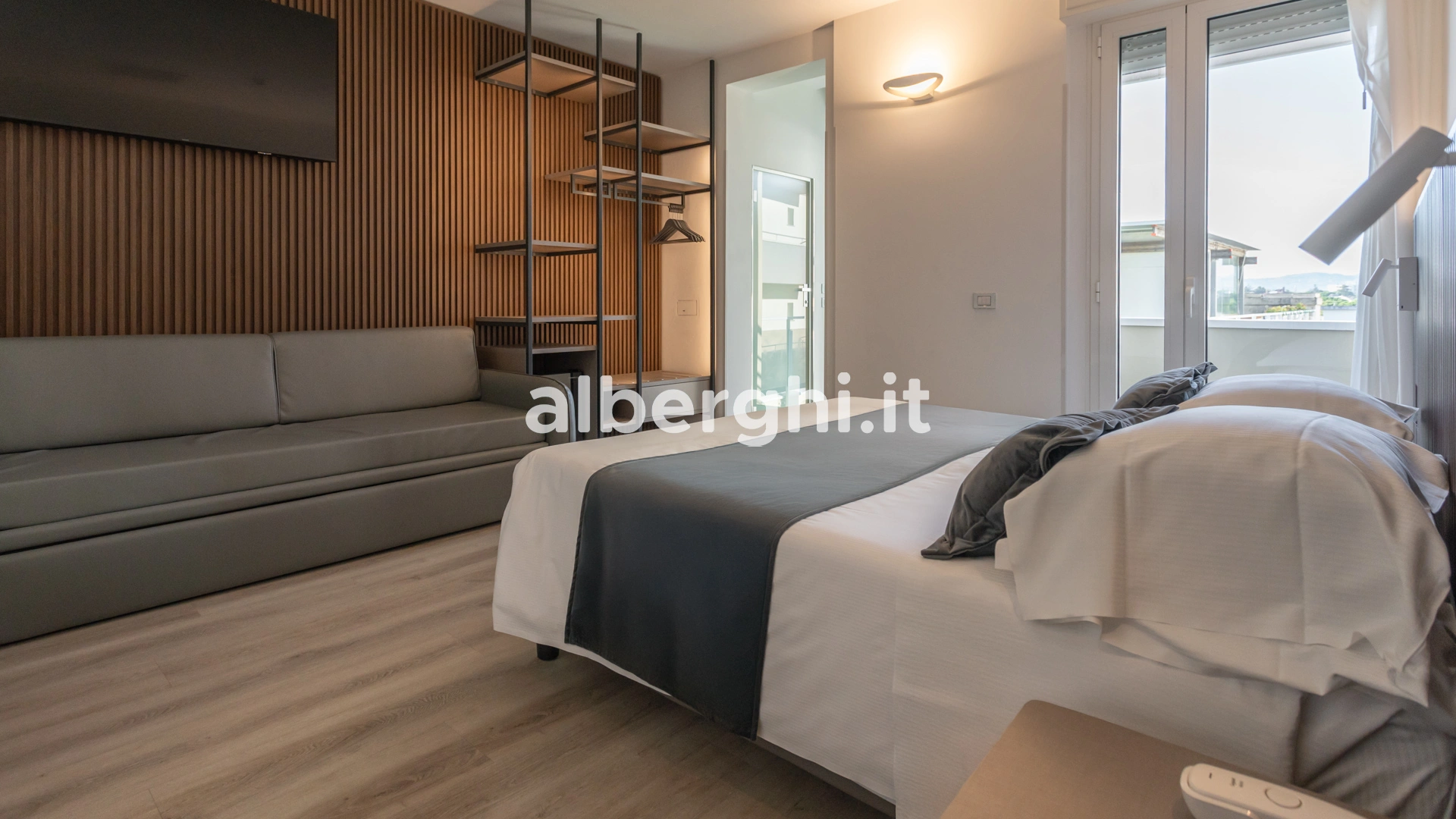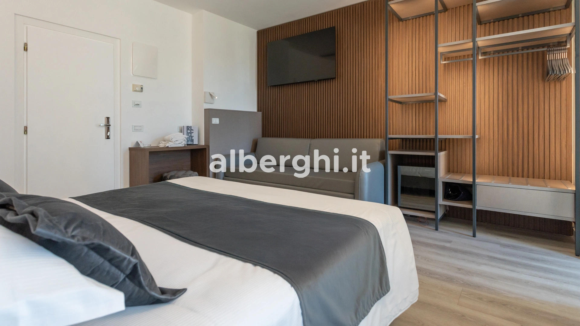 Le camere sono dotate di balcone, vista mare, aria condizionata, Wi-Fi fibra 100 Mbit/s, TV con canali sat, telefono, cassaforte, bagno con box doccia e phon. Il frigobar è rifornito solo d'acqua ed è disponibile a pagamento.