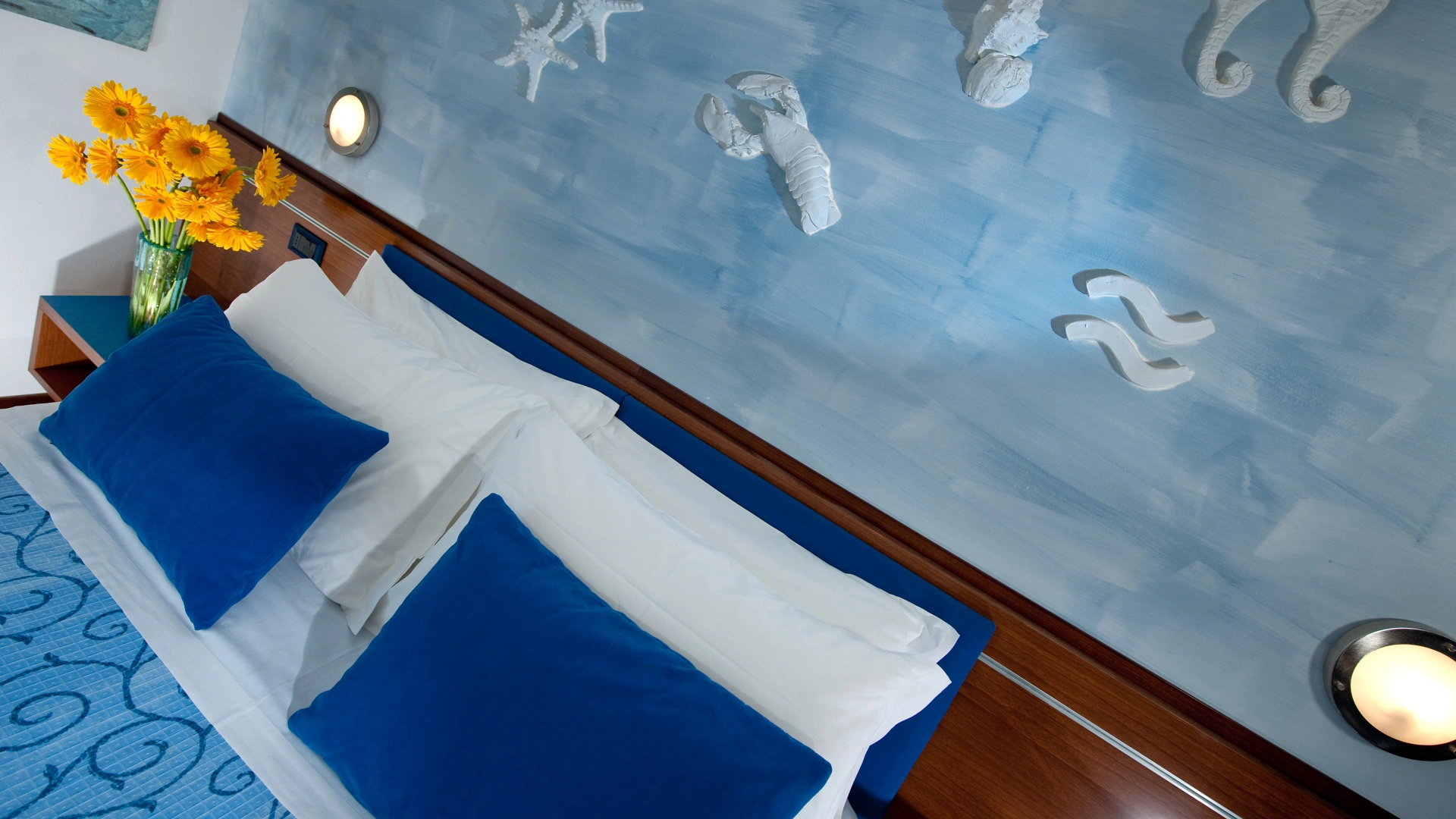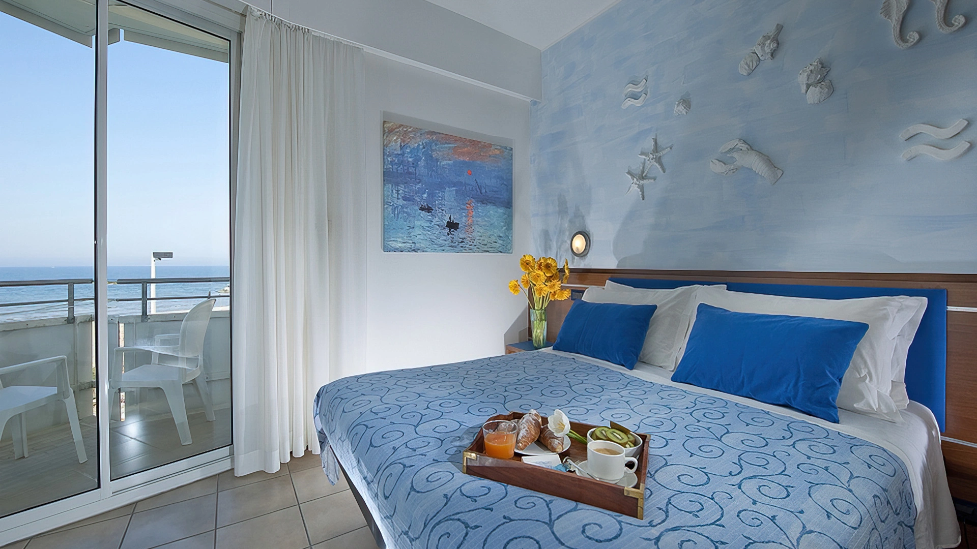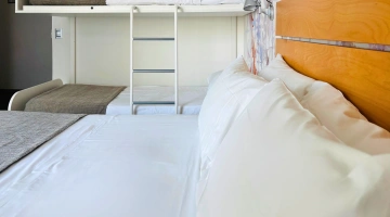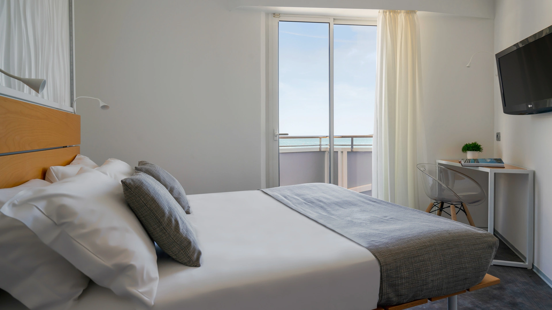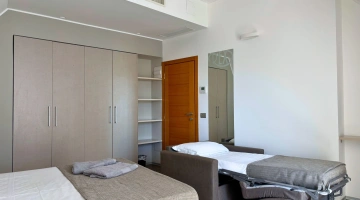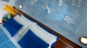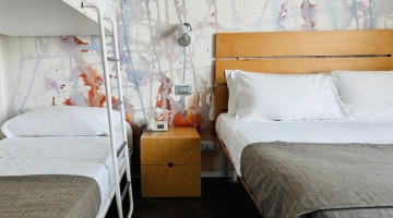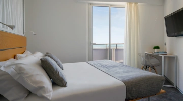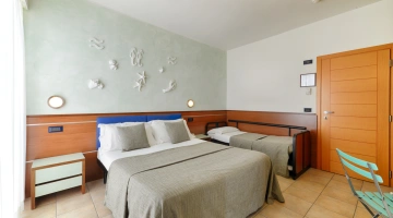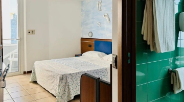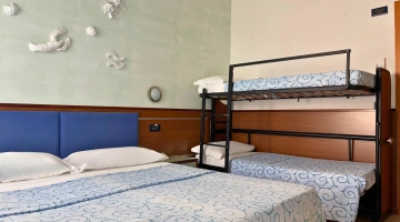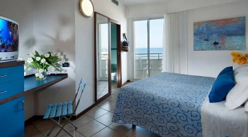 FIRST CLASS VISTA MARE: misurano 15-16 mq (letto singolo che diventa a castello) escluso il bagno (29-31 mq per la camere family-comunicanti) con balcone vista mare laterale o frontale (per le camere matrimoniali). Possono ospitare fino a 4 persone (8 per le camere family-comunicanti che dispongono di 2 bagni), set di cortesia e maggior comfort degli ambienti.