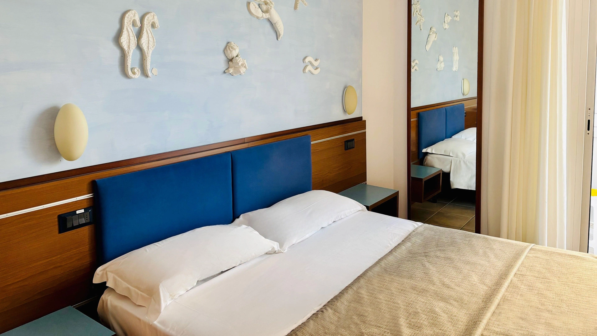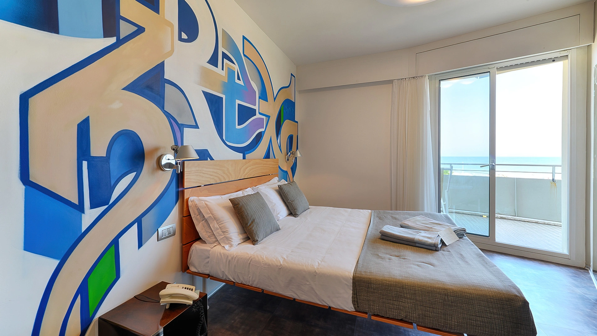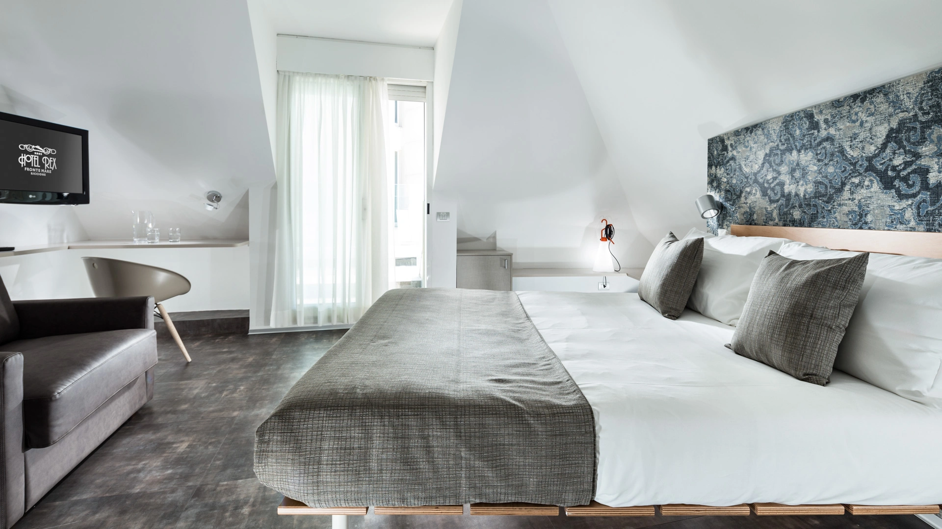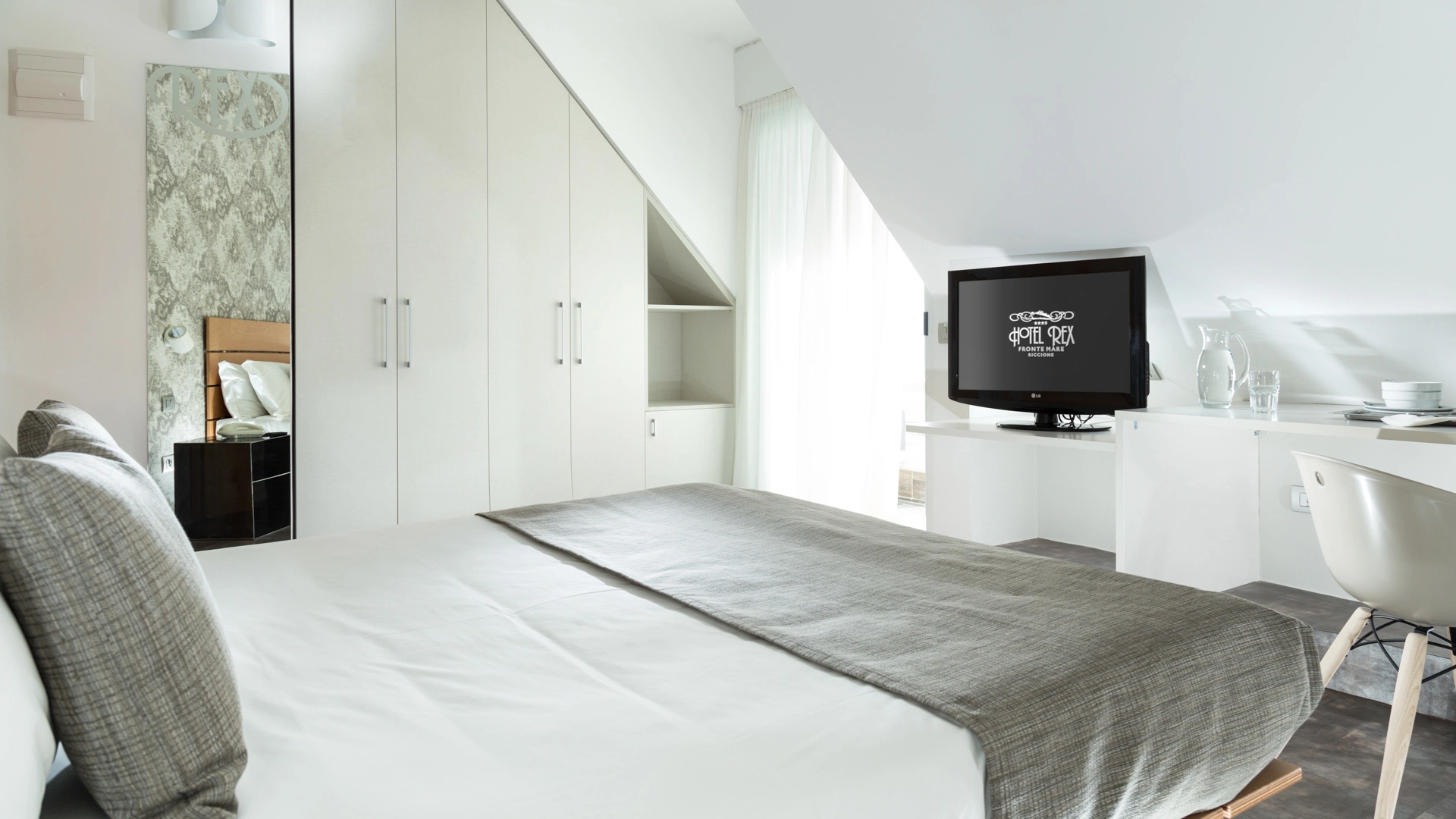 L’arredamento delle camere è ispirato all'immaginario felliniano e al tema marinaresco del Rex. Tutte sono dotate di balcone, la maggior parte con vista sul mare, TV sat LCD, Wi-Fi fibra 200 Mbit/s, aria condizionata, serranda elettrica, cassaforte, telefono, frigobar, drink di benvenuto, bagno con box doccia.