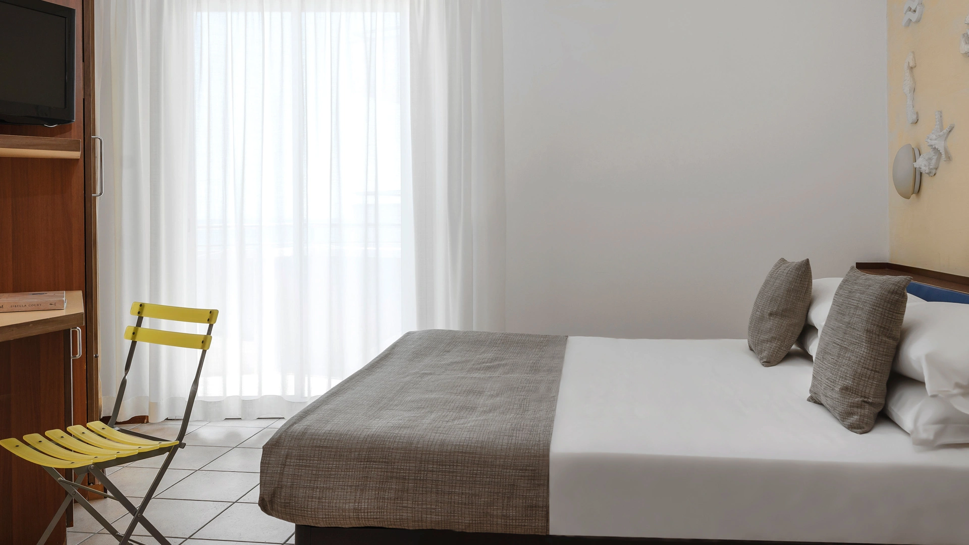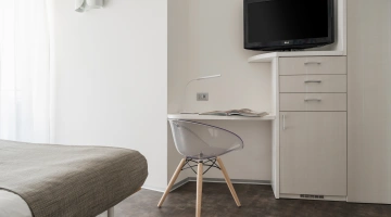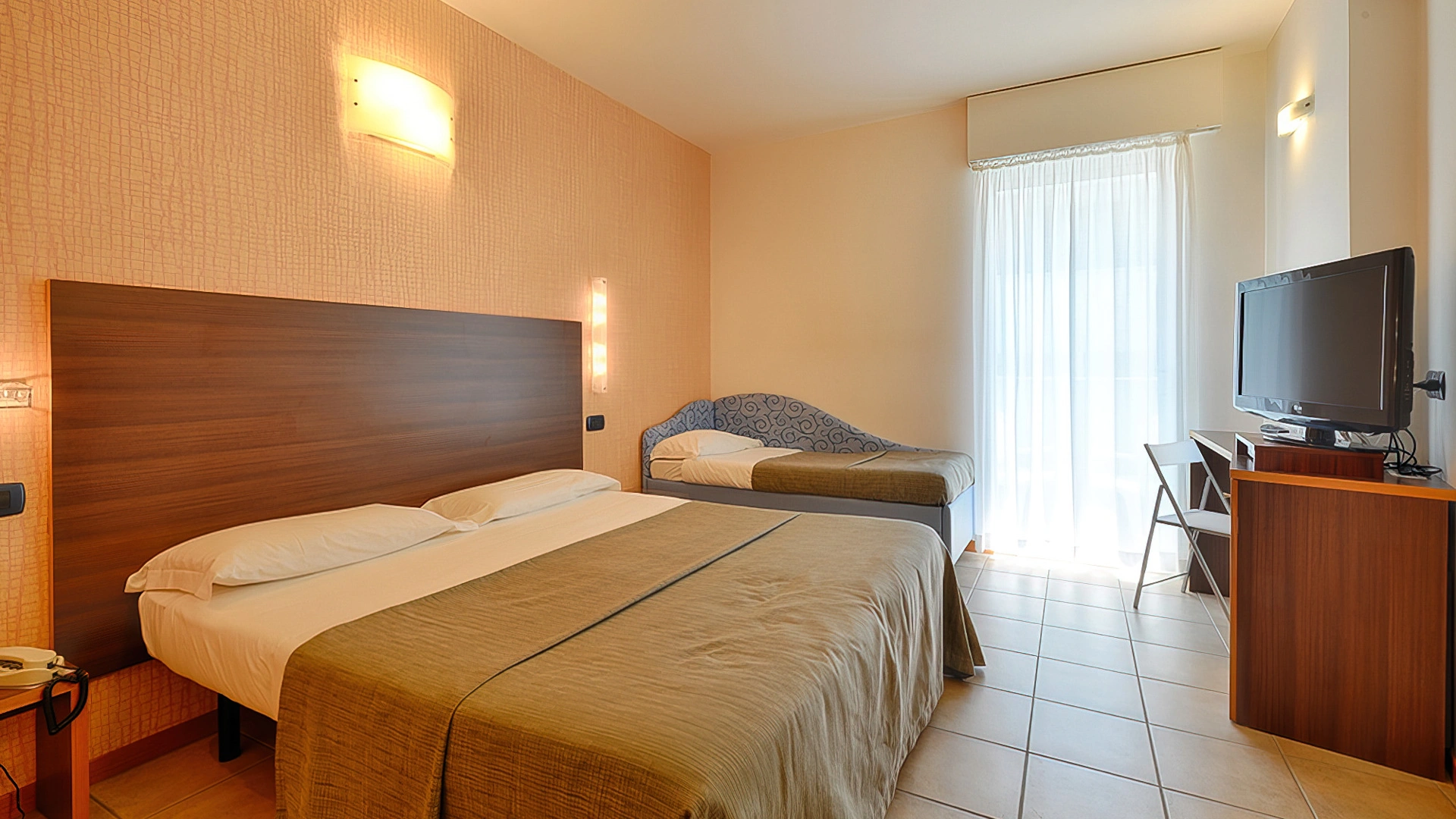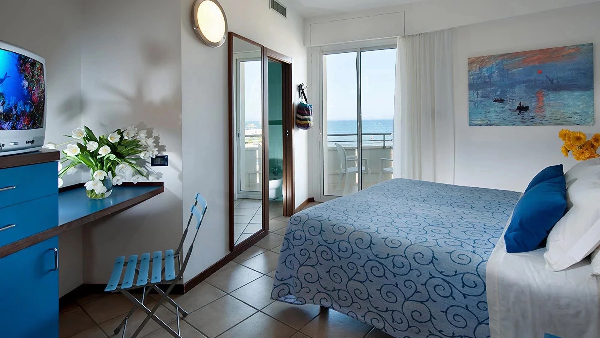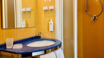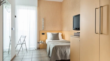 TOURIST CLASS SENZA VISTA MARE: misurano 14-16 mq (escluso il bagno), max 4 persone (letto singolo che diventa a castello), balcone senza vista mare, riassetto pomeridiano della camera, TV sat LCD 32".