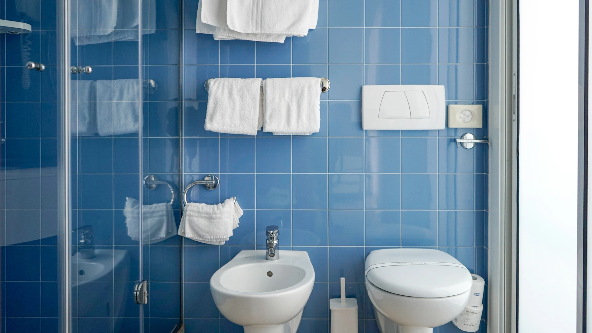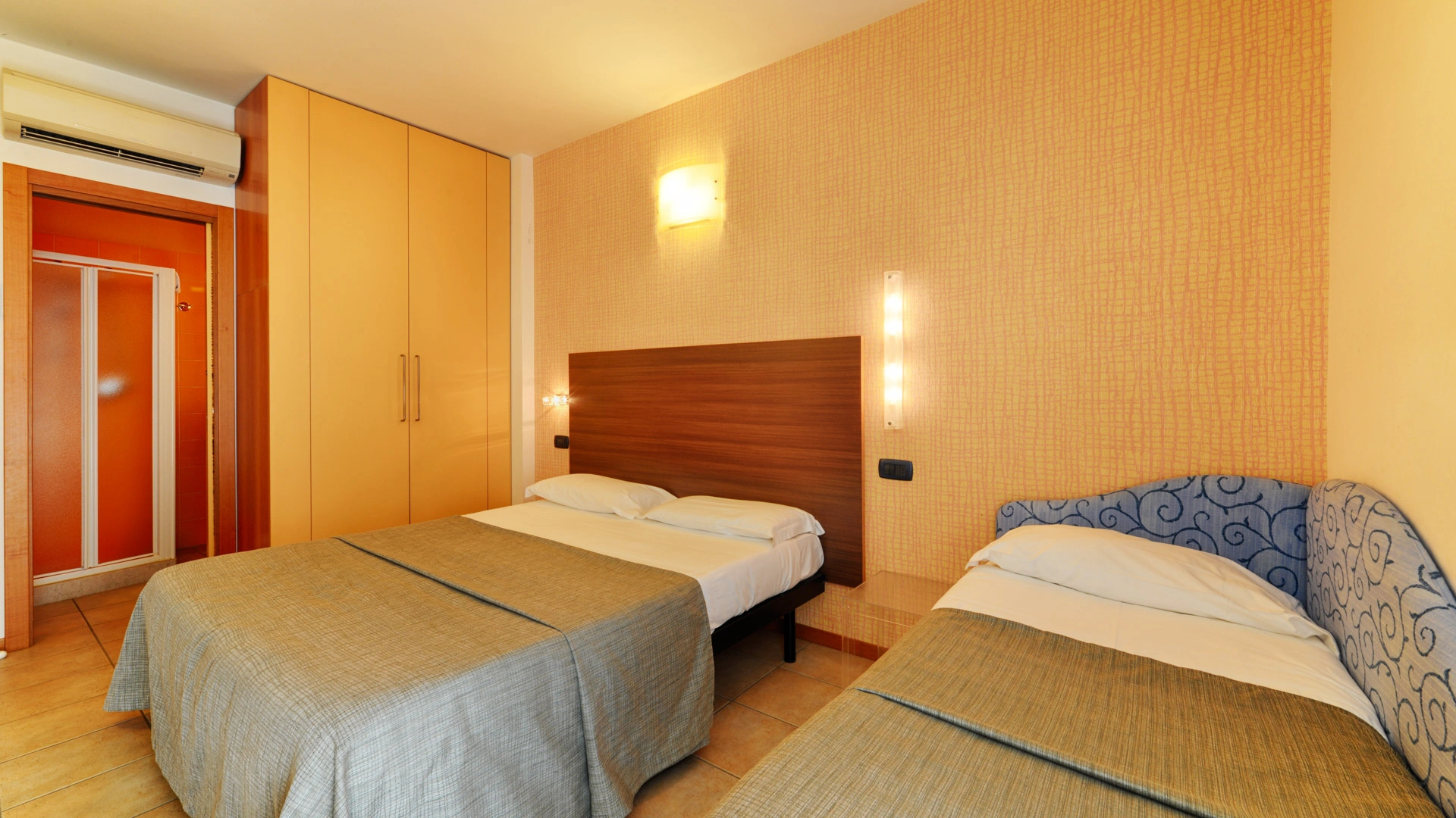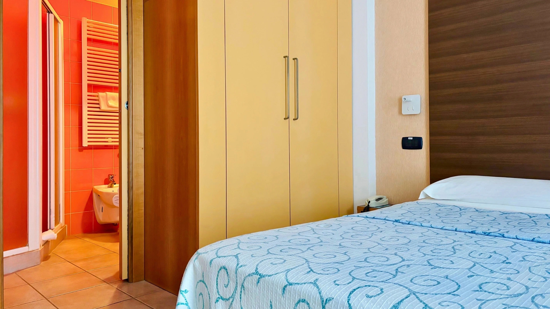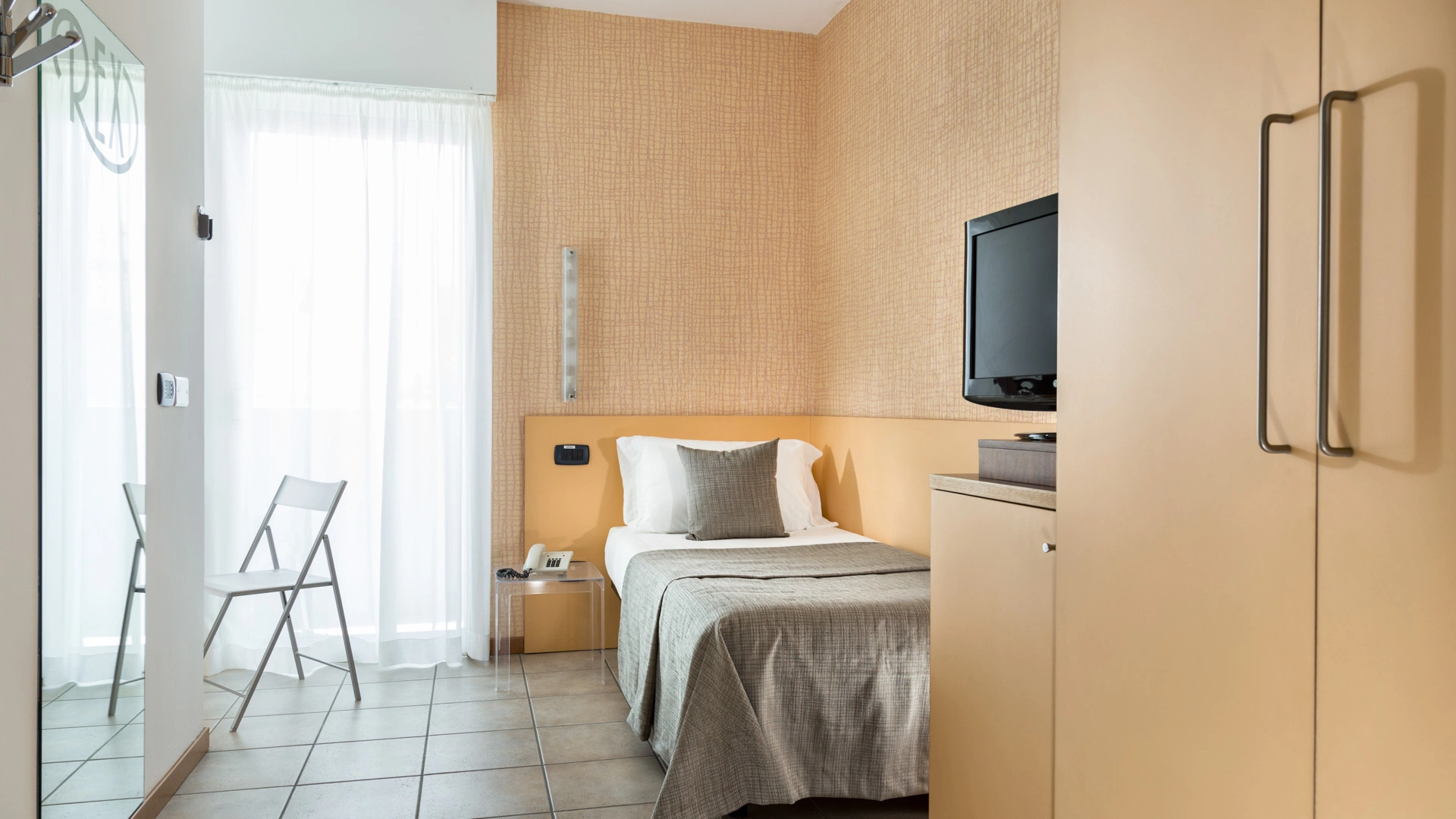 TOURIST CLASS SENZA VISTA MARE: misurano 14-16 mq (escluso il bagno), max 4 persone (letto singolo che diventa a castello), balcone senza vista mare, riassetto pomeridiano della camera, TV sat LCD 32".