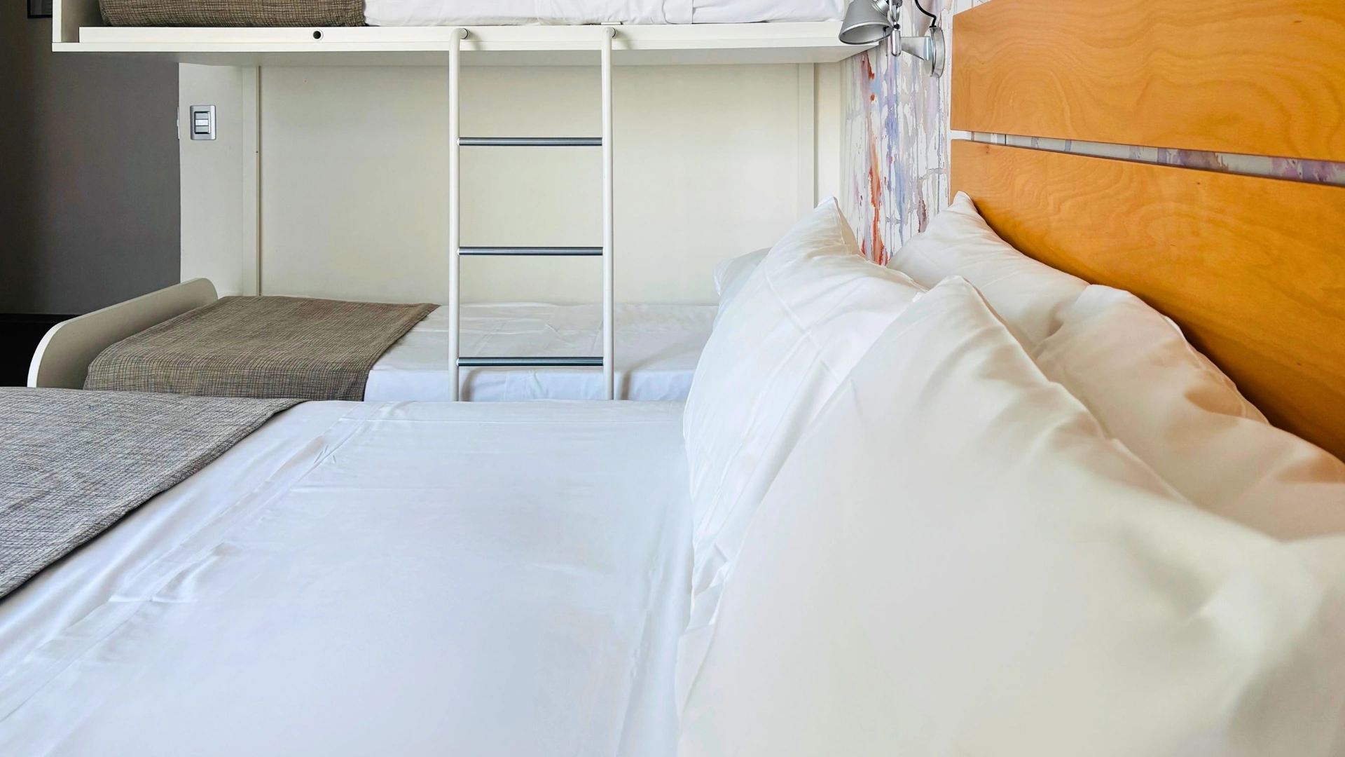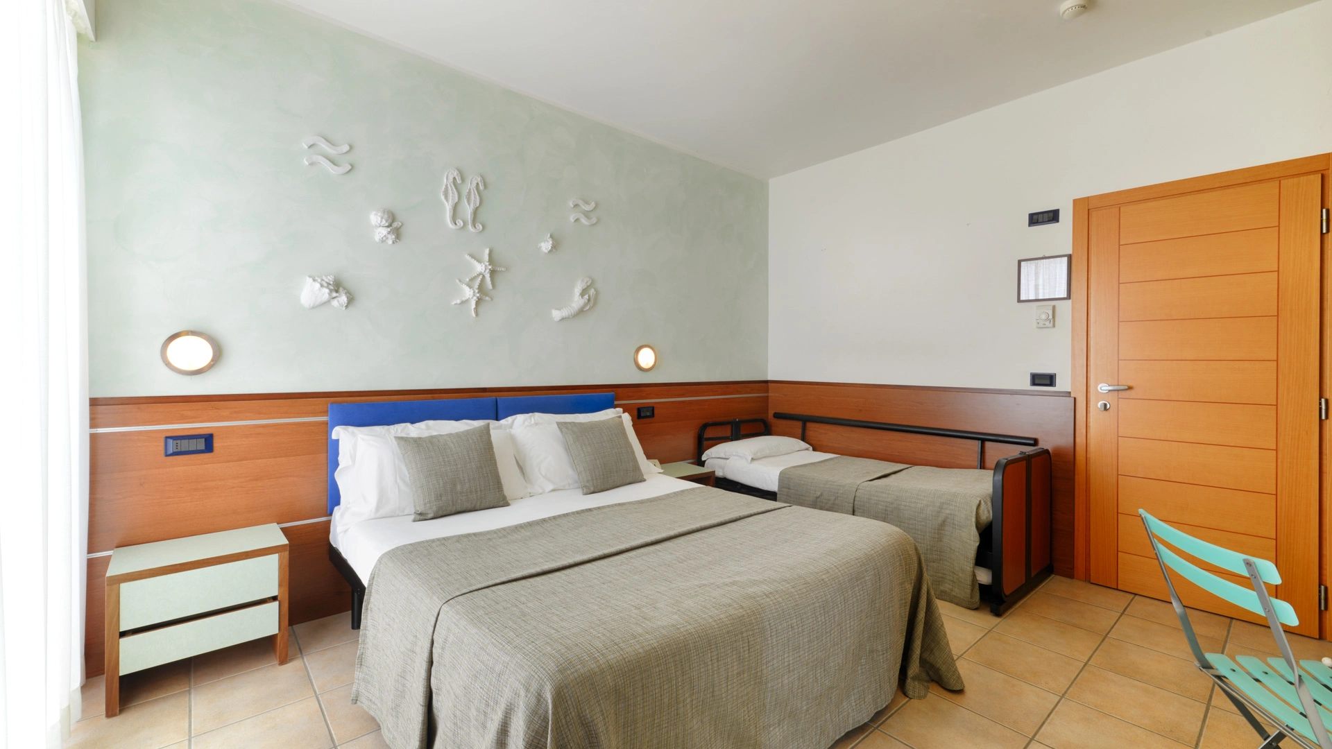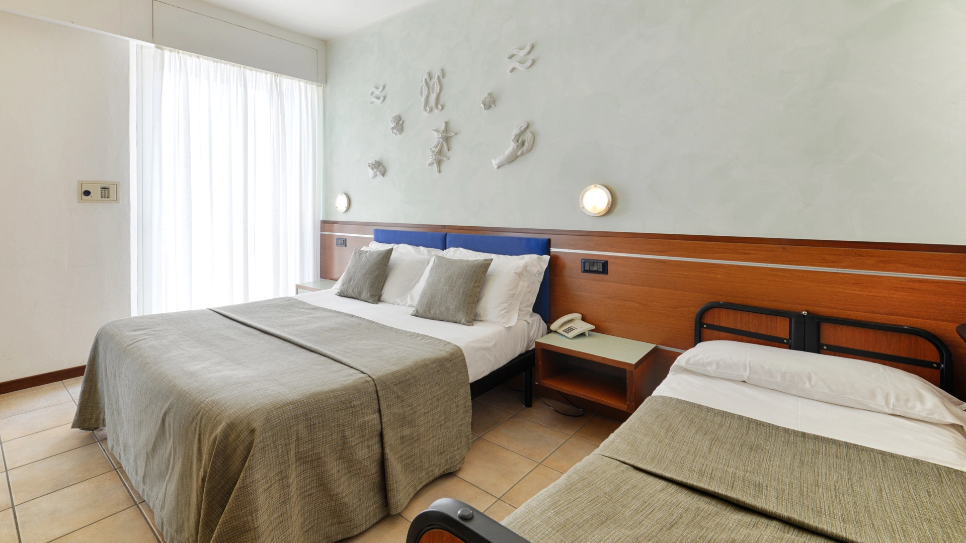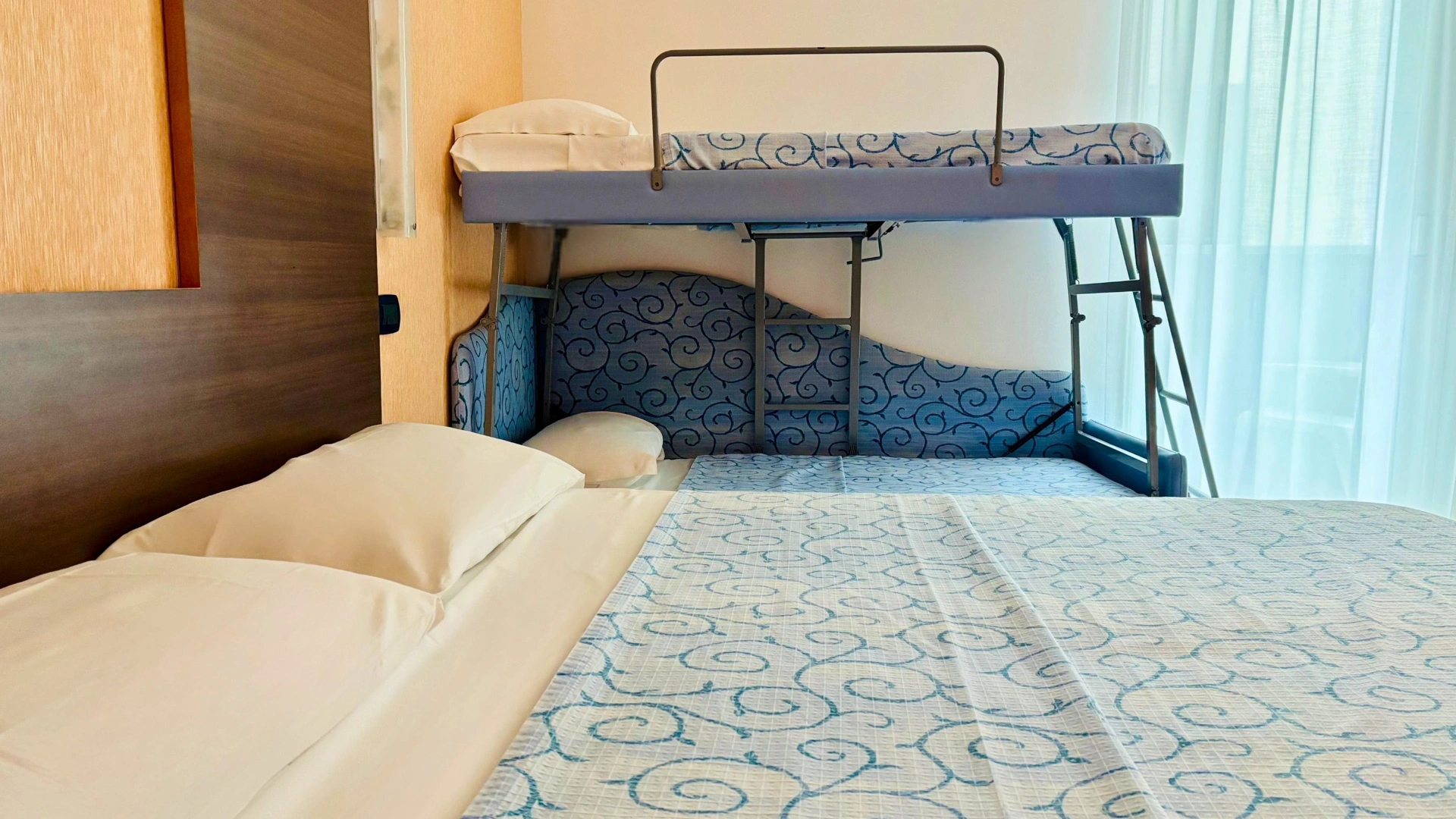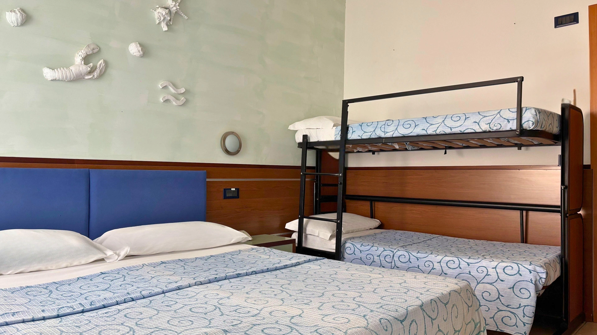 TOP CLASS: camere di qualità superiore con un'ottima vista mare e tanti servizi in più, misurano 15-20 mq (letto singolo che diventa a castello, comodo anche per gli adulti) escluso il bagno (32 mq per la camere family-comunicanti). Sono inclusi: accappatoio, bollitore in camera con te e tisane, quotidiano preferito tutte le mattine, telo mare in omaggio (minimo 6 giorni), caffetteria e bibite analcoliche gratuite al bar dell’albergo.